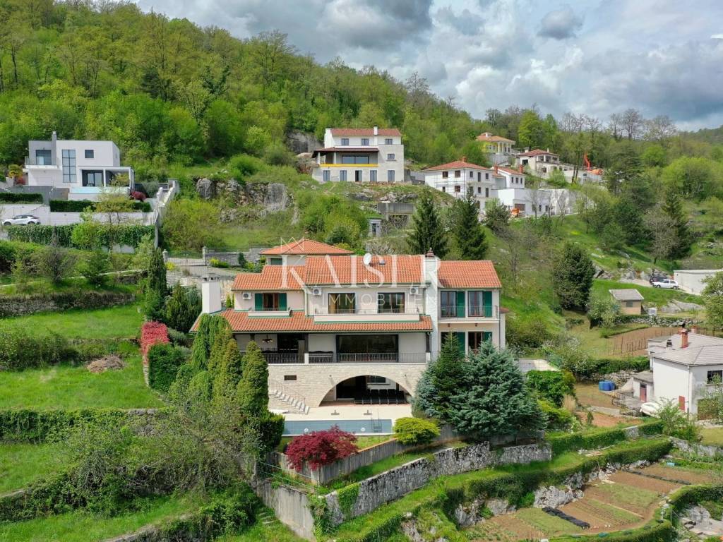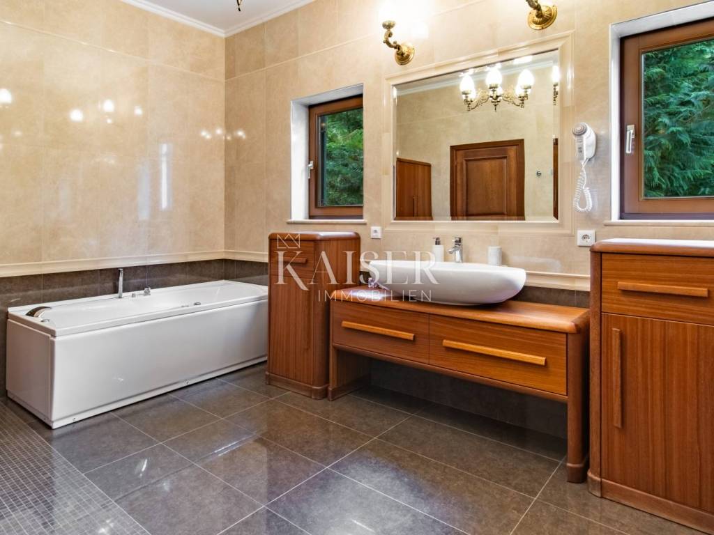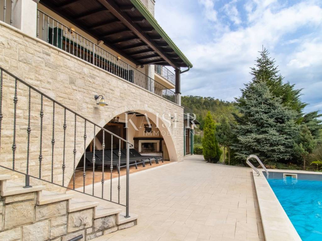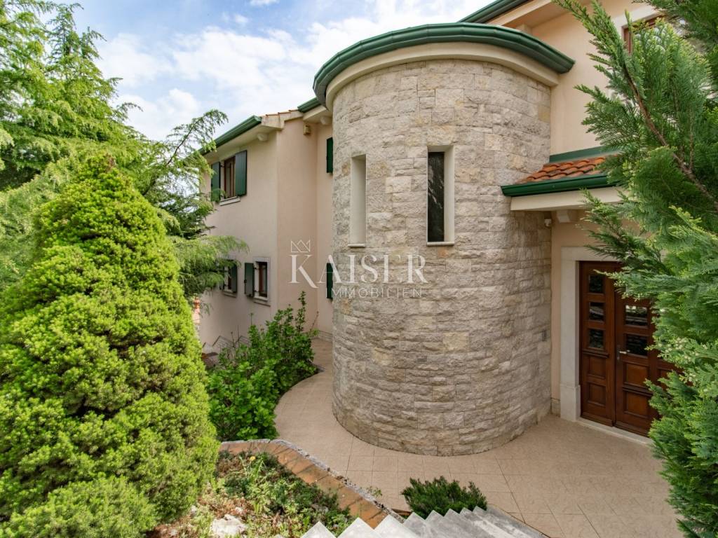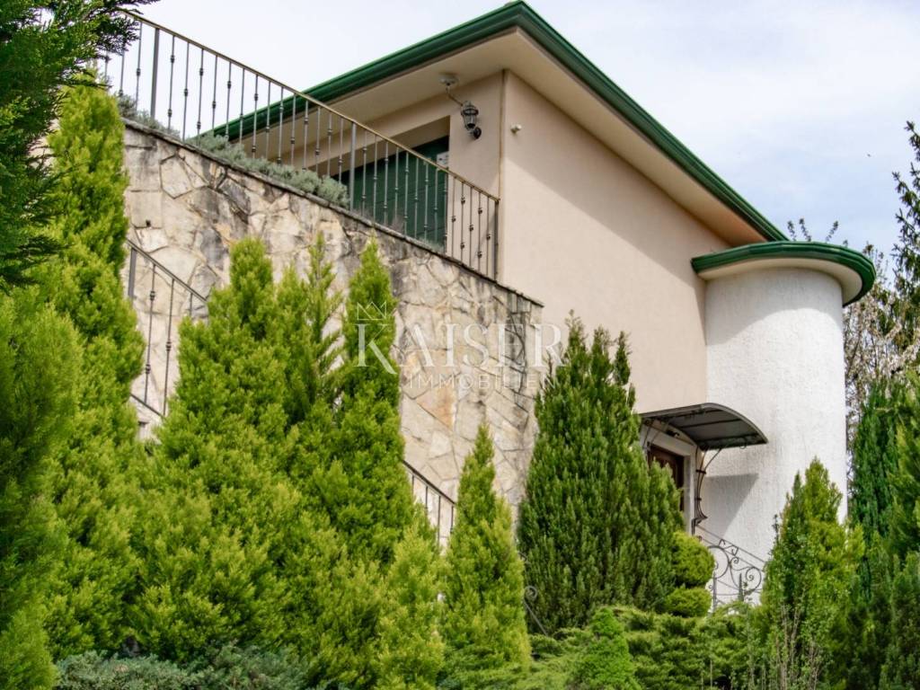 Below the slopes of Učka gora, surrounded by the nature park Lisinska šuma, on several natural terraces with a view towards the sea, is the villa property presented to you by Kaiser-immobilien Opatija. A luxuriously furnished villa on three floors with a garage, a swimming pool, two large outdoor grills, sheltered by a natural hedge and the natural slope of the terrain on an area of 1400 m2, offers comfort, peace and an open view of the sea. Upon entering the ground floor of the villa, a large area of the living room, dining room and kitchen opens in front of us, with an exit from each room to the terrace facing the sea, where there is an outdoor grill, with a large table for family and other gatherings. The living room, which is open and spacious, is dominated by a crocodile leather sofa with a Persian carpet. On the same floor, there is a master bedroom with a dressing room and a large bathroom belonging to it. There are two additional rooms on the same floor. Upstairs there are 4 bedrooms, each with its own bathroom, kitchen and living room. All rooms have a sea view and access to the terrace. In the basement there is a large room for social gatherings, a massage room, a Finnish sauna, a bathroom with a shower, a study room with an auxiliary area, a home cinema equipped with the highest quality speakers and armchairs for enjoyment and relaxation, as well as a room - a wine cellar with a natural temperature for preserving wine and food. The space is connected to a terrace, an outdoor grill and a swimming pool. The grounds of the villa are ennobled and maintained with Mediterranean plants and greenery. The garage, which is at the height of the first floor, has a freight elevator that can be used to go down to the entrance to the villa. The villa for enjoyment and rest is only a 10-minute drive from Opatija and the first beaches for swimming. Opatija and Matulji center ten minutes by car, Rijeka approx. 30 minutes, Trieste approx. 1h, 30 min, Zagreb approx. 1h, 30 min, Ljubljana approx. 2 h, Krk airport approx. 50 min. For additional information and a tour, contact your agent: Eli Lovko, mob: 0916133776; eli@kaiser-immobilien.hr Agency commission is 3% + VAT