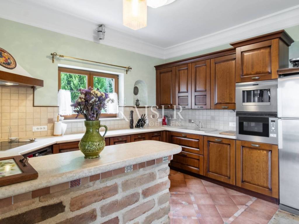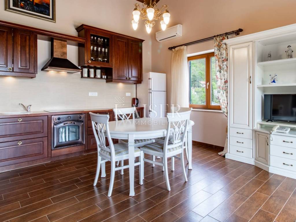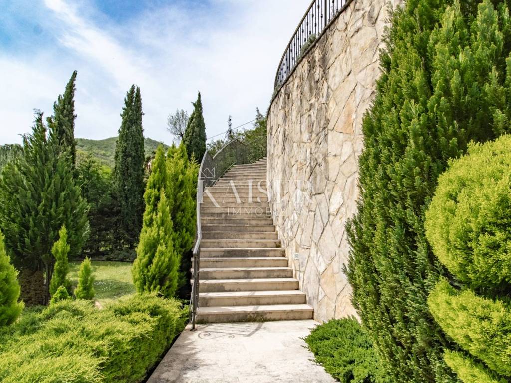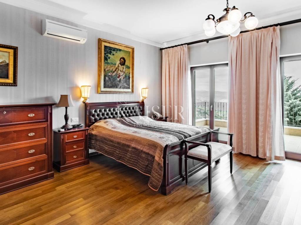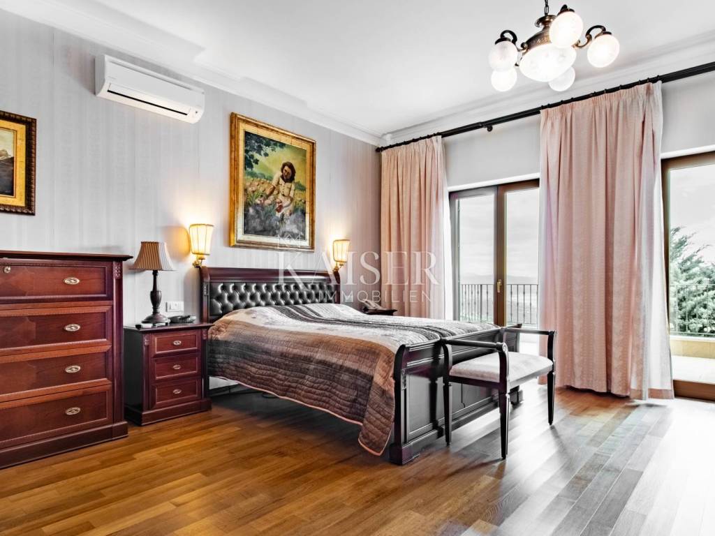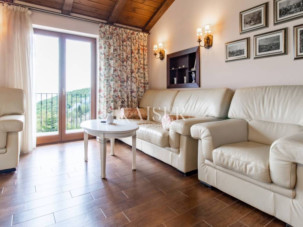 Below the slopes of Učka gora, surrounded by the nature park Lisinska šuma, on several natural terraces with a view towards the sea, is the villa property presented to you by Kaiser-immobilien Opatija. A luxuriously furnished villa on three floors with a garage, a swimming pool, two large outdoor grills, sheltered by a natural hedge and the natural slope of the terrain on an area of 1400 m2, offers comfort, peace and an open view of the sea. Upon entering the ground floor of the villa, a large area of the living room, dining room and kitchen opens in front of us, with an exit from each room to the terrace facing the sea, where there is an outdoor grill, with a large table for family and other gatherings. The living room, which is open and spacious, is dominated by a crocodile leather sofa with a Persian carpet. On the same floor, there is a master bedroom with a dressing room and a large bathroom belonging to it. There are two additional rooms on the same floor. Upstairs there are 4 bedrooms, each with its own bathroom, kitchen and living room. All rooms have a sea view and access to the terrace. In the basement there is a large room for social gatherings, a massage room, a Finnish sauna, a bathroom with a shower, a study room with an auxiliary area, a home cinema equipped with the highest quality speakers and armchairs for enjoyment and relaxation, as well as a room - a wine cellar with a natural temperature for preserving wine and food. The space is connected to a terrace, an outdoor grill and a swimming pool. The grounds of the villa are ennobled and maintained with Mediterranean plants and greenery. The garage, which is at the height of the first floor, has a freight elevator that can be used to go down to the entrance to the villa. The villa for enjoyment and rest is only a 10-minute drive from Opatija and the first beaches for swimming. Opatija and Matulji center ten minutes by car, Rijeka approx. 30 minutes, Trieste approx. 1h, 30 min, Zagreb approx. 1h, 30 min, Ljubljana approx. 2 h, Krk airport approx. 50 min. For additional information and a tour, contact your agent: Eli Lovko, mob: 0916133776; eli@kaiser-immobilien.hr Agency commission is 3% + VAT