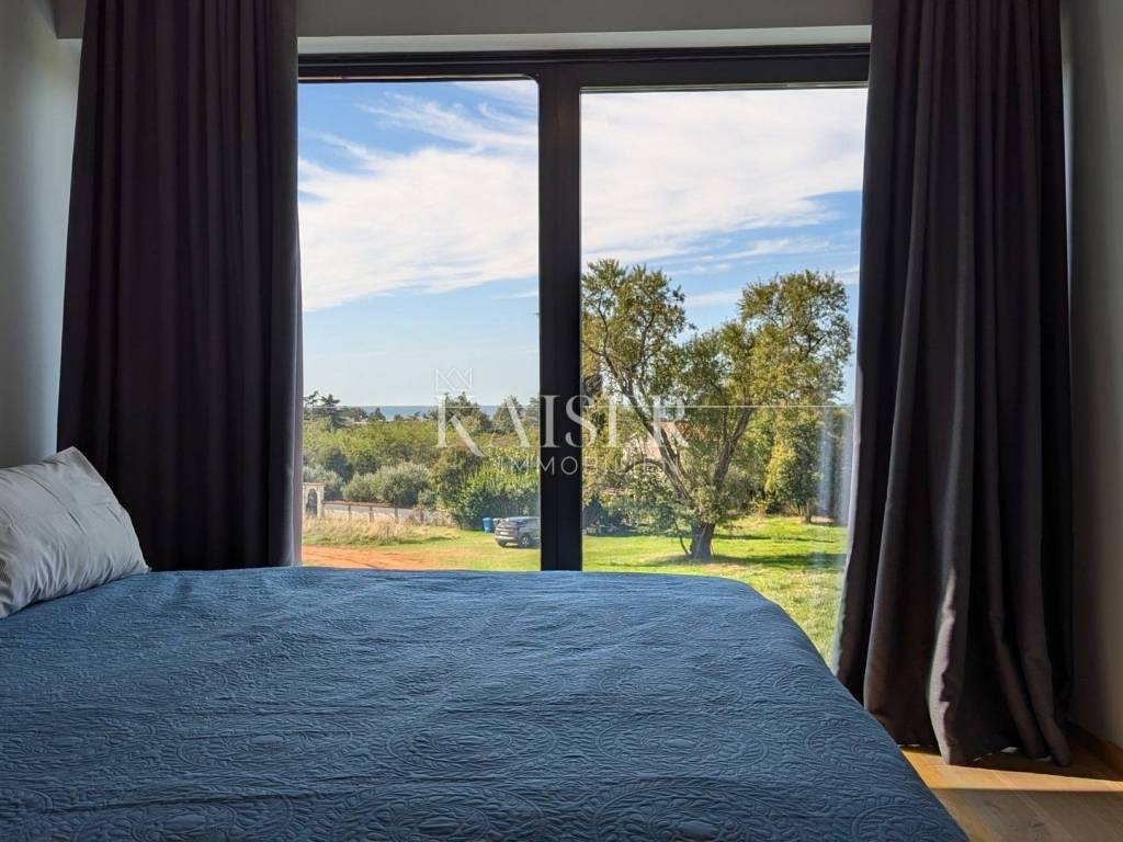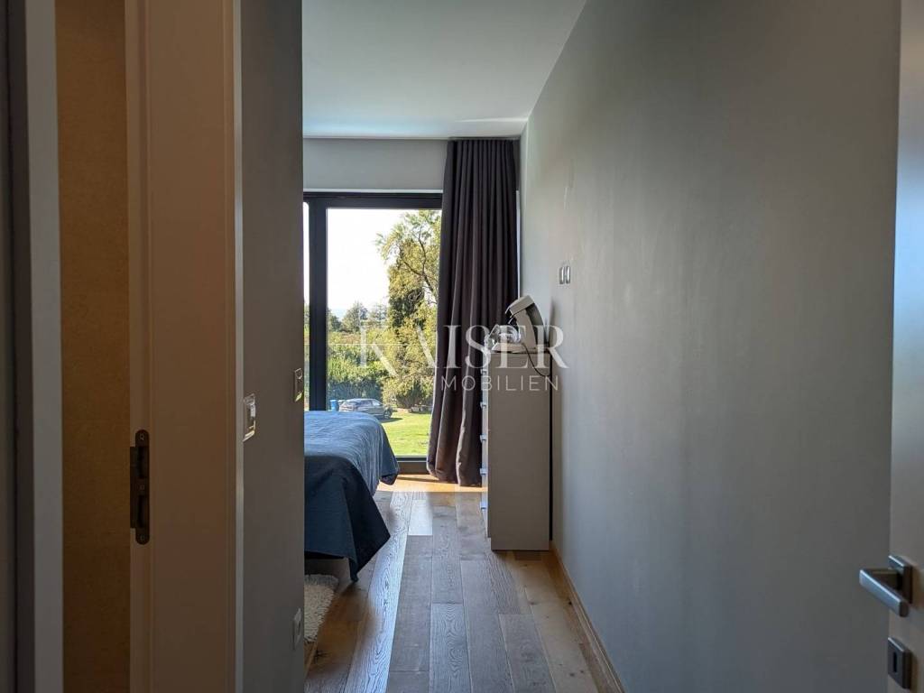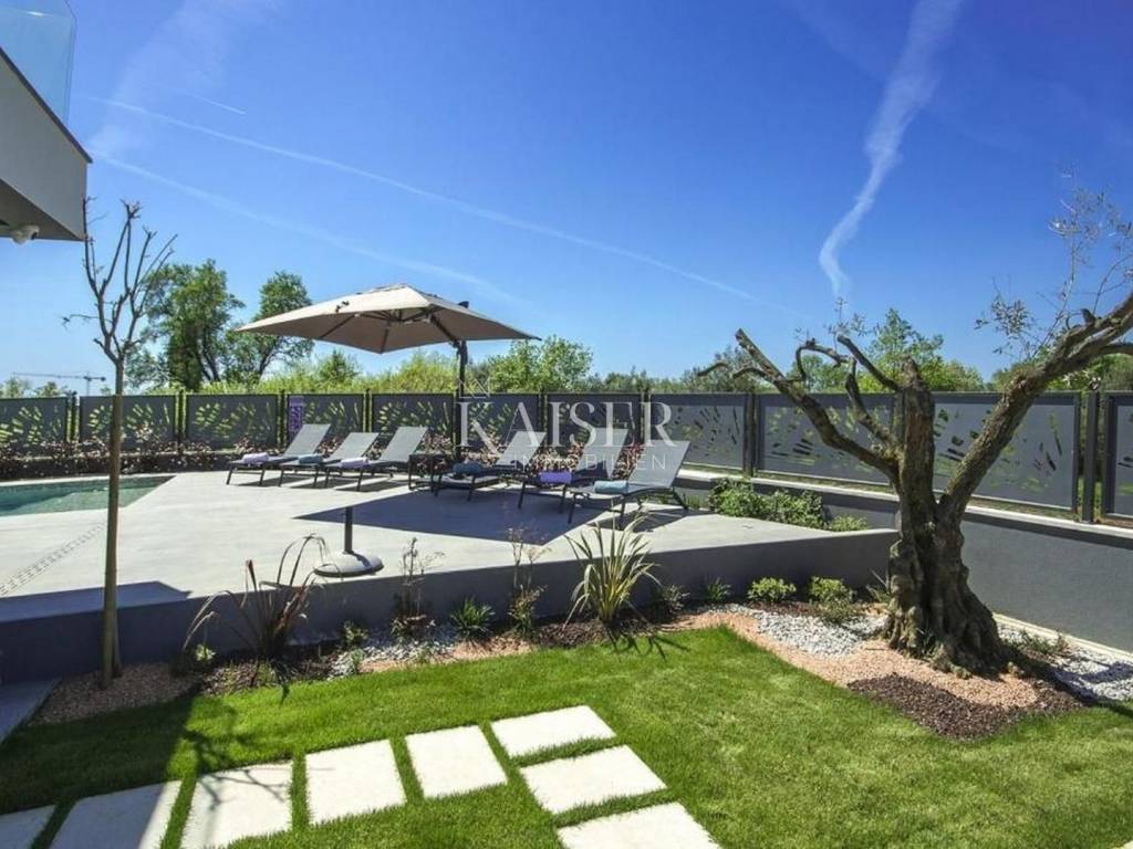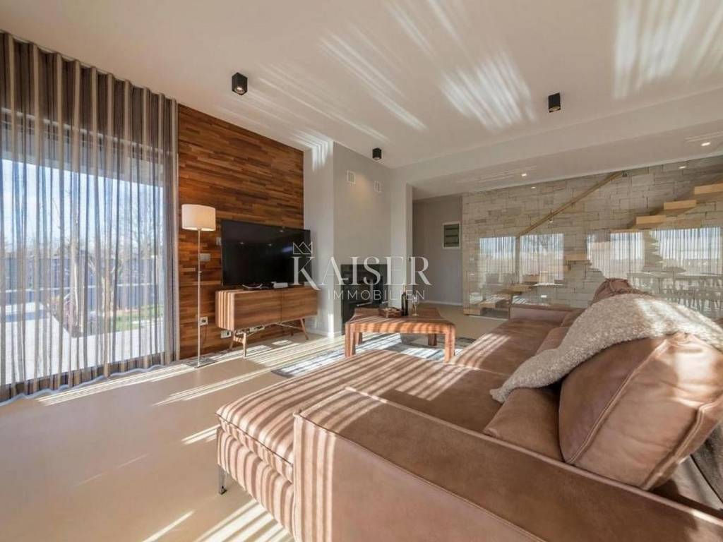 Kaiser Immobilien offers for sale a unique opportunity, a luxurious and furnished villa with a swimming pool and sauna in a top location in the city of Poreč. The villa is only 500 m from the sea and the first beaches, on the border of the green belt with a beautiful view of the sea and the nature around it. It is located in a part of the city of Poreč only 1 km from the center, and close to all the necessary amenities for life. This villa, with the possibility of renting, due to its extraordinary location, primarily offers a luxurious and comfortable life in a great location in a beautiful settlement. The villa is adorned with a unique modern look, a very beautiful architectural design with a combination of modern and rustic lines. In addition to the beautiful shape, the special feature that makes it stand out is certainly the addition of stone and wooden elements, all of which is surrounded by glass railings with special lighting fixtures that make the villa luxurious and modern. What left an impression on me, in addition to all of the above, is the light that penetrates the space throughout the day, because the concept of the villa is oriented in such a way that throughout the day the villa absorbs a lot of sunlight, which gives you a pleasant feeling in every room you are in. The villa consists of a ground floor and first floor, and a spa area in the basement of the villa. On the ground floor of the villa there is a living room, kitchen and dining room and a guest toilet. The entire concept of the villa is based on an open space system and offers you a beautiful view of the pool and garden from all rooms through large glass walls. On the first floor of the villa there are three bright bedrooms with their own bathrooms and exits to the balcony where there is a unique view of the sea. The villa is connected with very modern wooden stairs that lead you to the basement of the villa where there is a spa area, i.e. a sauna, a relaxation area and a fitness studio. On the roof of the villa, the space is used very economically and provides us with an additional oasis of relaxation with a jacuzzi tub and a sunbathing area from which there is an incredible view. The courtyard of the villa is decorated very elegantly, with walkways, green plants and the occasional beautiful Istrian olive tree. The size of the courtyard is 393 m2. The villa has 2 parking spaces. The entire villa is decorated very luxuriously and elegantly and is being sold as such. This villa is located in a great location and as such is a unique opportunity to buy. Distance from the property to the town: Poreč - Pula Airport, 45 km Poreč - Ljubljana, 162 km Poreč - Vienna, 544 km Poreč - Prague, 868 km Poreč - Munich, 565 km If you are looking for your perfect villa, please contact us with confidence at the phone number 00385 923782803, or at the email address: ivana@kaiser-immobilien.hr. The agency fee is 3% + VAT, and is charged with the first legal act.
