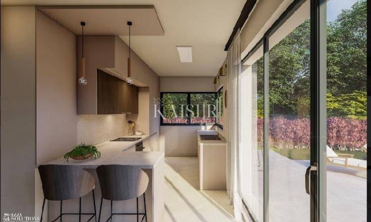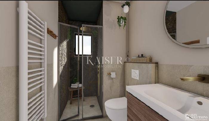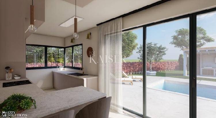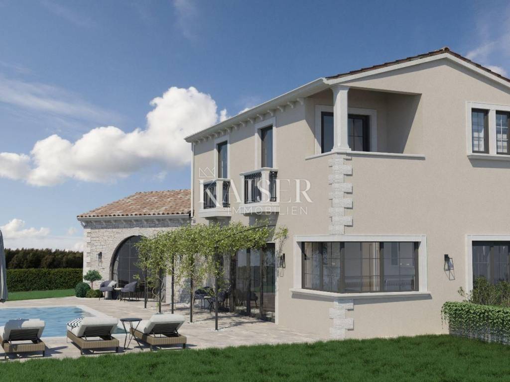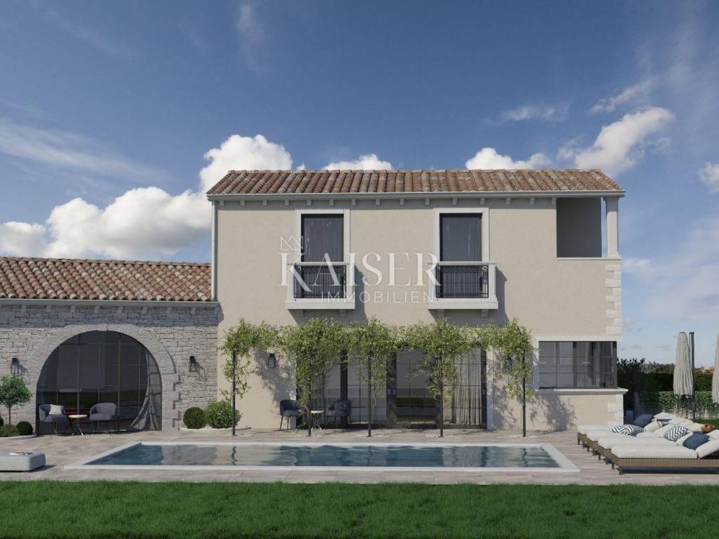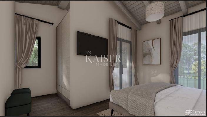 Kaiser Immobilien offers for sale a beautiful new-build villa, located 20 km from the town of Poreč and the sea, in a small authentic Istrian village near Tinjan. This villa offers a perfect blend of rustic and modern style, creating a unique atmosphere of peace and quiet, surrounded by nature. The villa is spread over the ground floor and first floor. The ground floor has one bedroom, bathroom, kitchen, living room and dining room, while the first floor has two more bedrooms, each with its own bathroom. The rooms on the first floor have small balconies, and the main master bedroom boasts a beautiful covered terrace with a mesmerizing view of the forest and the surroundings, ideal for enjoying your morning coffee with the sound of the breeze and the chirping of birds. This villa also offers a heated swimming pool, and the plan is to build a sauna, summer kitchen, additional toilet and showers near the pool. Heating is provided by a heat pump, each room is air-conditioned, and the bathrooms have underfloor heating. The villa also offers parking for three vehicles. This property is the perfect choice for those looking for a peaceful life in nature, while at the same time wanting to be close to the coast and all the amenities that Istria has to offer. Don't miss the opportunity to become the owner of this beautiful home! Distance from the property to the town: Poreč - Pula Airport, 45 km Poreč - Ljubljana, 162 km Poreč - Vienna, 544 km Poreč - Prague, 868 km Poreč - Munich, 565 km If you are looking for your new home, please contact us with confidence at: phone: 00385923782803 email address: ivana@kaiser-immobilien.hr. Seller: Ivana Gašparini. The agency fee is 3% + VAT, and is charged with the first legal act.