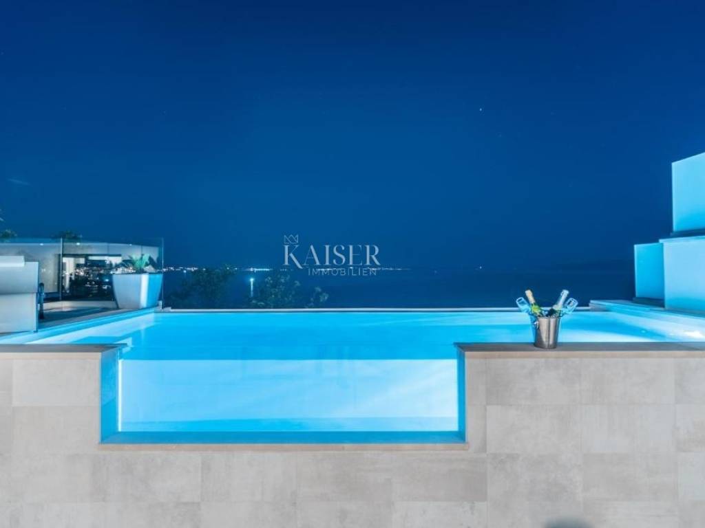In the hinterland of Opatija is this beautiful three-story apartment with a view of the Opatija Riviera and the islands with an outdoor swimming pool on top of a building consisting of two luxury apartments. Kaiser Immobilien puts on the market a luxury apartment with a southeast orientation and a living area of 240 m2, which consists of a basement, ground floor, upper ground floor and first floor. There is a boiler room in the basement of the house. The main entrance to the exclusive apartment leads us to the high ground floor, where we enter an open entrance hall connected to the kitchen, dining room and large living room, as well as a large terrace with an open view for afternoon chilling, 1 bedroom with an attached bathroom and a walk-in closet make up the whole of this floor. We can use the internal staircase to go down to the ground floor or go up to the 1st floor. On the ground floor there are 2 bedrooms, each with its own bathroom and a large terrace, a large room for a home gym or children's playroom and a storage room with a washing machine. On the 1st floor is the master bedroom, with its own bathroom, and a beautiful terrace with a swimming pool and a fantastic view of the sea, Rijeka and the entire Kvarner Bay. This terrace is connected to another large terrace located on the opposite northwest side of the house and provides the owners with pleasant shade during hot days and a beautiful view of Učka and sunsets. The house is built of high-quality materials and has a well-thought-out interior layout. Common rooms are in the foreground, and smartly arranged bedrooms provide the owners with maximum peace and privacy. Electric underfloor heating and air conditioning units for cooling and heating have been installed throughout the house. At least 4 parking spaces are available around the house. The yard of the apartment has an area of 285 m2 and in front of the house facing the sea there is a small garden with Mediterranean plants and citrus fruits. The location is 5 minutes by car from the center of Opatija, as well as from all important amenities, shops, clinics, pharmacies, bus stations, schools. The pedestrian shortcut to the sea can be reached in ten minutes. Major cities like Zagreb are approx. 1.30 minutes away by car, Ljubljana approx. 1.30 min, Poreč approx. 1 hour, Krk airport approx. 40 minutes, Rijeka approx. 20 minutes. For additional information and a tour, contact your agent: Eli Lovko, mob: 0916133776; eli@kaiser-immobilien.hr Agency commission is 3% + VAT