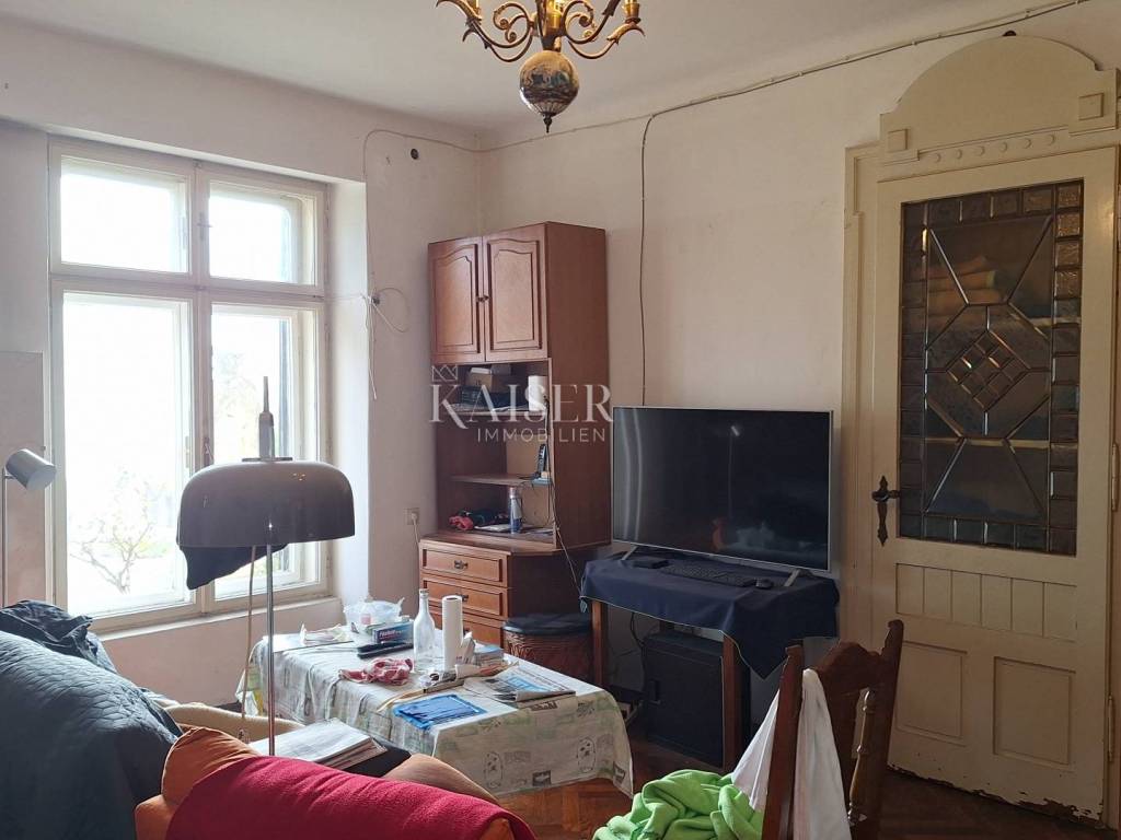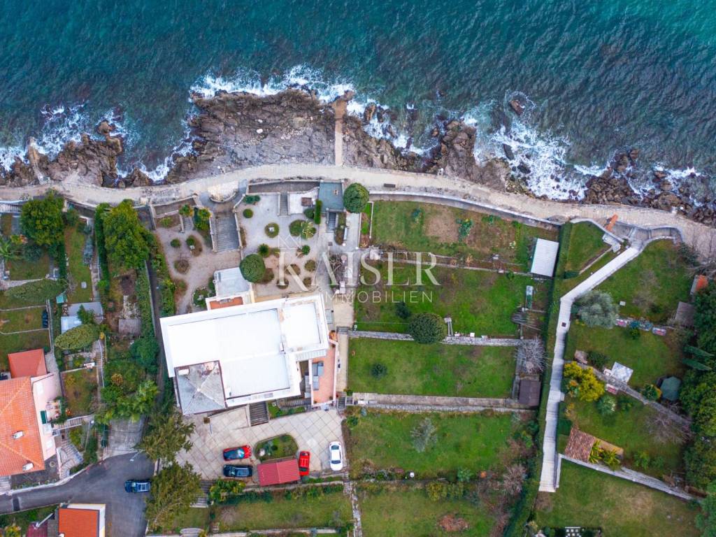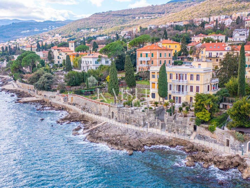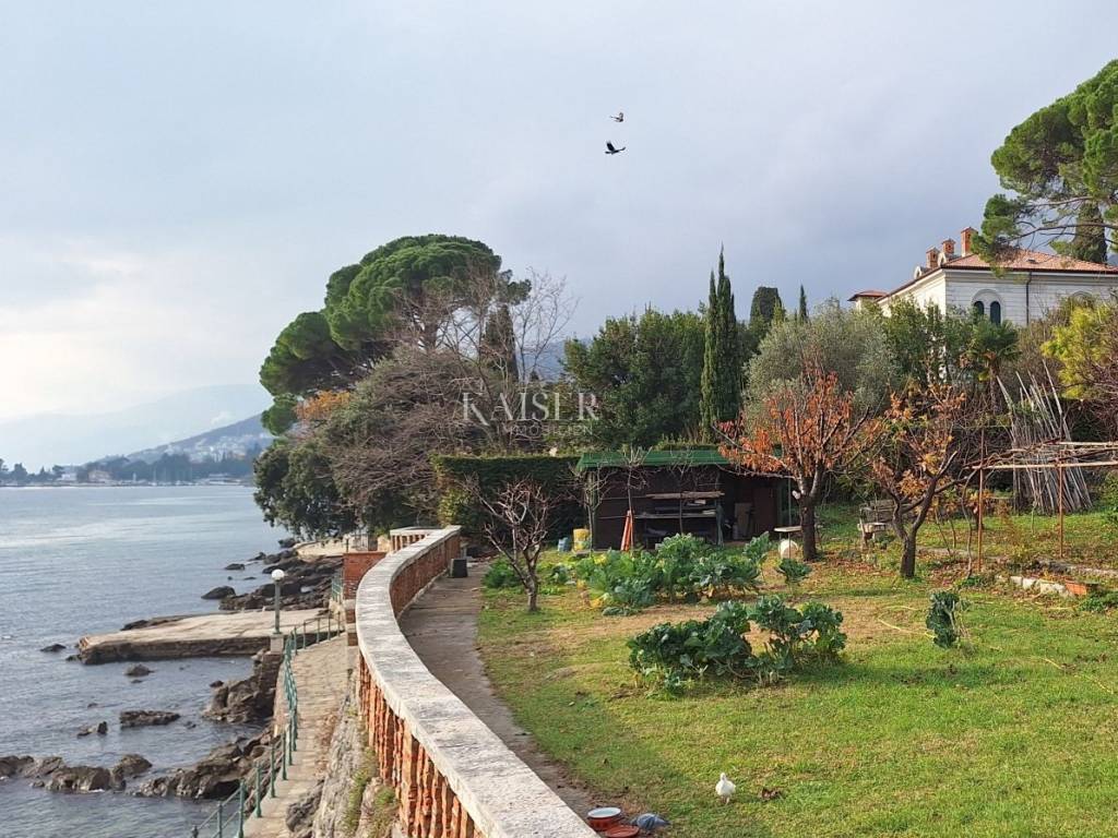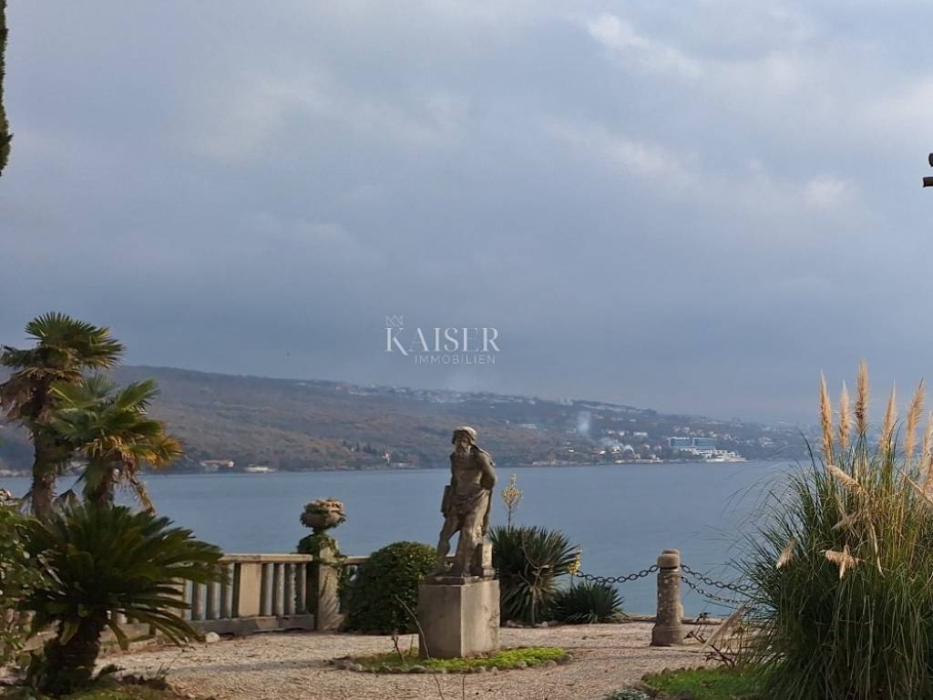 In the immediate vicinity of the sea in the picturesque town of Volosko near Opatija, 2 km from the center of Opatija, there is an Art Nouveau villa in which we present you an apartment on the ground floor of the villa with approximately 550 m2 of garden for use, first row to the sea. The apartment has 4 entrances and exits, two of which lead to a landscaped garden and terrace in front of the apartment and direct access to the promenade by the sea. It consists of a hallway, two bedrooms, living room, kitchen, dining room, bathroom and toilet, on an area of 102 m2. The apartment has two parking spaces in the building's yard. The terrace in front of the apartment offers a magnificent view of the sea, Rijeka, Opatija and the islands, and the sound of the waves spreads through the terrace as well as the scent of the nearby pine trees. The apartment has its own exit to the promenade by the sea. The entire apartment is for complete renovation, which gives the new owner the opportunity to arrange this superb location in accordance with his vision of the space.