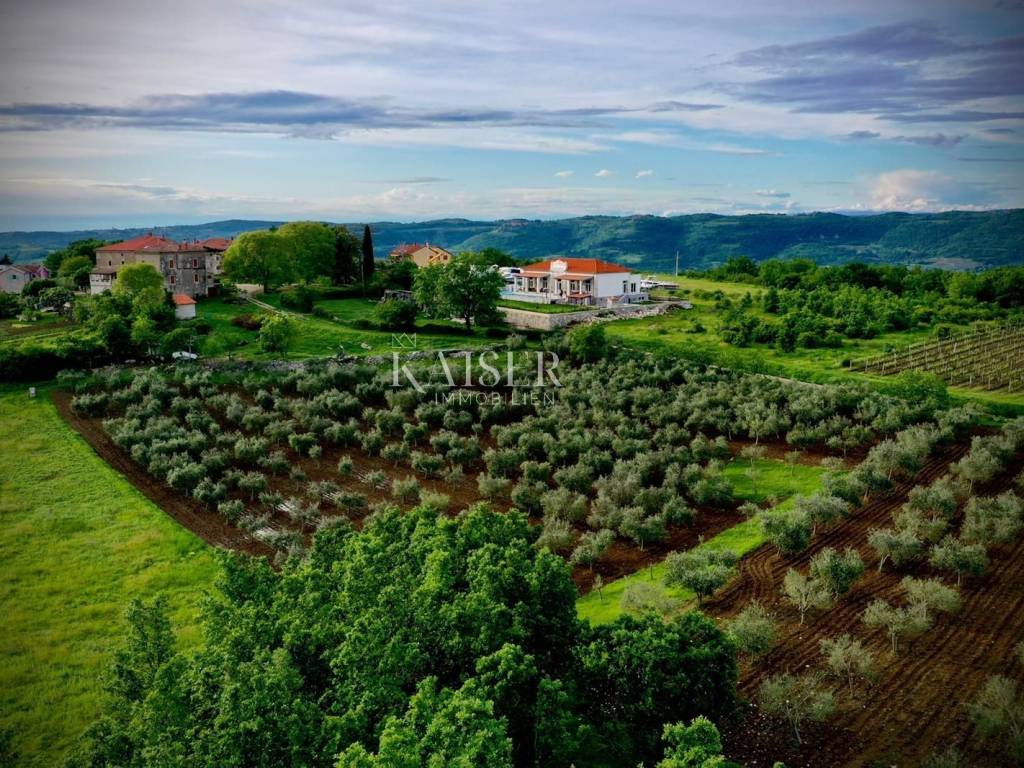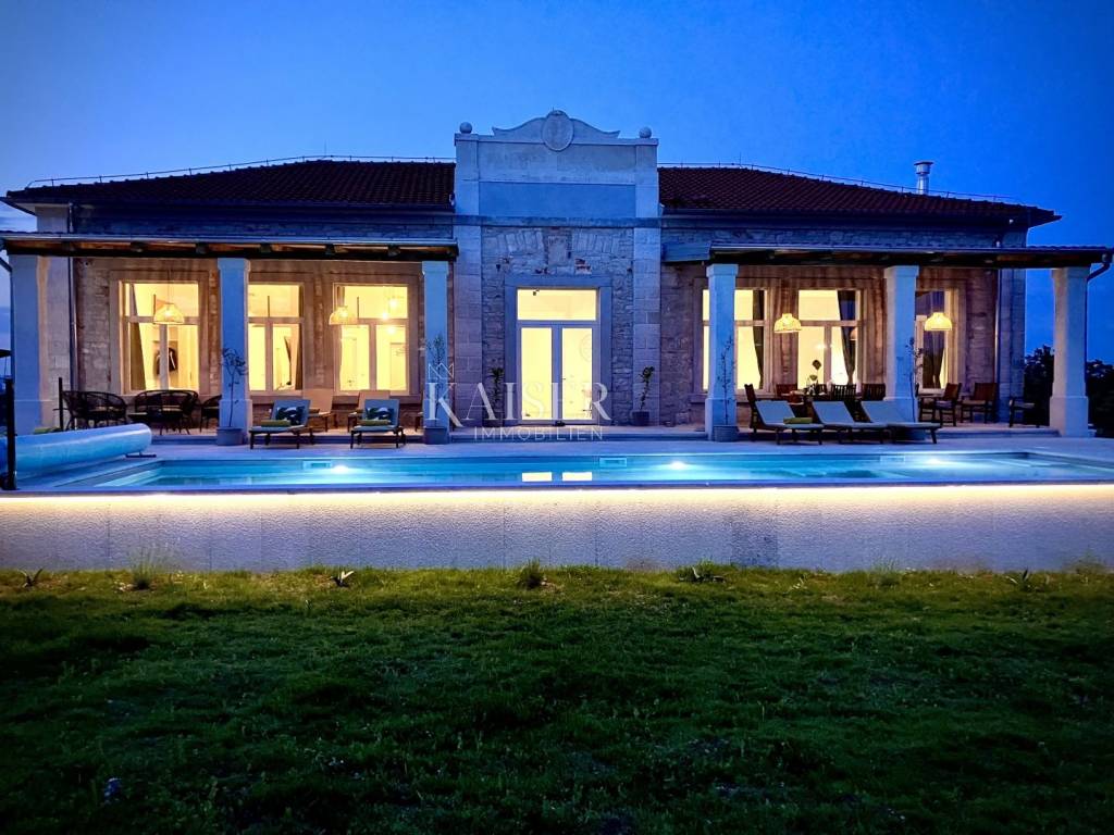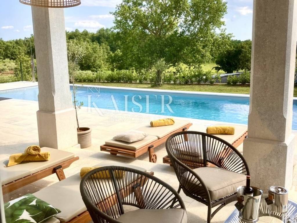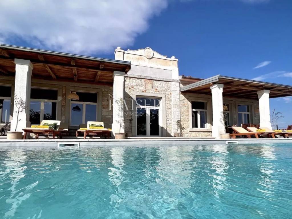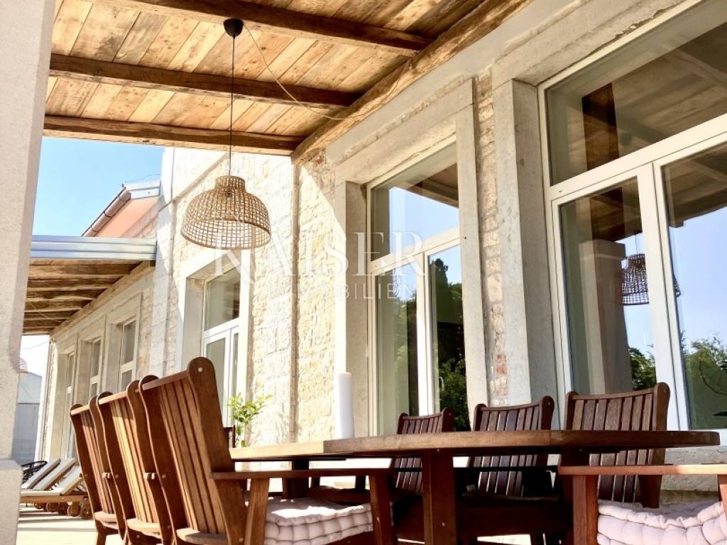Kaiser Immobilien presents a beautiful, indigenous villa that combines the traditional charm of a century-old stone villa with modern luxury and comfort. The stone villa, which dates back to 1919, has a rich history and a traditional design that is a symbol of bygone times. Surrounded by vineyards and olive groves, the villa has a beautiful natural environment that further enriches the aesthetics and enables relaxation in nature. The villa consists of a ground floor, a spacious pleasant terrace, a swimming pool and the environment around it. The special feature of this stone villa is its living space, which covers an area of 260 m2, and provides plenty of sunlight and comfort for comfortable living and socializing, as the entire space is oriented towards the sun with large glass windows. In front of the villa there is a heated pool of 52 m2 and a spacious terrace of 150 m2, which create an ideal environment for relaxation, fun and outdoor enjoyment. The basement area of 138 m2 is equipped with wellness facilities, including a Finnish sauna, a shower and a relaxation room. There are additional free spaces that can be subsequently arranged into any desired content, for example, a wine cellar, fitness studio, billiards room, etc... The villa offers the comfort of as many as 5 bedrooms, two of which have specially decorated raised part on the first floor, the so-called "studio" All rooms have their own bathrooms. The thorough renovation includes underfloor heating, a fan coil air conditioning system, high ceilings that add spaciousness, large windows for plenty of natural light, and bathrooms in every room. Allow us to be a part of your new life story with this finished project and contact the Kaiser Immobilien agency.
