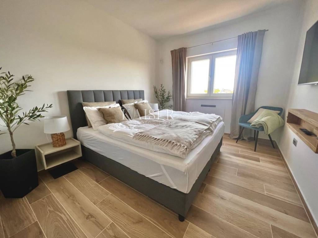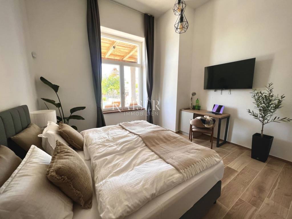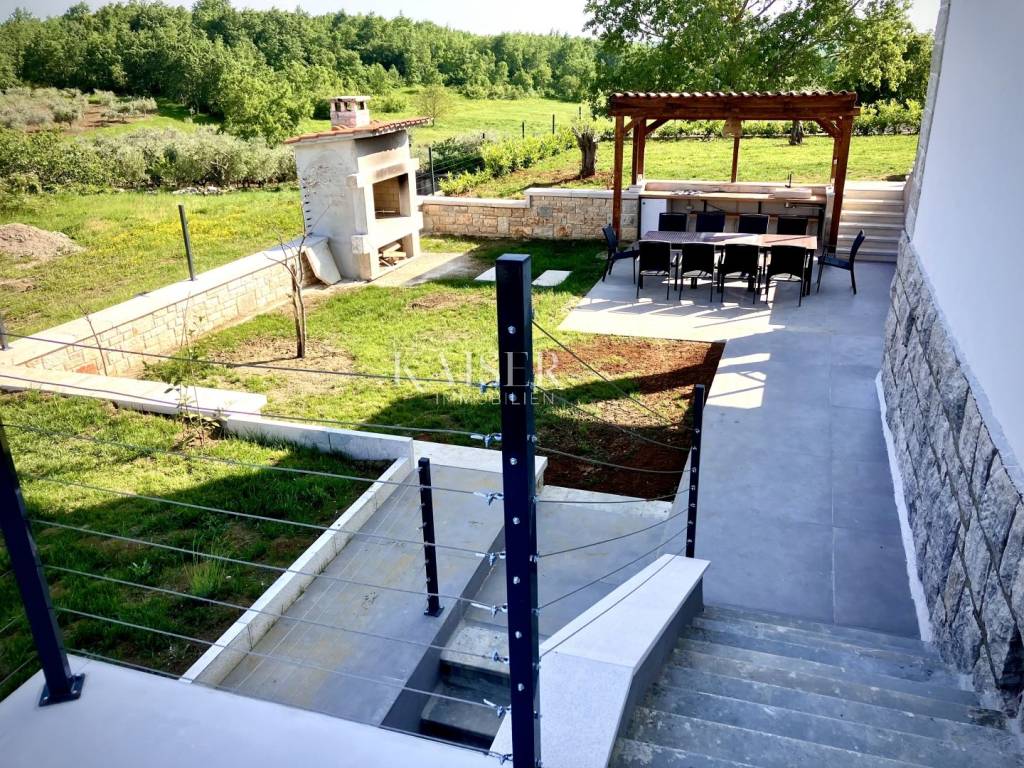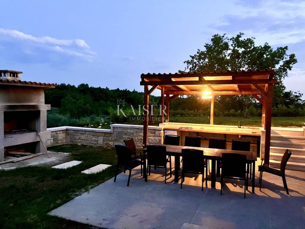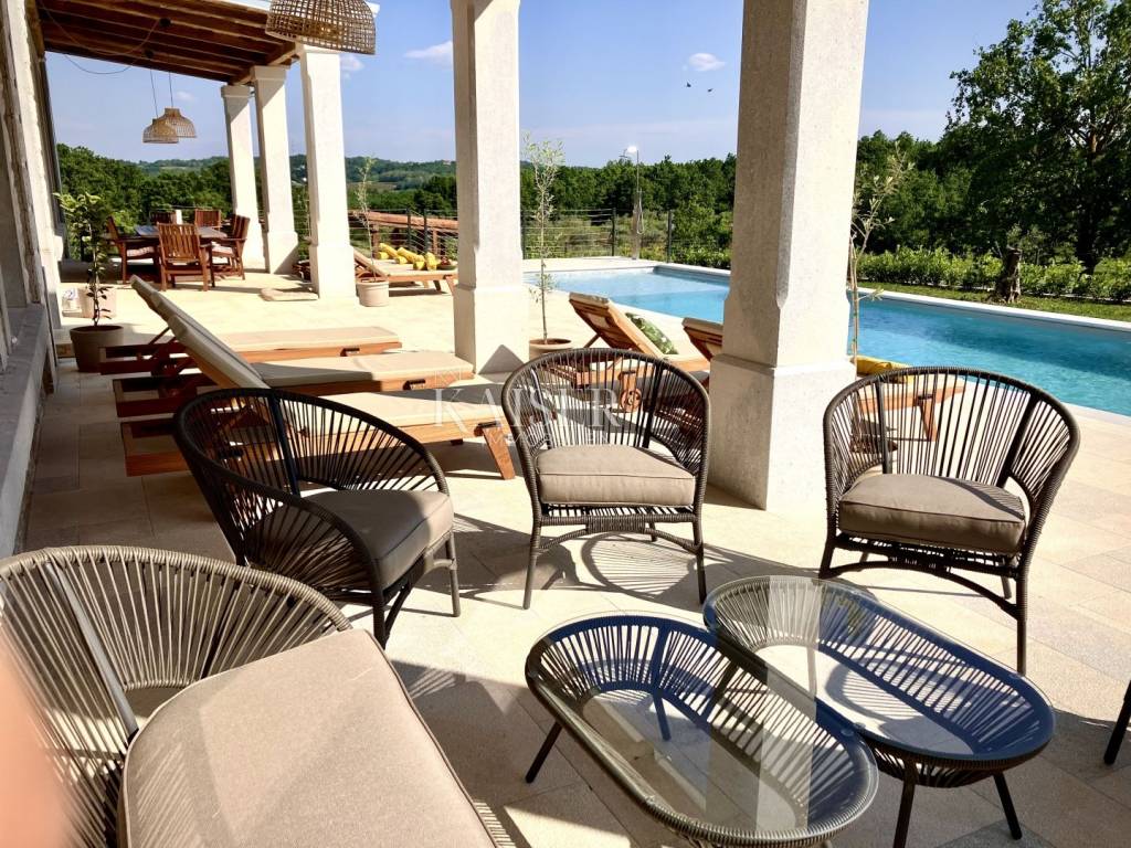 Kaiser Immobilien presents a beautiful, indigenous villa that combines the traditional charm of a century-old stone villa with modern luxury and comfort. The stone villa, which dates back to 1919, has a rich history and a traditional design that is a symbol of bygone times. Surrounded by vineyards and olive groves, the villa has a beautiful natural environment that further enriches the aesthetics and enables relaxation in nature. The villa consists of a ground floor, a spacious pleasant terrace, a swimming pool and the environment around it. The special feature of this stone villa is its living space, which covers an area of 260 m2, and provides plenty of sunlight and comfort for comfortable living and socializing, as the entire space is oriented towards the sun with large glass windows. In front of the villa there is a heated pool of 52 m2 and a spacious terrace of 150 m2, which create an ideal environment for relaxation, fun and outdoor enjoyment. The basement area of 138 m2 is equipped with wellness facilities, including a Finnish sauna, a shower and a relaxation room. There are additional free spaces that can be subsequently arranged into any desired content, for example, a wine cellar, fitness studio, billiards room, etc... The villa offers the comfort of as many as 5 bedrooms, two of which have specially decorated raised part on the first floor, the so-called "studio" All rooms have their own bathrooms. The thorough renovation includes underfloor heating, a fan coil air conditioning system, high ceilings that add spaciousness, large windows for plenty of natural light, and bathrooms in every room. Allow us to be a part of your new life story with this finished project and contact the Kaiser Immobilien agency.