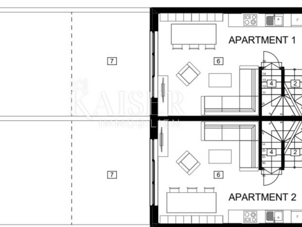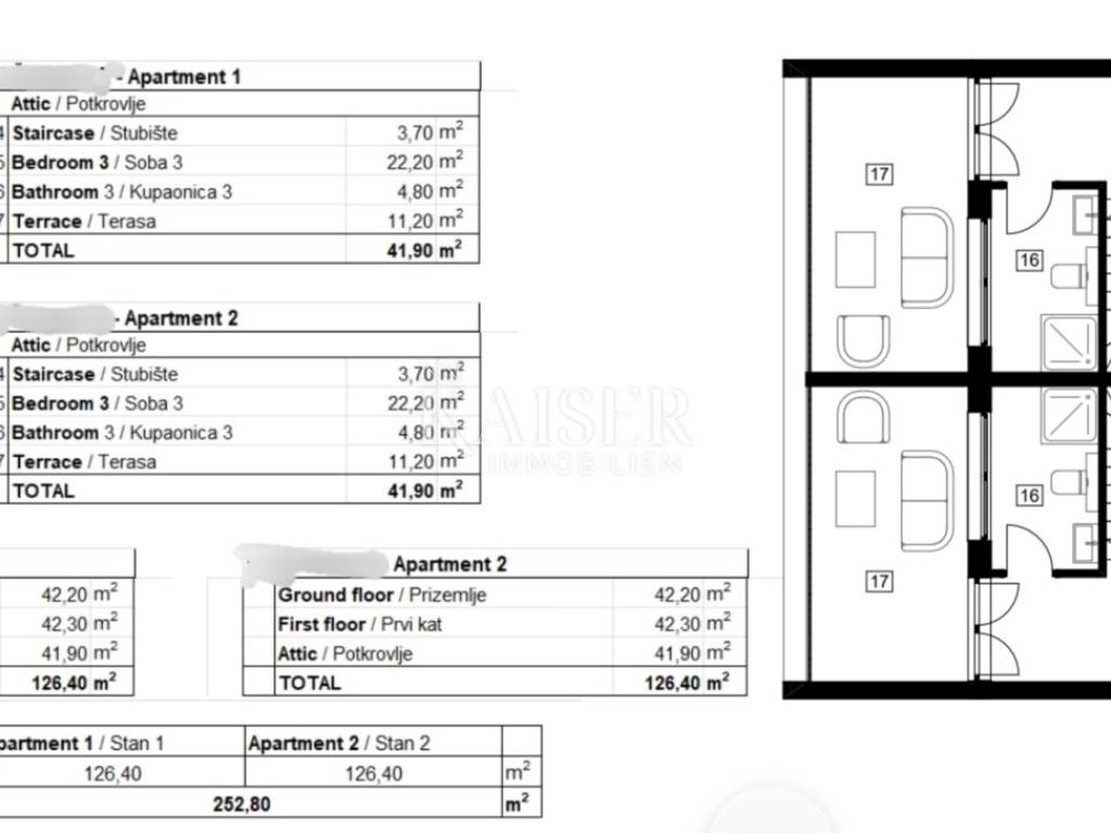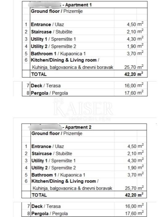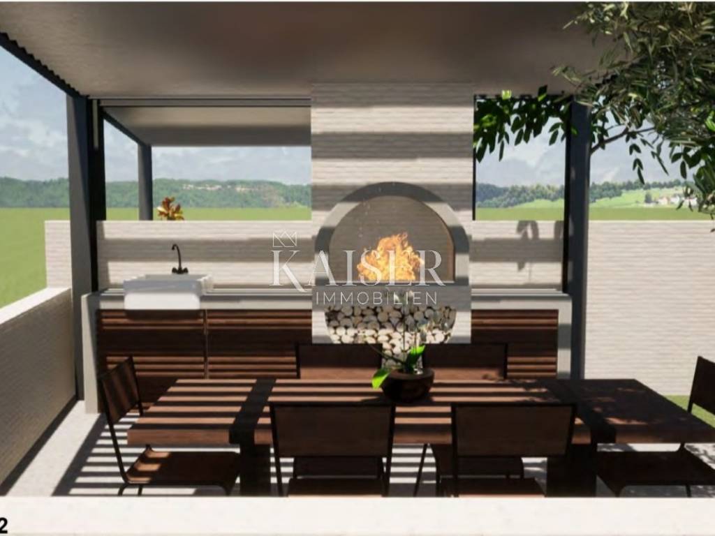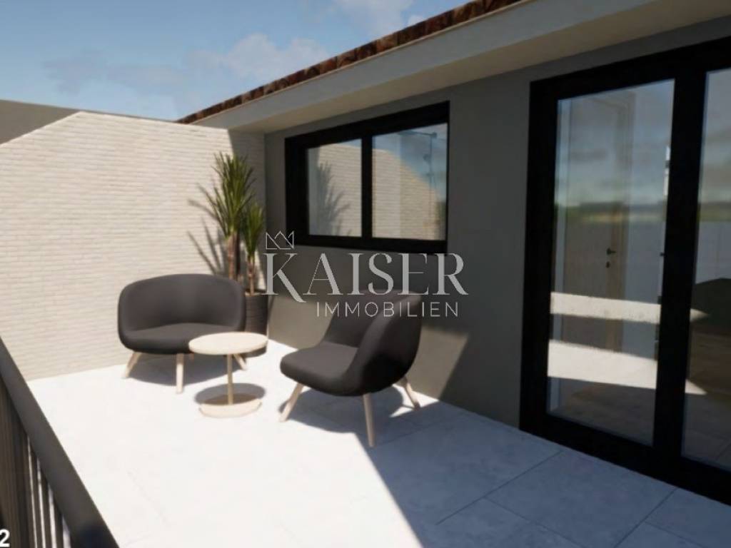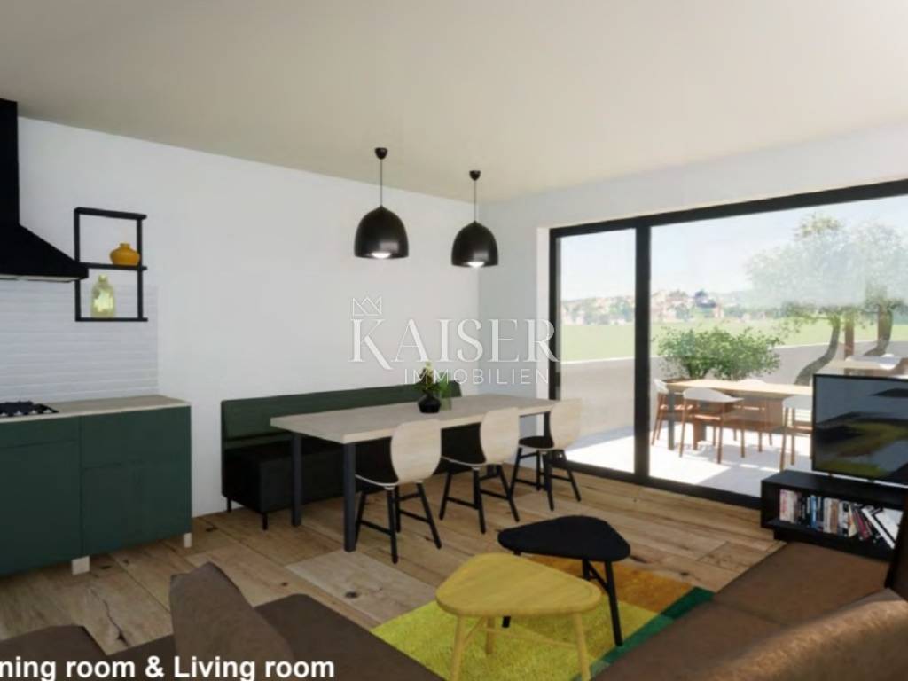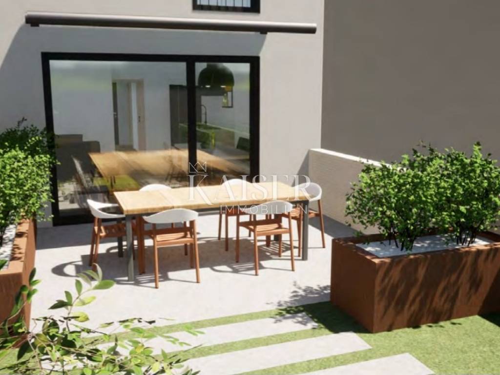 Kaiser Immobilien is selling a modern terraced house with two residential units. Each residential unit consists of a ground floor, a first floor and an attic, a total of 126 m2. On the ground floor there is an entrance hall, two storage rooms, a kitchen, a dining room, a living room and a bathroom. Through a large glass wall, you can access a beautiful terrace of 16 m2 with a pergola of a total size of 17.60 m. In the garden, there is also a summer kitchen. On the first floor there are two bedrooms with a bathroom. The attic is 41.90 m2 in size and consists of a staircase, a room with a bathroom and a terrace of 11.20 m2. Construction started, planned completion is the end of 2024.