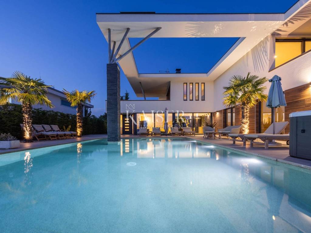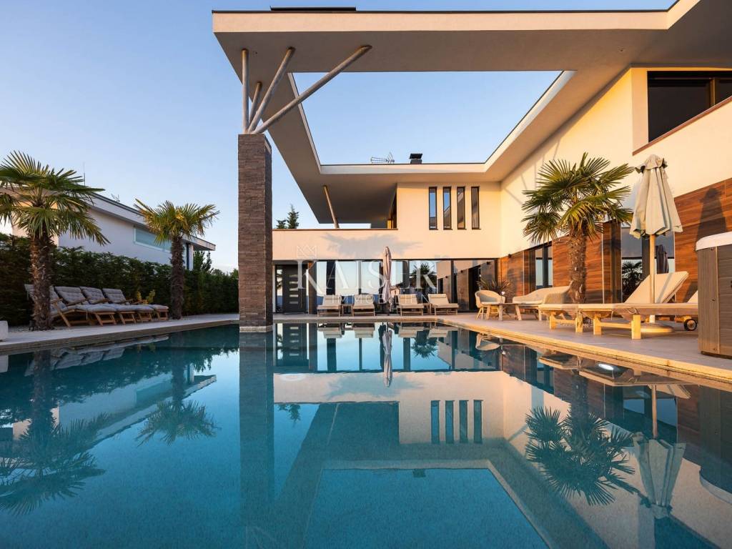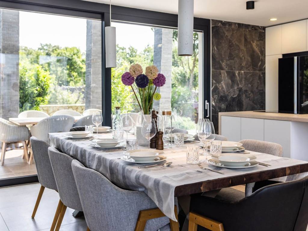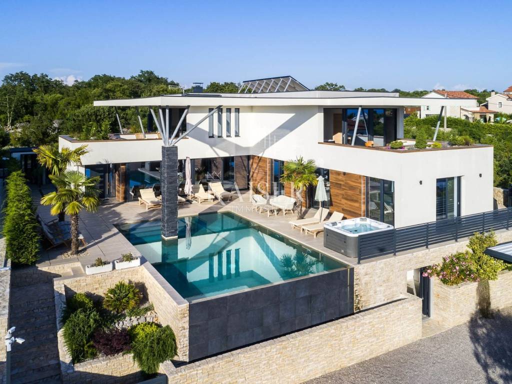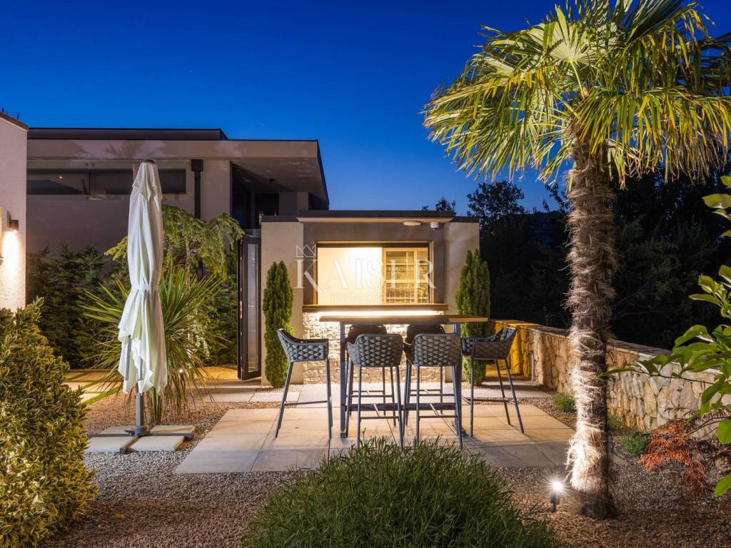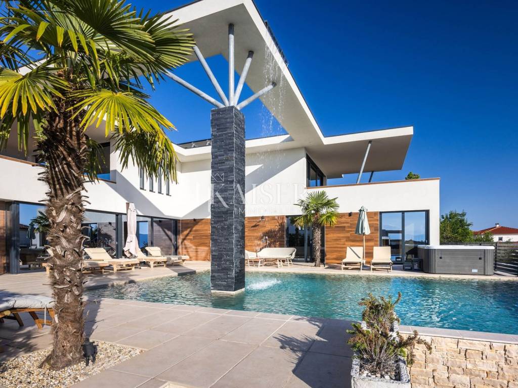 Kaiser immobilien is mediating the sale of an exclusive modern villa in the vicinity of Krk, with a sea view. Unique architecture, exceptional location, modern design, and minimalist interior design make this villa unique on the market. The villa with a total living area of 266m2 is spread over three floors. The entrance area on the ground floor of the villa leads to a spacious glazed open-concept living area of 58m2, which consists of a living room, kitchen with an island for preparing food, dining room and guest bathroom. The living room offers a beautiful view of the sea, landscaped garden and infinity pool. On the ground floor there are three bedrooms with private bathrooms. An internal staircase leads to the first floor where there are two "master" bedrooms. One bedroom has a bathtub, its own "en suite" bathroom and access to a covered terrace with panoramic sea views, an ideal place for watching the magical sunsets in this part of the Mediterranean. The second bedroom also has its own "en suite" bathroom and access to a covered terrace with a panoramic view of the sea, as well as a Finnish and infrared sauna. This property is special for its basement, where there is a fully equipped wine cellar in addition to the gym, storage room and game room. Superior equipment and materials, many glazed surfaces, and modern minimalist interior design enable the senses to adapt to enjoy the simple combination of greenery and sea and sunny days, the characteristics of this part of the Mediterranean. Underfloor heating is installed over the entire area of the building, all rooms are air-conditioned, and the building is sold equipped and furnished. There is a spacious heated "infinity" pool of 57m2 in the landscaped garden, with a water fountain that drops water from the roof and thus enriches the effect of the natural fall of water and enjoyment in the pool. There is also a hydromassage tub, sun deck, summer kitchen, barbecue and five parking spaces. An additional feature of this property is that it is located in a mini resort, which allows for year-round maintenance of the property, as well as the possibility of full service related to tourist rental, by arrangement. The agency's commission for the buyer is 3% + VAT and is paid in the case of purchasing the property, upon conclusion of the first legal act. ID CODE 105-284