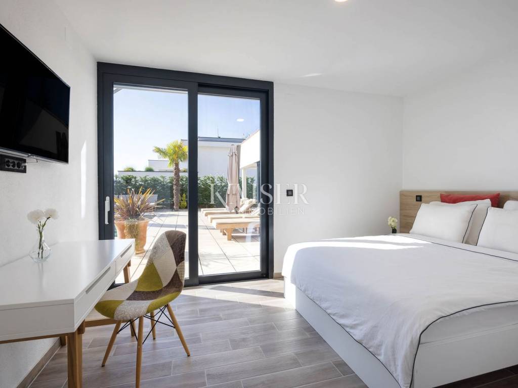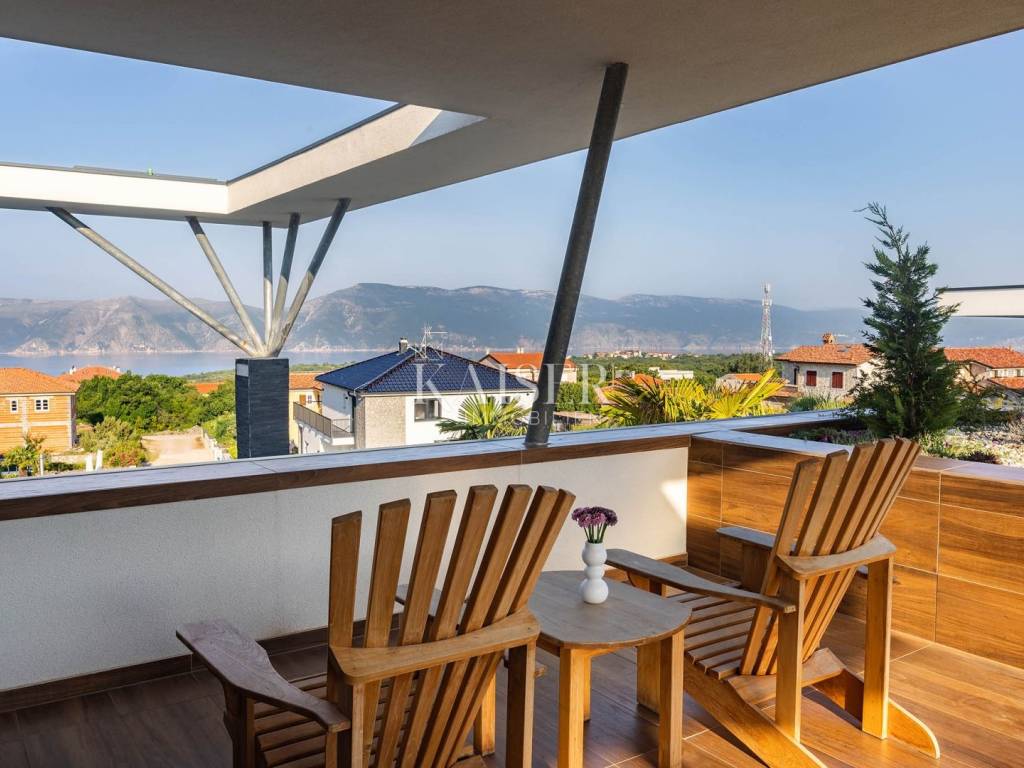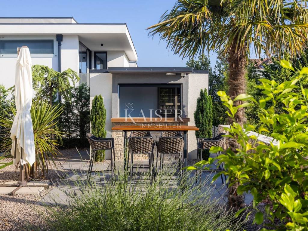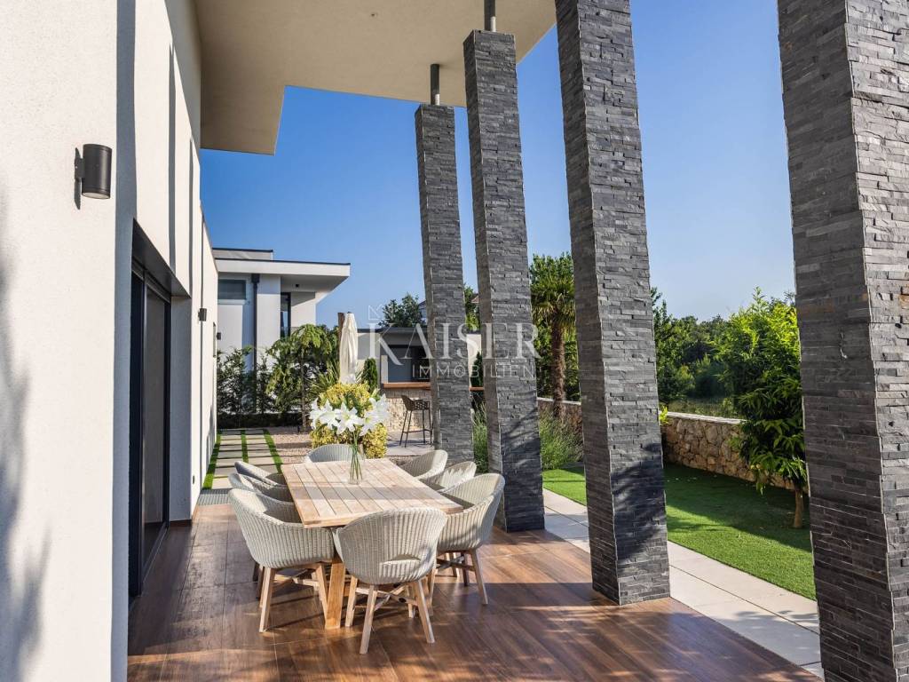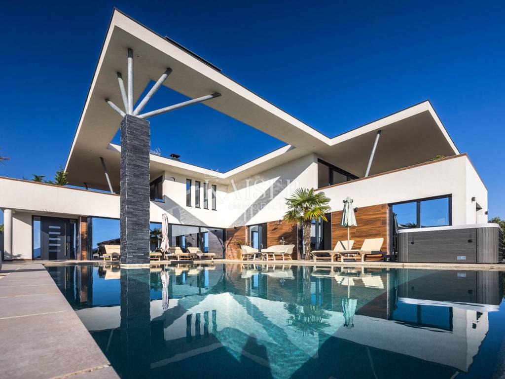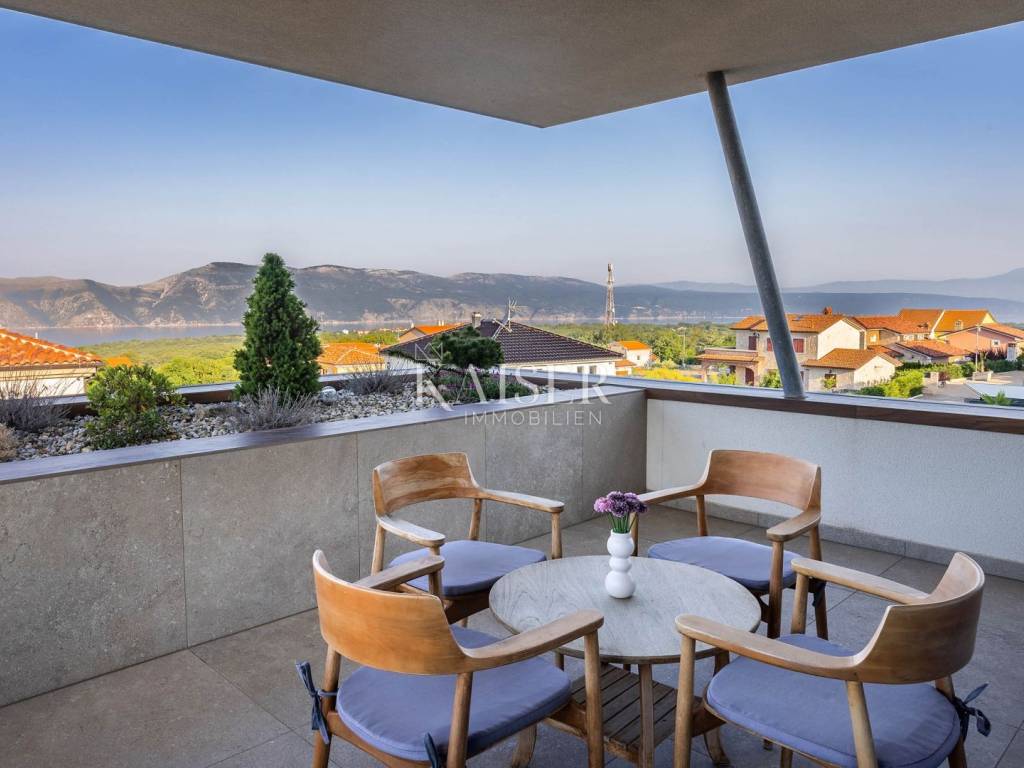 Kaiser immobilien is mediating the sale of an exclusive modern villa in the vicinity of Krk, with a sea view. Unique architecture, exceptional location, modern design, and minimalist interior design make this villa unique on the market. The villa with a total living area of 266m2 is spread over three floors. The entrance area on the ground floor of the villa leads to a spacious glazed open-concept living area of 58m2, which consists of a living room, kitchen with an island for preparing food, dining room and guest bathroom. The living room offers a beautiful view of the sea, landscaped garden and infinity pool. On the ground floor there are three bedrooms with private bathrooms. An internal staircase leads to the first floor where there are two "master" bedrooms. One bedroom has a bathtub, its own "en suite" bathroom and access to a covered terrace with panoramic sea views, an ideal place for watching the magical sunsets in this part of the Mediterranean. The second bedroom also has its own "en suite" bathroom and access to a covered terrace with a panoramic view of the sea, as well as a Finnish and infrared sauna. This property is special for its basement, where there is a fully equipped wine cellar in addition to the gym, storage room and game room. Superior equipment and materials, many glazed surfaces, and modern minimalist interior design enable the senses to adapt to enjoy the simple combination of greenery and sea and sunny days, the characteristics of this part of the Mediterranean. Underfloor heating is installed over the entire area of the building, all rooms are air-conditioned, and the building is sold equipped and furnished. There is a spacious heated "infinity" pool of 57m2 in the landscaped garden, with a water fountain that drops water from the roof and thus enriches the effect of the natural fall of water and enjoyment in the pool. There is also a hydromassage tub, sun deck, summer kitchen, barbecue and five parking spaces. An additional feature of this property is that it is located in a mini resort, which allows for year-round maintenance of the property, as well as the possibility of full service related to tourist rental, by arrangement. The agency's commission for the buyer is 3% + VAT and is paid in the case of purchasing the property, upon conclusion of the first legal act. ID CODE 105-284