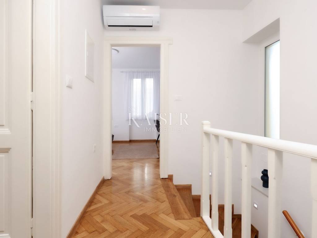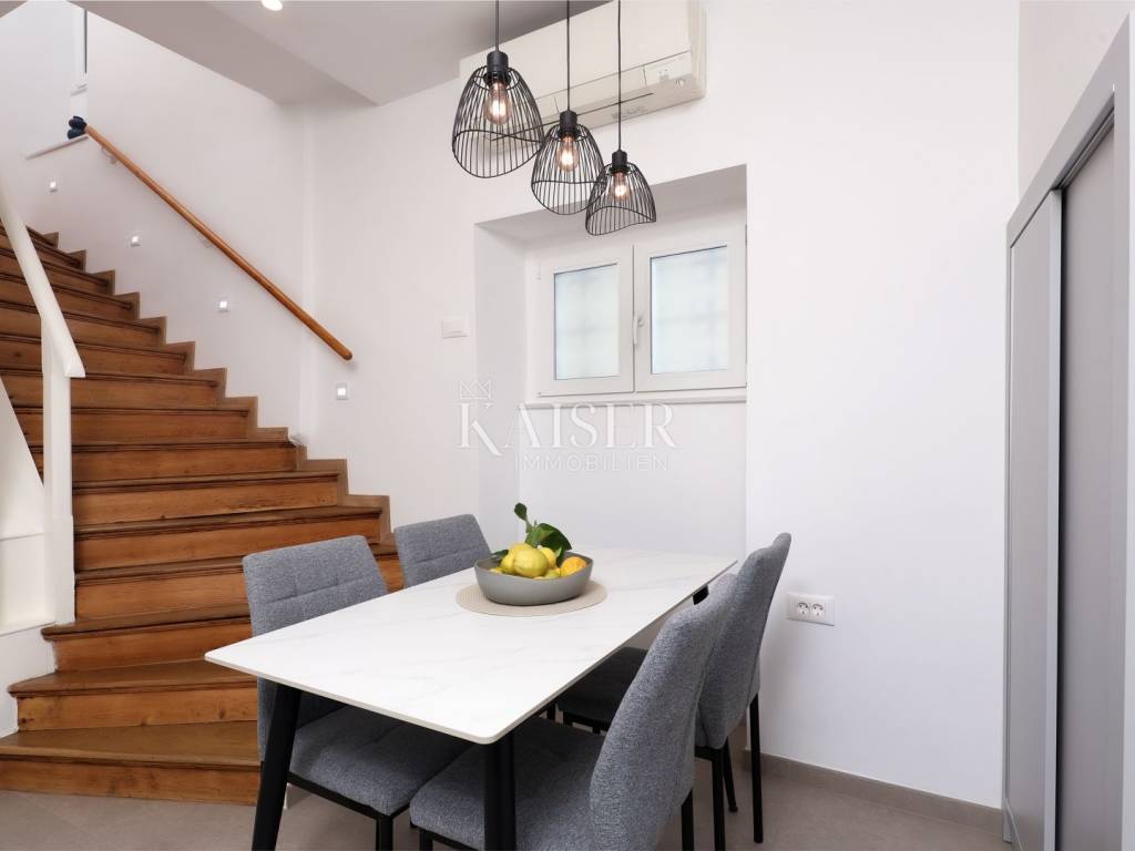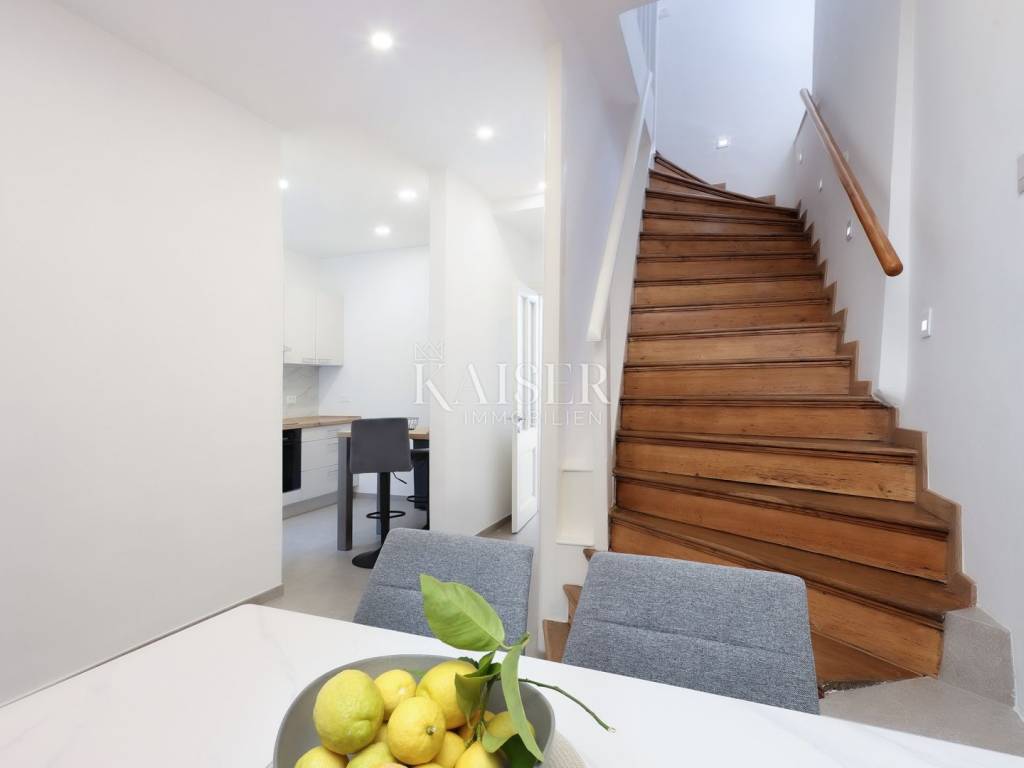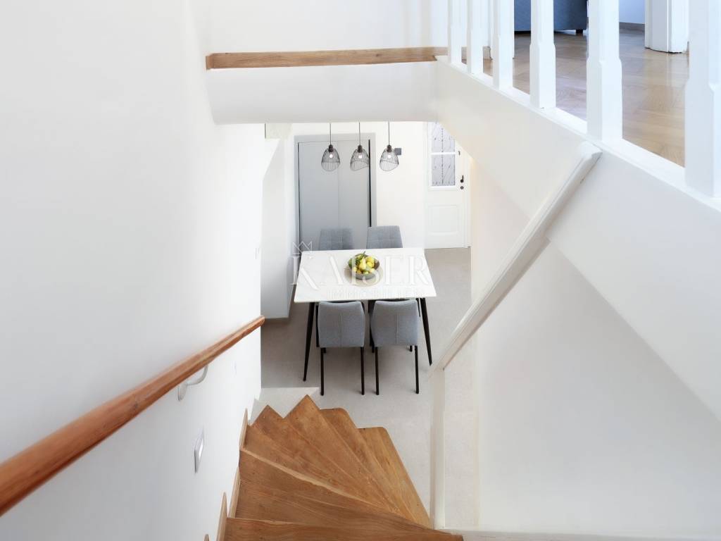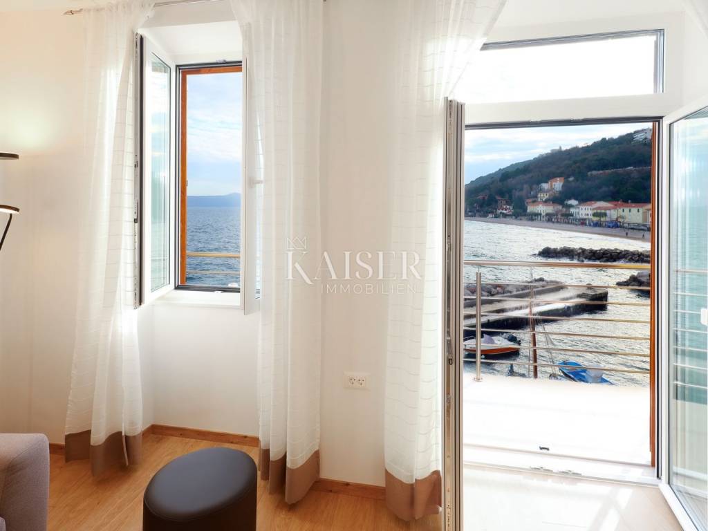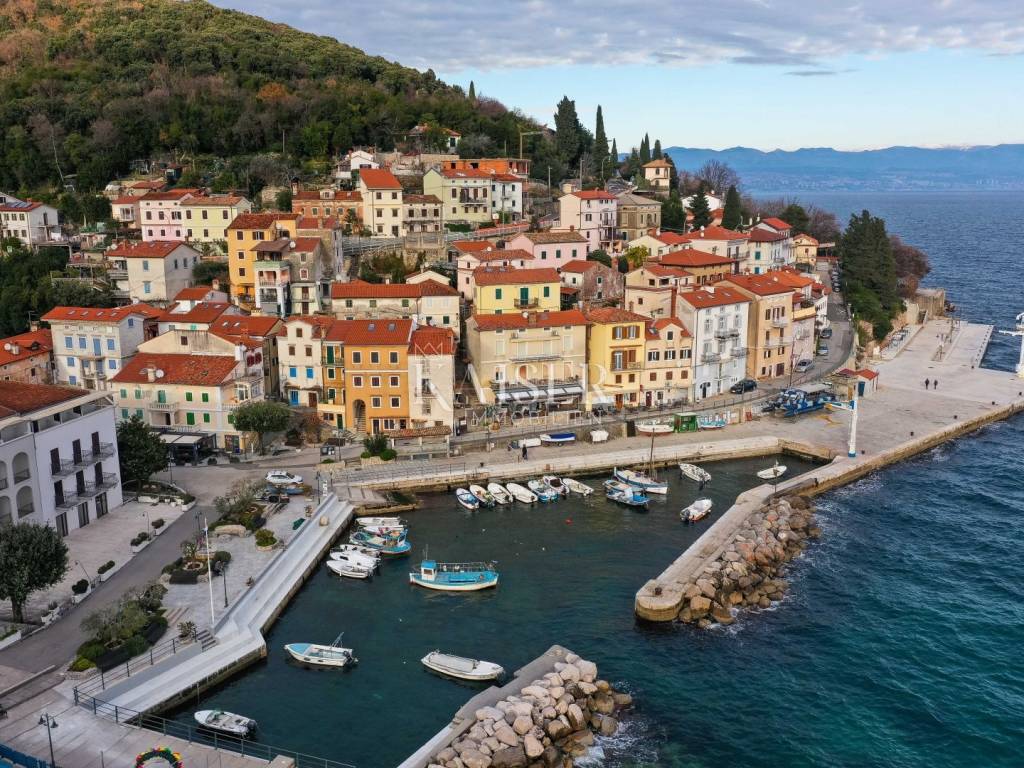Mošćenička Draga, a fishing and tourist town located at the foot of Učka on the eastern coast of Istria, with beautiful pebble beaches, and the famous Sipar beach. The old core that exudes the spirit of bygone times of narrow stone streets and flower pots. In such an environment is located this beautiful apartment, first row to the sea with a view of the open sea, the blue of the sea and the forest - the greenery of the area under Učka and the old town of Mošćenice. Upon entering the apartment, we are greeted by a picture of the sea coast, a port with boats and barges that sway and sway on the sea waiting for their owners to take them. On the ground floor we will find: a dining room, a small kitchen, a hallway, a toilet and a living room with a balcony from which there is a special view of the town, the sea and the environment. On the first floor there are two bedrooms and a bathroom with a walk-in shower. The space is heated by electric underfloor heating and air conditioning units heating-cooling which are located in the living room and two on the first floor. An optical connection to the high-speed internet network is expected soon. At this location you will feel the smell of the sea, the tranquility that offers you a view of the open sea and greenery, and the peace of rest and untouched nature with a mild Mediterranean climate. In the immediate vicinity, within a walking distance of 5 to 10 minutes. you will find all the necessary facilities: bus station, kiosk, butcher, shop, school, kindergarten, clinic, library, pharmacy, etc. For lovers of walks by the sea, a pleasant promenade along the sea to the last beach awaits you, and in the vicinity there is also a path leading to the old town of Mošćenice, and other educational paths towards Učka. The gastronomic offer of the town of Mošćenička draga and several Michelin-starred restaurants will provide, in addition to a visual romantic view of the town, a gourmet experience for lovers of fish and local specialties. There is a free parking space for residents of this location approximately 50 meters from the location. Distance from major centers: Lovran 15 min, Opatija 30 min, Rijeka 45 min, Pula 2h, Zagreb 2h, Vienna 5h, Trieste 1h 50 min, Ljubljana 2h 15 min approx. drive by car. For more information, call +385916133776 agent Eli Lovko. The agency fee is 1 rent + VAT and is paid upon the first money transaction.