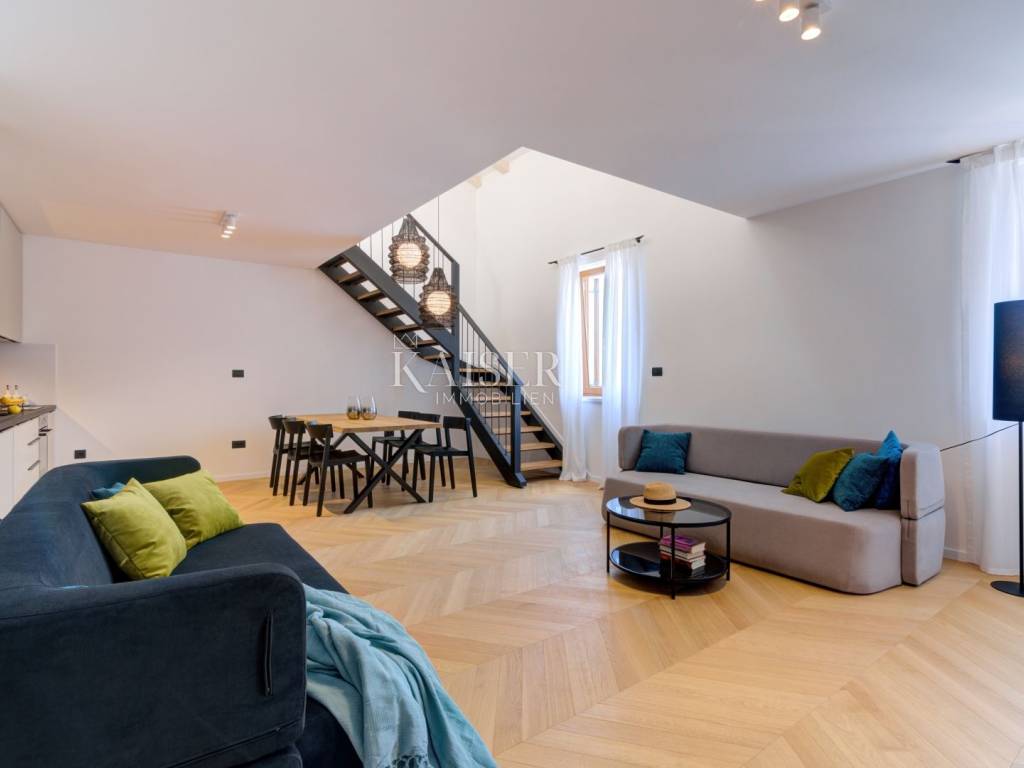 Kaiser Immobilien proudly presents an exceptionally luxurious and modernly decorated apartment located in one of the most desirable locations in Kvarner — literally a few steps from the sea, only 10 meters away. This unique home offers an impressive panoramic view of Opatija, the island of Cres and the endless blue of the Adriatic, creating an environment where luxury intertwines with natural beauty. The apartment extends over two elegant levels and is designed to offer the highest comfort, privacy and aesthetic harmony of every detail. The apartment is located on the second floor and consists of a representative entrance area, a modern and fully equipped kitchen with dining area, a spacious living room with large glass surfaces that bring in plenty of natural light and open views of the sea, two bedrooms, perfect for guests or family and a gallery-like open space that can be used as a work area, lounge or intimate corner for relaxation. The entire interior is decorated with exceptional style, combining contemporary lines, quality materials and carefully selected decorative elements. Each space exudes elegance and warmth, creating an atmosphere of luxury and complete peace. The apartment is an ideal choice for anyone looking for a combination of urban life, comfort and life by the sea. In the immediate vicinity, there are all the facilities necessary for a comfortable stay: top restaurants, cafes and promenades by the sea. This property is a real rarity on the market - an exclusive apartment in an exceptional location, ideal both for living and as an investment for vacation or rental. For everyone who wants the highest quality of life by the sea, this is an opportunity not to be missed. For more information or to arrange a tour, feel free to contact us. The commission of the agency for the buyer is 3% + VAT and is paid in the case of real estate purchase, at the conclusion of the first legal deed. For more detailed information, please contact: Silvija Blažić Phone: +385 915 223 893 E-mail: silvija.blazic@kaiser-immobilien.hr Property code: 111-79