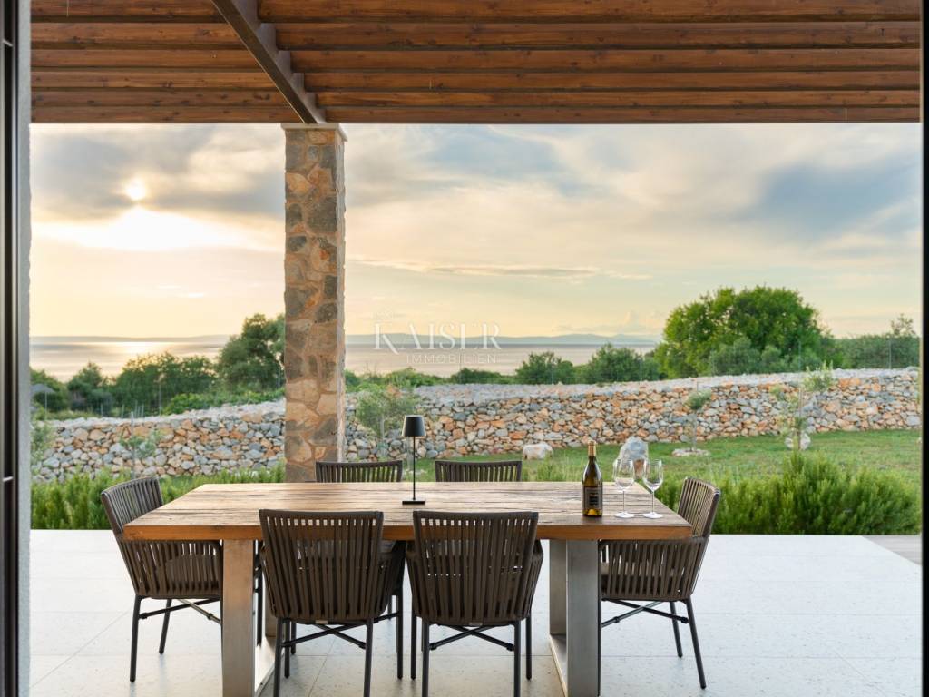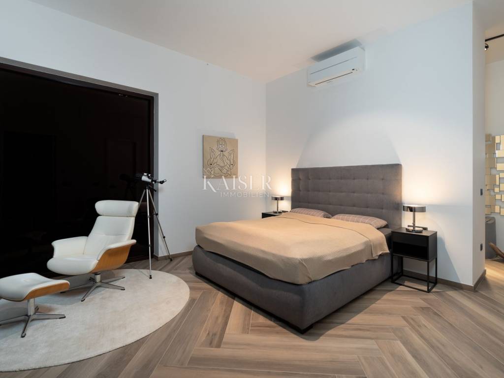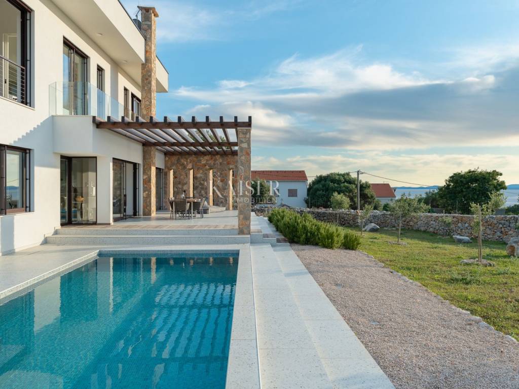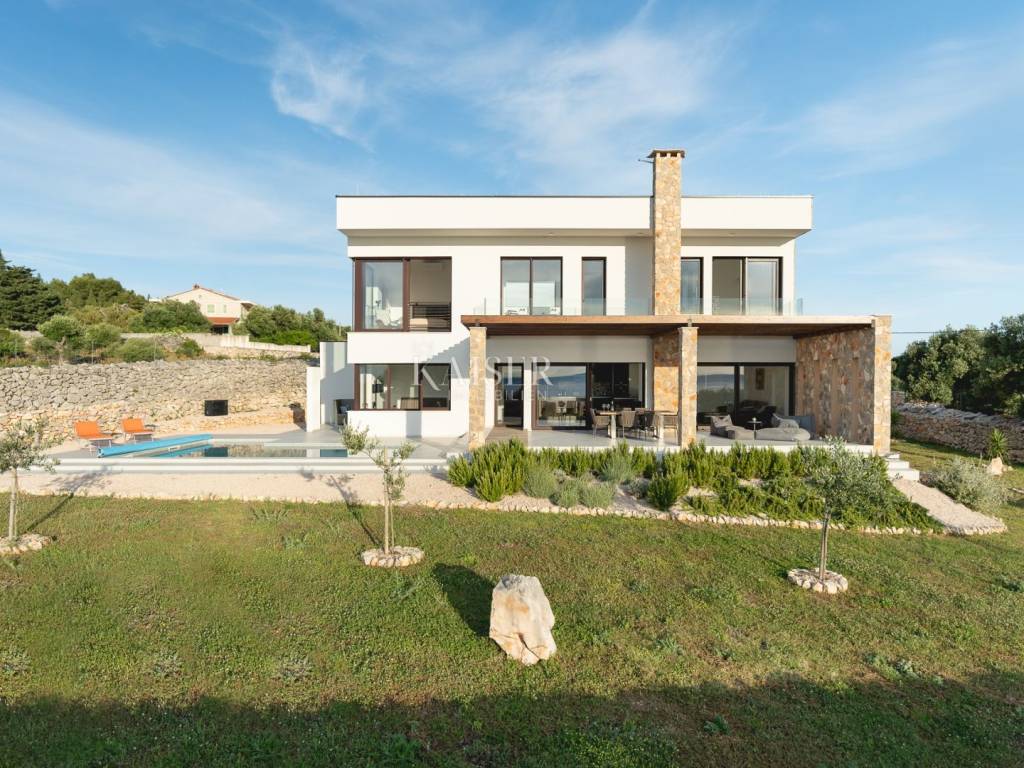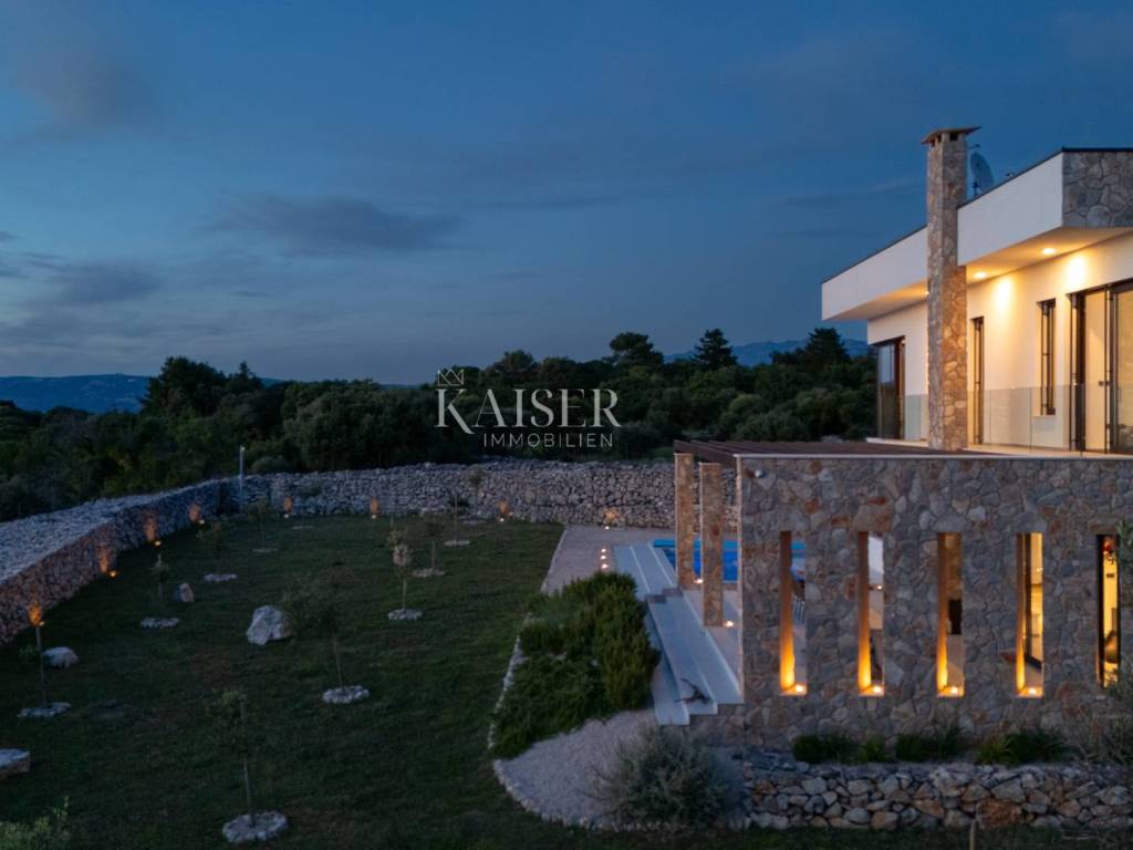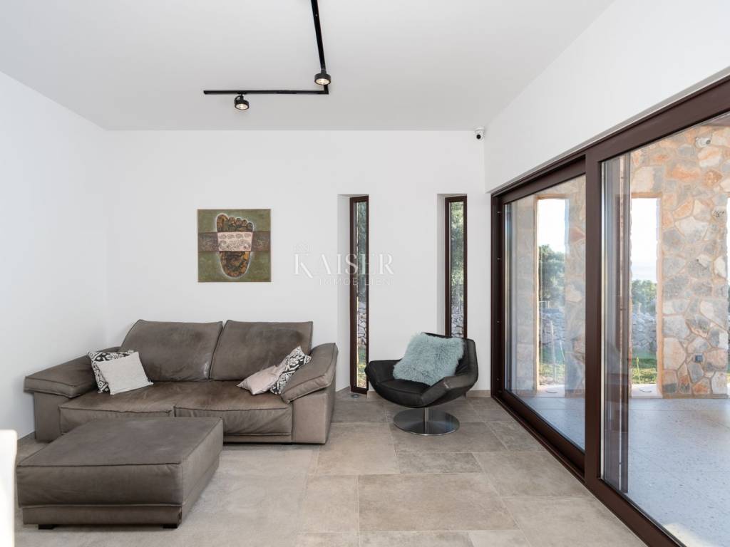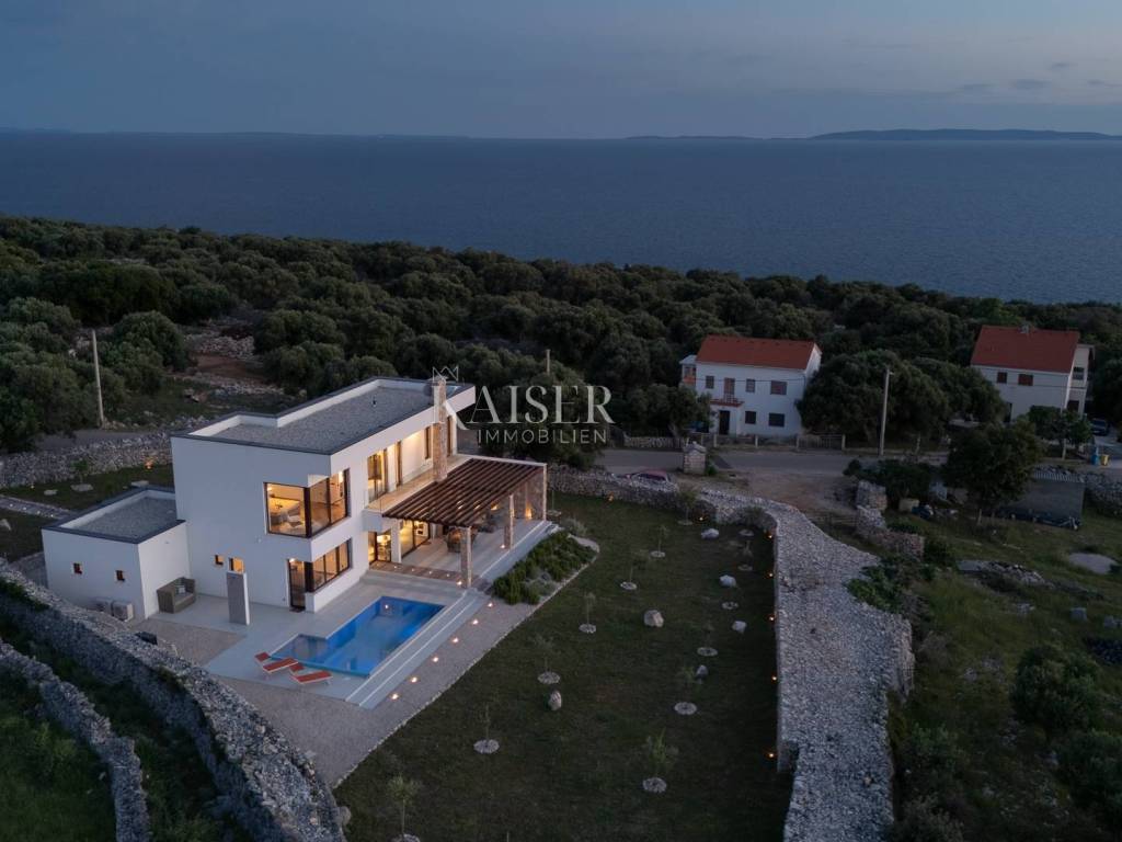 On the northernmost cape of the island of Pag, only 20 km from Novalja, lies Lun - an oasis of peace and natural beauty, known for its centuries-old olive groves and unique wild olive trees. In this idyll, surrounded by the sound of crickets and the forest of waves, Kaiser Immobilien is proud to present a modern villa, built in 2021, which is spread over a spacious plot of 1707 m², surrounded by olive groves. The villa was built to high standards, with attention paid to every detail. The facade is covered with specially selected stone from the island of Brač, which gives it a special charm and durability. The villa consists of a ground floor and a first floor, with high ceilings that give the rooms airiness and a feeling of spaciousness. The ground floor of this beautiful villa includes an open space concept kitchen, dining room and living room with a modern fireplace, which provides a pleasant feeling of warmth during the winter months. In addition, the ground floor offers a guest room, hallway, bathroom, laundry room, storage room and technical room. On the upper floor there is a spacious master bedroom with a large bathroom and wardrobe space, an additional room, a toilet, a hallway and a balcony with a view of the enchanting landscape. The villa is equipped with the most modern technology, including underfloor heating, smart air conditioners (Mitsubishi Electronics), LAN/WLAN internet, SAT-TV/INET TV, luxury Bernada beds, HIKVISION video intercom, security monitoring and a smart home system. The kitchen is fully equipped with electrical appliances, and the LED lighting has the option of adjusting the light via timers and dimmers. High-quality glass railings are installed on the staircase and balcony. The landscaped Mediterranean garden around the villa is equipped with an automatic irrigation system, which ensures a lush and green environment throughout the year. This villa is perfect for those looking for a luxurious life in untouched nature, with modern comforts and absolute peace. Do not miss the opportunity to become the owner of this unique piece of paradise on the island of Pag. For all additional information and to arrange a viewing, please contact Kaiser Immobilien.