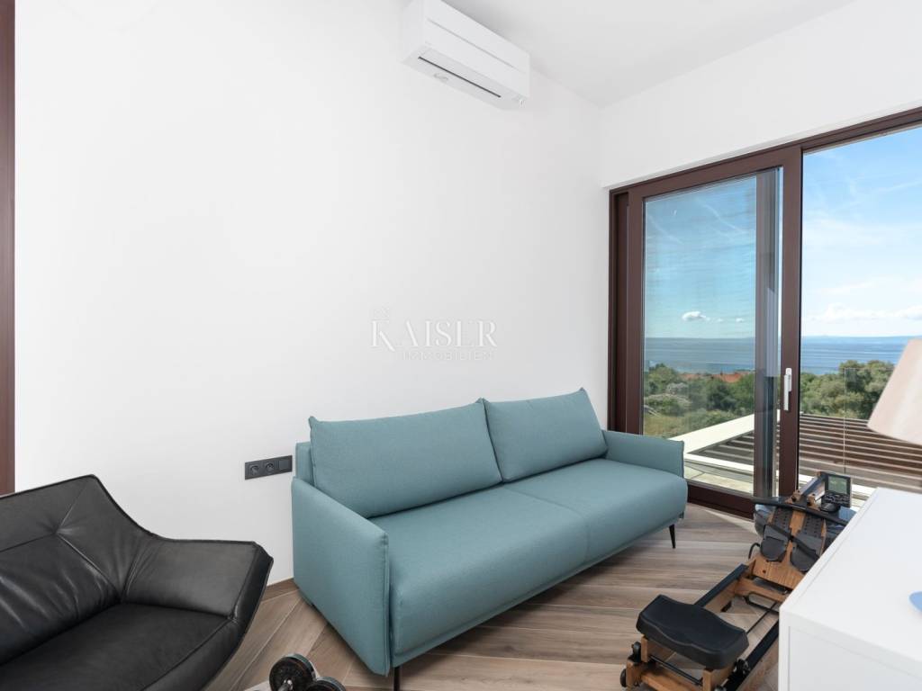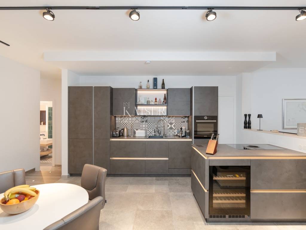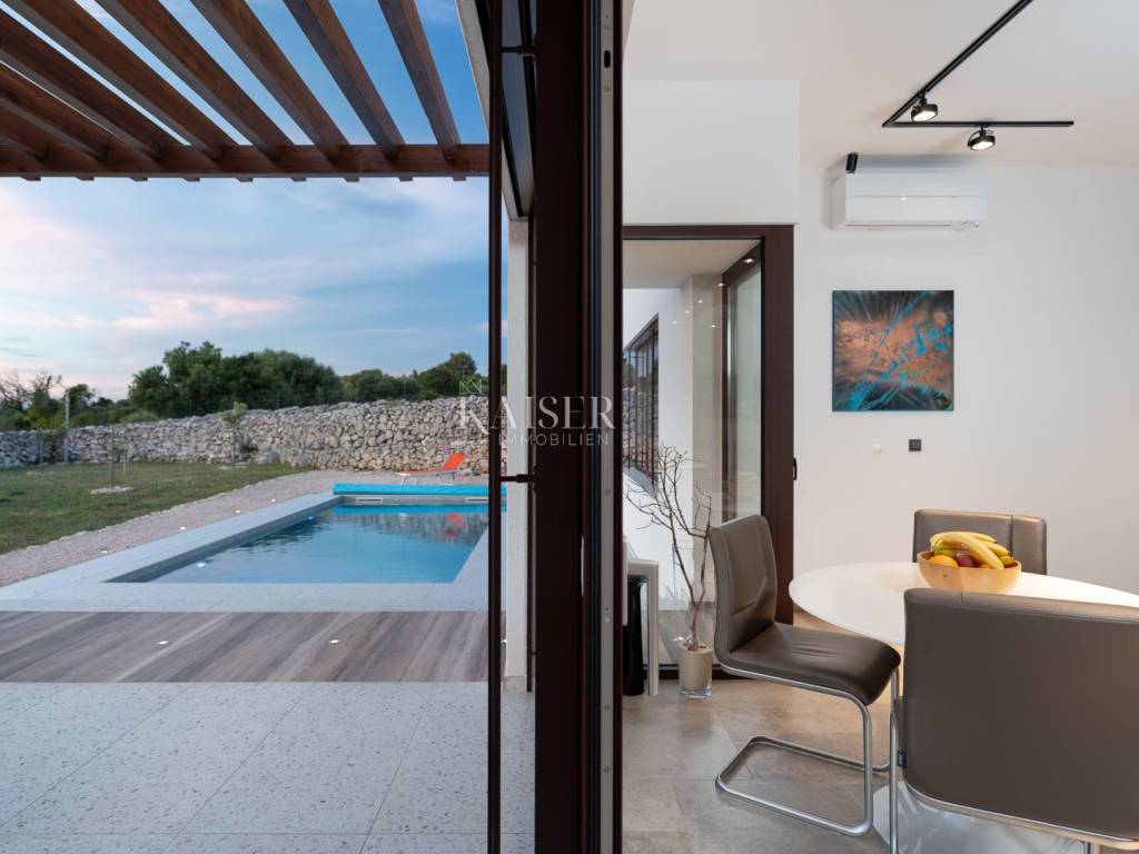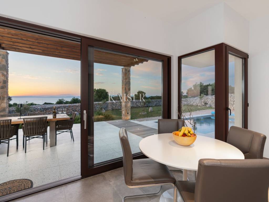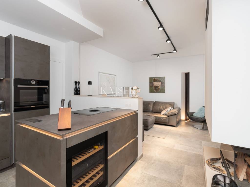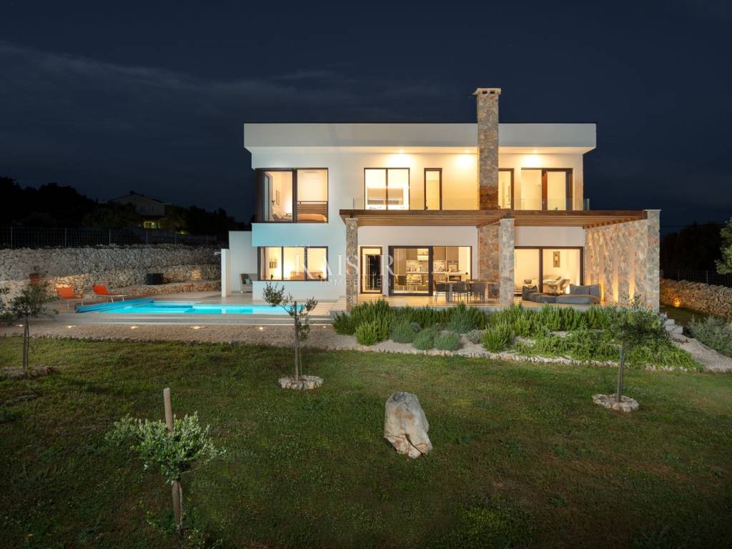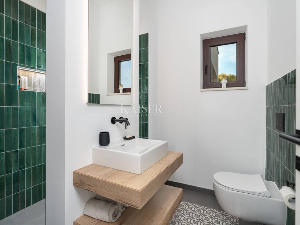 On the northernmost cape of the island of Pag, only 20 km from Novalja, lies Lun - an oasis of peace and natural beauty, known for its centuries-old olive groves and unique wild olive trees. In this idyll, surrounded by the sound of crickets and the forest of waves, Kaiser Immobilien is proud to present a modern villa, built in 2021, which is spread over a spacious plot of 1707 m², surrounded by olive groves. The villa was built to high standards, with attention paid to every detail. The facade is covered with specially selected stone from the island of Brač, which gives it a special charm and durability. The villa consists of a ground floor and a first floor, with high ceilings that give the rooms airiness and a feeling of spaciousness. The ground floor of this beautiful villa includes an open space concept kitchen, dining room and living room with a modern fireplace, which provides a pleasant feeling of warmth during the winter months. In addition, the ground floor offers a guest room, hallway, bathroom, laundry room, storage room and technical room. On the upper floor there is a spacious master bedroom with a large bathroom and wardrobe space, an additional room, a toilet, a hallway and a balcony with a view of the enchanting landscape. The villa is equipped with the most modern technology, including underfloor heating, smart air conditioners (Mitsubishi Electronics), LAN/WLAN internet, SAT-TV/INET TV, luxury Bernada beds, HIKVISION video intercom, security monitoring and a smart home system. The kitchen is fully equipped with electrical appliances, and the LED lighting has the option of adjusting the light via timers and dimmers. High-quality glass railings are installed on the staircase and balcony. The landscaped Mediterranean garden around the villa is equipped with an automatic irrigation system, which ensures a lush and green environment throughout the year. This villa is perfect for those looking for a luxurious life in untouched nature, with modern comforts and absolute peace. Do not miss the opportunity to become the owner of this unique piece of paradise on the island of Pag. For all additional information and to arrange a viewing, please contact Kaiser Immobilien.