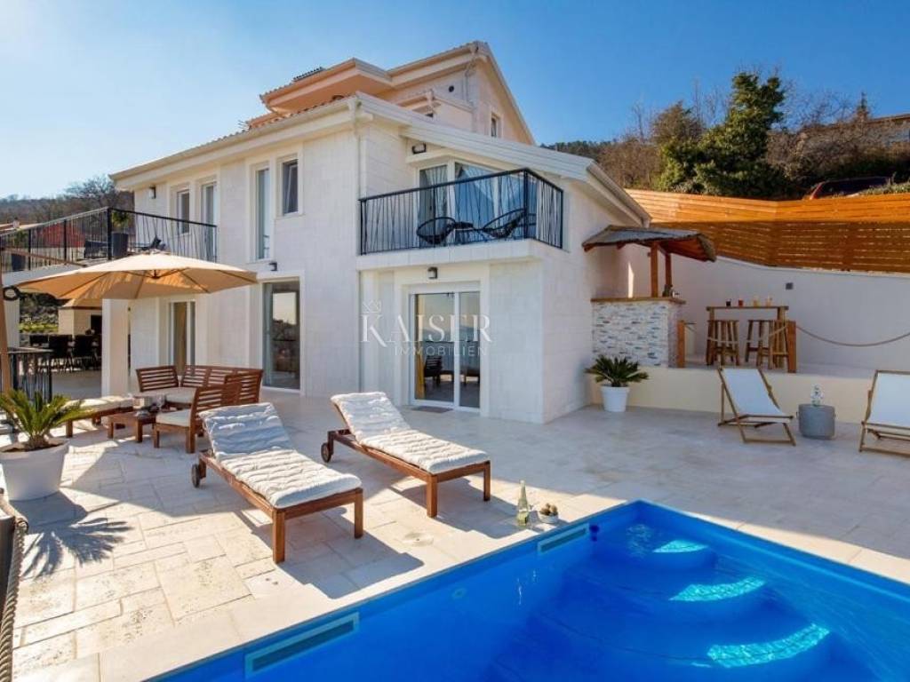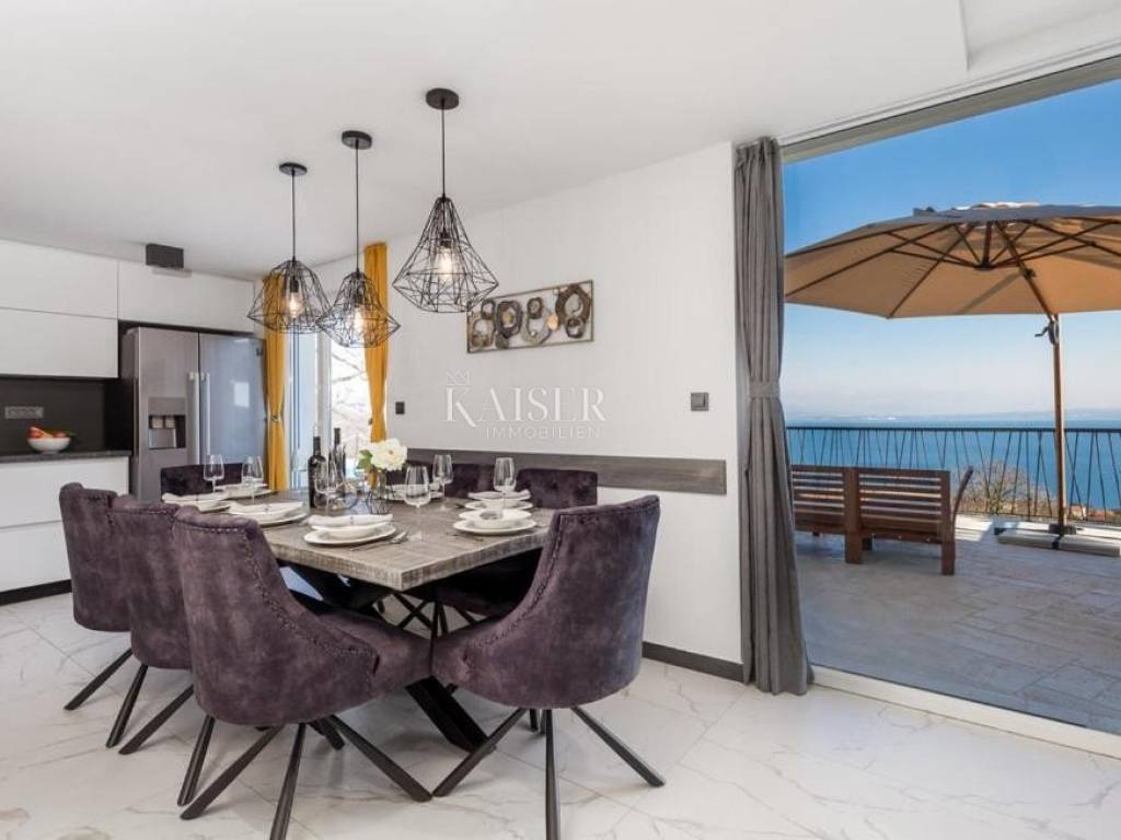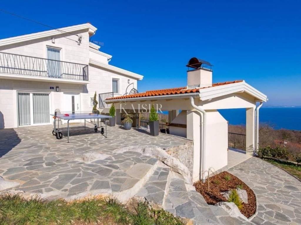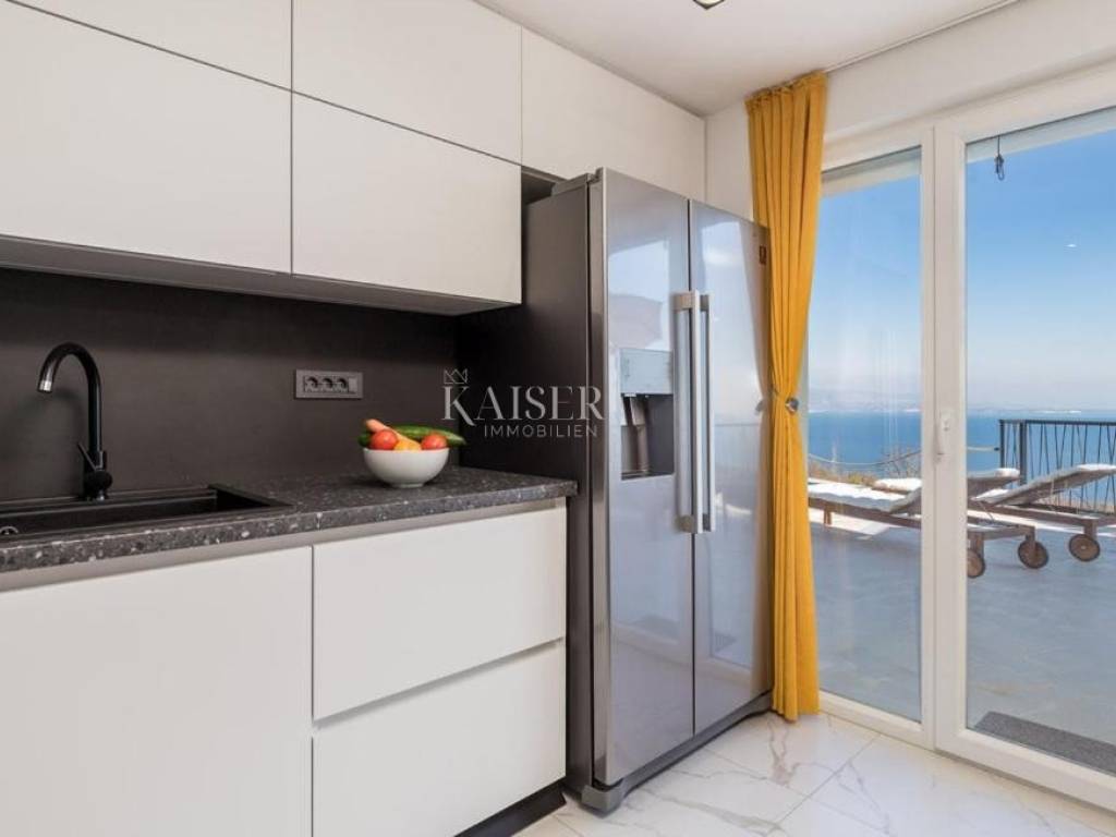 Kaiser Immobilien presents you a modern villa with an open view of the sea and the Kvarner Islands. It stands out with its modern design and clean lines that open the interior to the outside space with an incredible view of the sea. The exterior of the Villa has a children's playground, a private pool, a spacious sun deck, a covered outdoor kitchen with a grill for food preparation and a spacious table. On the terrace you can enjoy undisturbed reading a book, drinking your favorite drink with a fantastic open view of the sea. There is enough space for parking 5 cars on the beautifully landscaped garden. In the basement there is a fantastically designed and equipped kitchen, dining room and living room with direct access to the sun deck with pool. The floors on the ground floor are covered with modern tiles in a neutral color, which makes the space modern and easy to maintain. On the ground floor there is a spacious room with its own bathroom and access to the terrace. On the first floor there is a storage room and two spacious rooms with their own bathrooms. On the second floor is a spacious room with its own bathroom and its own balcony. There is also a small separate storage room next to the house. The villa is decorated with modern decoration and a particularly beautiful garden, which has been carefully maintained with lots of love, is abundant with Mediterranean plants and is surrounded by beautiful greenery. The villa offers a perfect combination of modern decoration, comfort and an ideal location, creating a perfect home for a relaxing and pleasant stay. For more detailed information, please contact the agent: Silvija Blažić Tel: +385 915 223 893 E-mail: silvija.blazic@kaiser-immobilien.hr