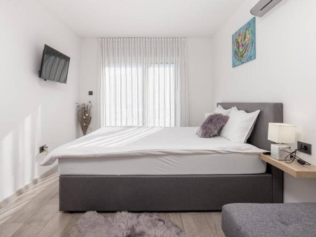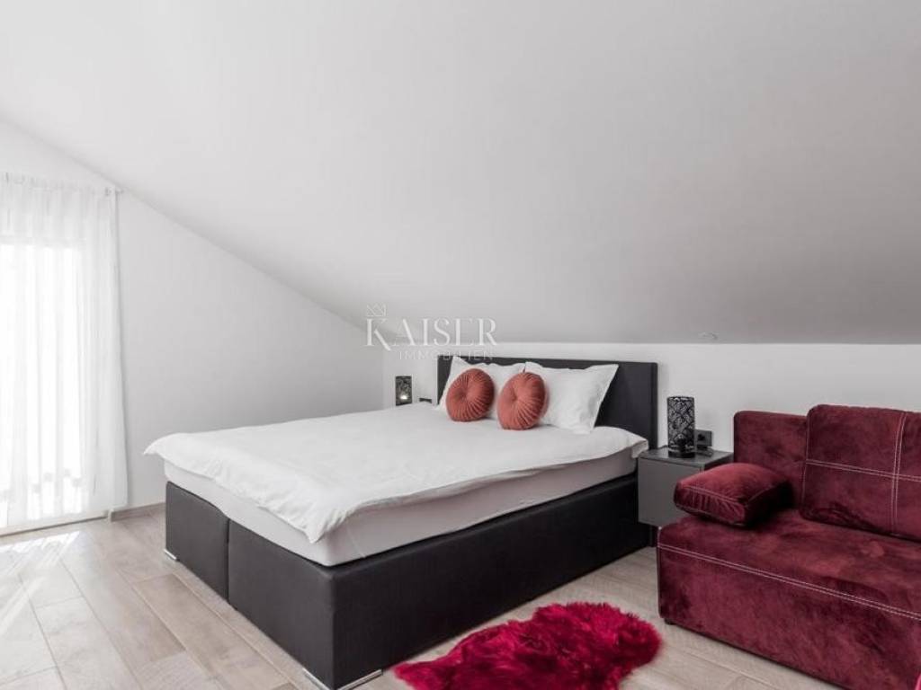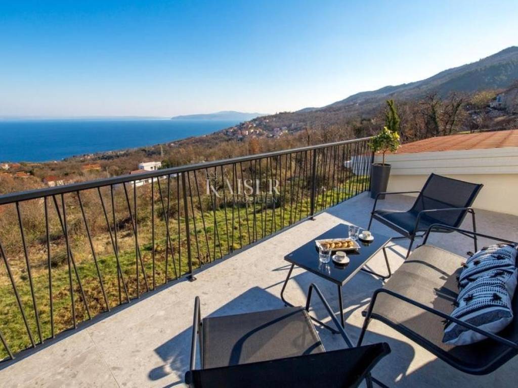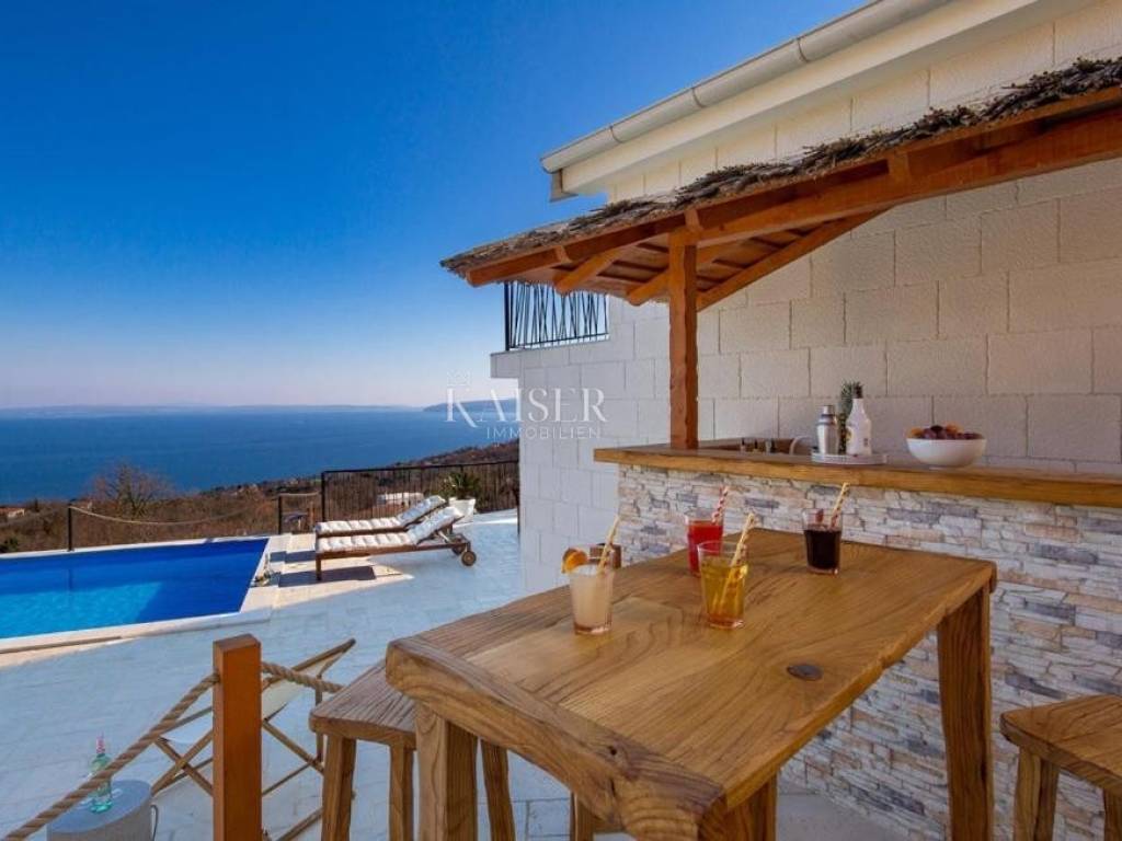 Kaiser Immobilien presents you a modern villa with an open view of the sea and the Kvarner Islands. It stands out with its modern design and clean lines that open the interior to the outside space with an incredible view of the sea. The exterior of the Villa has a children's playground, a private pool, a spacious sun deck, a covered outdoor kitchen with a grill for food preparation and a spacious table. On the terrace you can enjoy undisturbed reading a book, drinking your favorite drink with a fantastic open view of the sea. There is enough space for parking 5 cars on the beautifully landscaped garden. In the basement there is a fantastically designed and equipped kitchen, dining room and living room with direct access to the sun deck with pool. The floors on the ground floor are covered with modern tiles in a neutral color, which makes the space modern and easy to maintain. On the ground floor there is a spacious room with its own bathroom and access to the terrace. On the first floor there is a storage room and two spacious rooms with their own bathrooms. On the second floor is a spacious room with its own bathroom and its own balcony. There is also a small separate storage room next to the house. The villa is decorated with modern decoration and a particularly beautiful garden, which has been carefully maintained with lots of love, is abundant with Mediterranean plants and is surrounded by beautiful greenery. The villa offers a perfect combination of modern decoration, comfort and an ideal location, creating a perfect home for a relaxing and pleasant stay. For more detailed information, please contact the agent: Silvija Blažić Tel: +385 915 223 893 E-mail: silvija.blazic@kaiser-immobilien.hr