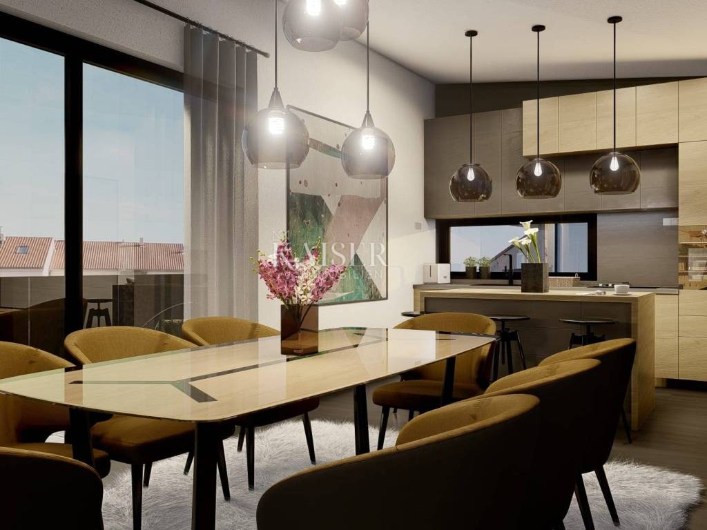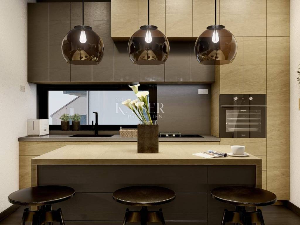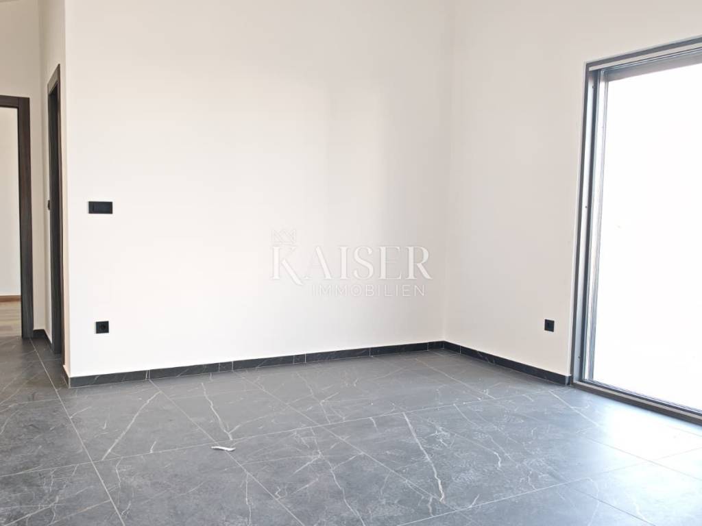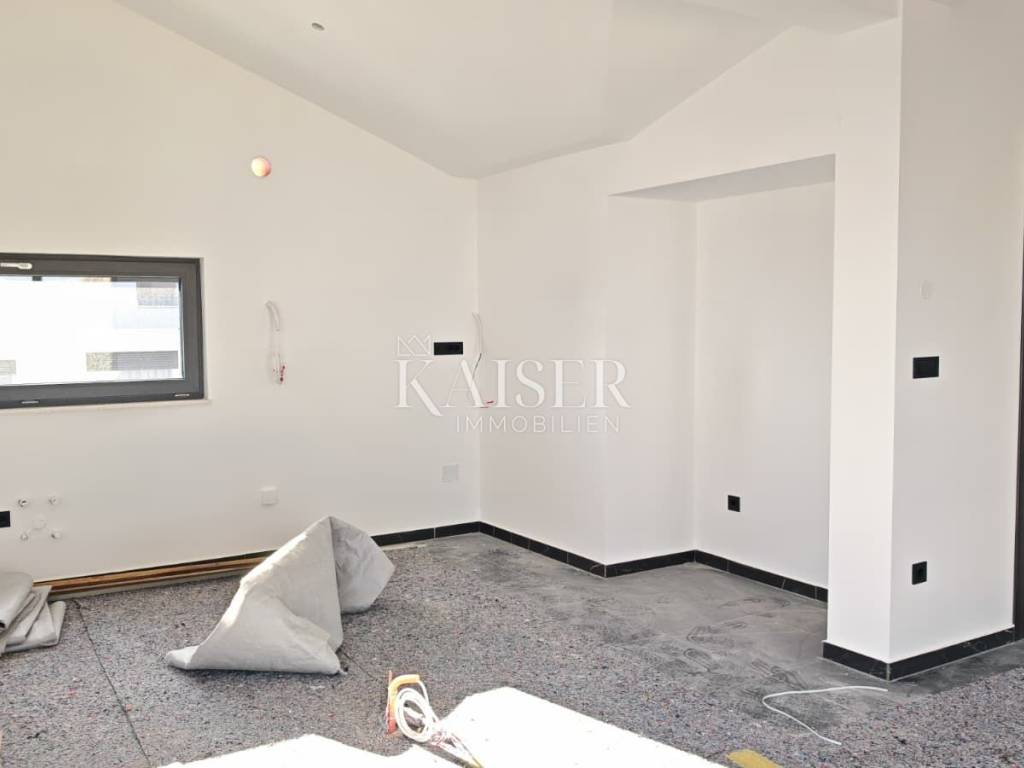 In the bay of the southwest coast of the island of Krk, there is the city of Krk, the main settlement on the island and one of the oldest settlements in Croatia. The city of Krk has been an urban center for more than 3,000 years and is also the cultural and administrative center of the island of Krk. Krk will delight you with a series of fascinating cultural monuments, a long history and beautiful beaches, and is a very pleasant place to live and to rest, even during the winter months. Kaiser Immobilien presents you a luxurious penthouse apartment of 91 m² of living space. The apartment is located on the second floor of an apartment building, only 800 m from the center of Krk. The apartment consists of a kitchen and dining room in one room of 27 m², next to which there is a storage room of 3 m². The kitchen and dining room have access to two terraces - one covered terrace of 16 m² and one uncovered terrace of 21 m² with a beautiful view of the sea. The corridor in the apartment leads to a spacious living room of 17 m², which has access to another balcony of 14 m². The apartment has a bathroom with a toilet and a shower and three bedrooms, one of which has an exit to the balcony, while the second room has its own bathroom with a toilet and a shower. Each room is equipped with underfloor heating, and the apartment is fully prepared for the installation of a heat pump. Additional amenities include air conditioning, intercom, PVC carpentry, burglar-proof entrance doors, high-quality ceramics and sanitary ware, and two parking spaces. The unique opportunity offered by this apartment is the possibility of monitoring the construction process, since the completion of the works is scheduled for the summer of 2025. The apartment is sold unfurnished, which allows the new owners to arrange it according to their own wishes. The proximity of all facilities offered by the City of Krk makes this apartment ideal for living and vacationing. Proximity to amenities: Restaurant: 600m Shop: 650m Beach: 900m Port: 900m Center: 800m Kindergarten: 600m School: 600m Clinic: 600m Bank: 700m Public transport: 400m Airport: 26 km Distances to major cities: Krk- Ljubljana: 150 km Krk - Budapest: 500 km Krk- Munich: 550 km Krk- Vienna: 520 km Krk- Prague: 850 km VAT is included in the price and the buyer does not pay real estate sales tax. The commission of the agency for the buyer is 3% + VAT and is paid in case purchase of real estate, when concluding the first legal act. ID-CODE: 127-011 If you want to visit the property in person, please contact: Jennifer Hofmann E-mail: jennifer@kaiser-immobilien.hr Phone: +385-91-515-0887 http://kaiser-immobilien.hr/