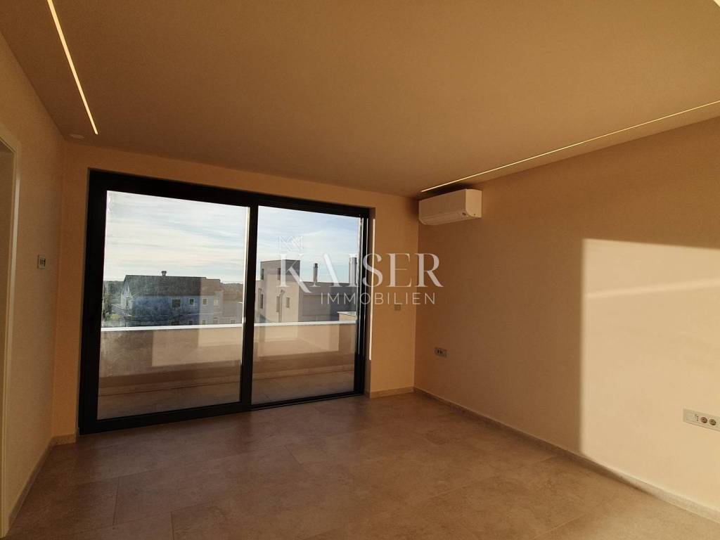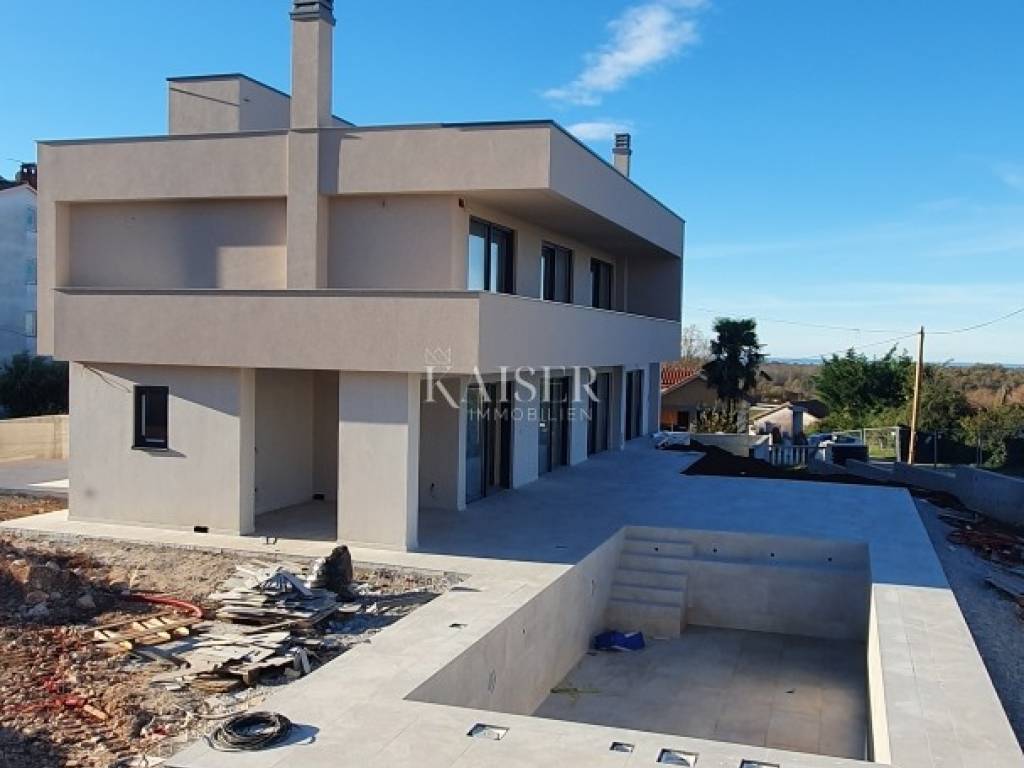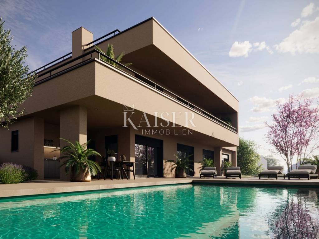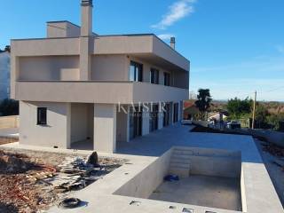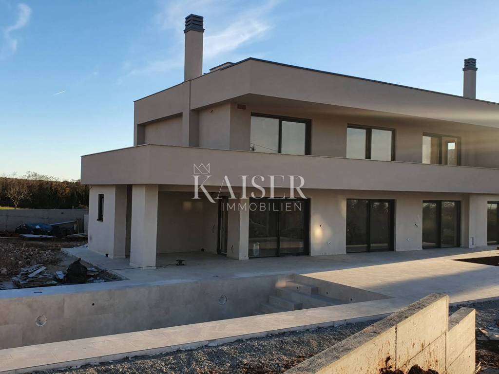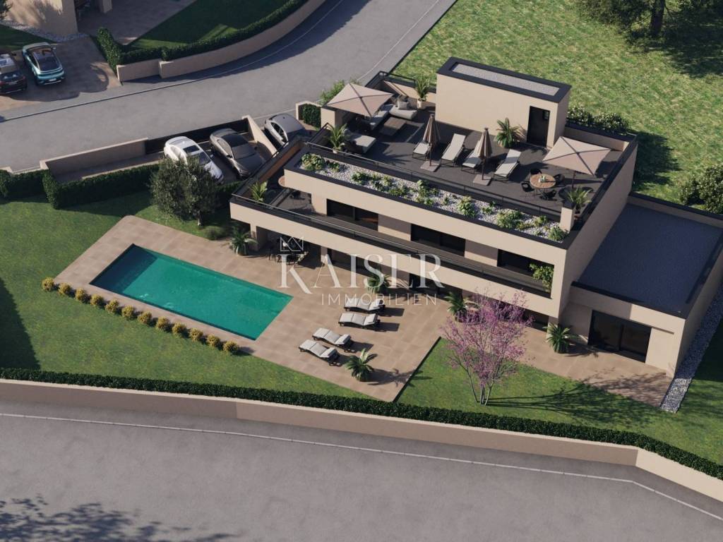 Kaiser Immobilien proudly presents a real beauty among villas., a modern and elegant villa with a swimming pool and sauna and with a beautiful view of the sea and the Austrian Alps. The villa is located in an ideal location only 10 km from the city of Poreč and the first beaches, and close to all the necessary amenities for life., market, school, kindergarten, restaurant that you will easily visit on foot without starting the car. This imposing villa stands gracefully as a detached building on a plot of 979 m2 and is surrounded by a quiet village, beautiful views and green areas. The area of the villa's inner net part is 240 m2, if we add the terraces we arrive at an area of 433 m2. The villa enchants with its perfect balance between contemporary design and modern elements. The exterior and interior of the villa are connected by a very modern design with a spacious and beautifully landscaped lawn with Mediterranean plants and a pleasant heated pool of 40 m2. The villa is a combination of modern design in a natural environment. The villa consists of a ground floor and a first floor, and the special feature of this villa is its spacious roof terrace, measuring 97 m2, which offers a breathtaking view of the sea, the Alps and the village around the villa. The ground floor of the villa is decorated with 1 bedroom with 1 bathroom and its own walk-in wardrobe, kitchen, living room, dining room, 1 guest toilet, storage room and a machine room that has an entrance from the outside and where everything is regulated for Daikin heat pumps, pool heating and underfloor heating. On the first floor of the villa there are 3 more bedrooms with 3 bathrooms, each room has an exit to a balcony, and one bedroom has another additional balcony for itself. Access to the terrace and to the floor inside the villa is provided by internal stairs, which lead to a spacious and beautiful roof terrace with a jacuzzi and sauna, with an irresistible view. The roof terrace provides the possibility of setting up other facilities to make your stay there unforgettable and even more enjoyable. The villa's courtyard will be landscaped with Mediterranean plants, and the entire yard is equipped with irrigation. There is a 40 m2 heated pool, a spacious sunbathing area around the pool and a summer kitchen. additional features: - 4 covered parking spaces, - anthracite black, PVC and aluminum joinery with electric lifts, - electric shutters - heated pool with counter-current swimming - jacuzzi and sauna - insulation - scale-free water softener - water heating - heat pumps Distance from the property to the town: Poreč - Pula Airport, 45 km Poreč - Ljubljana, 162 km Poreč - Vienna, 544 km Poreč - Prague, 868 km Poreč - Munich, 565 km If you are looking for your perfect villa, please contact us with confidence at the phone number 00385 923782803, or at the email address: ivana@kaiser-immobilien.hr. The agency commission is 3% + VAT, and is charged for the first legal act. The villa is subject to VAT and no additional tax is payable on it.