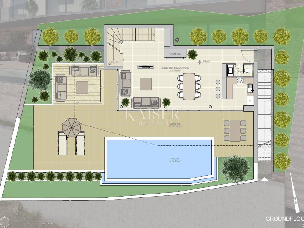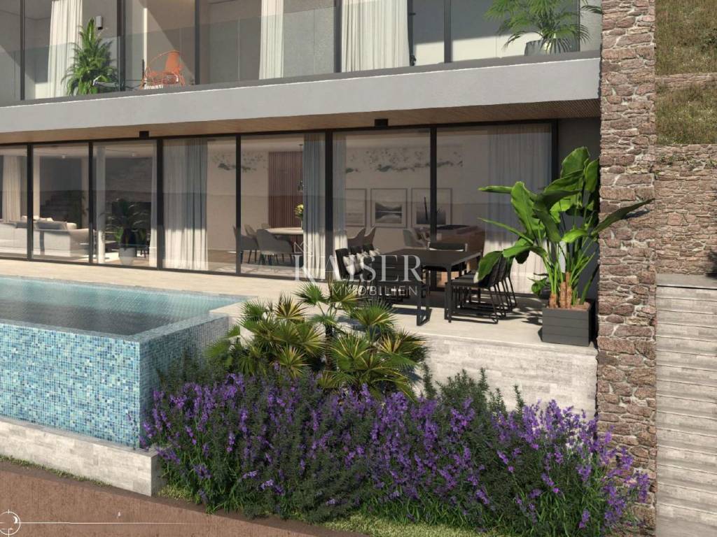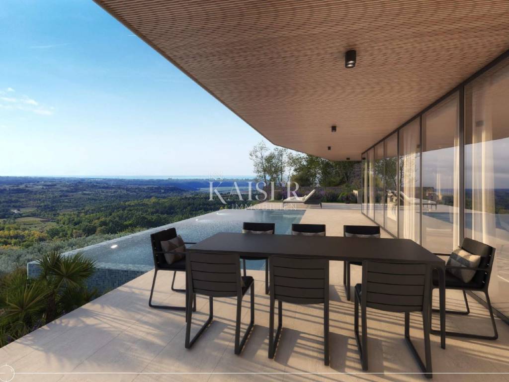 Kaiser Immobilien presents a villa with a swimming pool and a beautiful view in a small Istrian village near the town of Buje, which offers an experience of authentic Istria with olive groves and vineyards. The surroundings of the town of Buje are known to wine and olive oil lovers, but also to recreational athletes because, with hiking trails and the widely known Parenzana cycling trail, they provide them with opportunities for recreation and enjoyment. The villa is oriented to the south and is sunned from sunrise to sunset. It is 15 km from the sea, or 5 km from the center of the town of Buje and the old town core. Nearby is the famous town of Grožnjan, in the Mirna River valley, and numerous restaurants with a gastronomic offer based on the famous Istrian delicacy - truffles. Access to the villa is possible via the paved road that runs alongside it, but it does not disturb the peace and quiet because it is used only for local communication of a small number of locals. The villa has an area of 280 m2 and consists of: - Basement: garage for two vehicles, gym, technical rooms for the pool - Ground floor: spacious living room with kitchen and dining room, toilet, beautiful terrace of 104m2 with a large infinity pool of 35m2 - First floor: 3 more spacious bedrooms and 3 bathrooms; and a terrace with a beautiful view of 45m2 In addition to the generous space in the villa itself, this luxurious and spacious beauty also offers plenty of space outside: a spacious infinity pool with a view of the olive groves and more than 150m2 terrace for socializing, sunbathing... Experience authentic Istria with all the luxury you can have. Distance from the property: Pula Airport: 70 km Trieste Airport: 90 km Ljubljana: 130 km Vienna: 510 km Prague: 840 km Munich: 530 km The property is subject to VAT, so the buyer does not pay the 3% real estate transfer tax. The agency's commission for the buyer is 3% + VAT. The commission covers all services related to the purchase and is paid only in the case of purchasing a property, upon concluding the first legal act. If you want this luxurious villa with a beautiful view to become your new home, please contact us. Damir Mlacović e-mail: damir@kaiser-immobilien.hr tel: +385-98-339-933