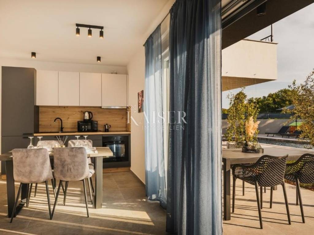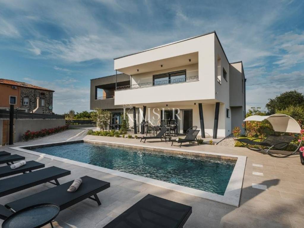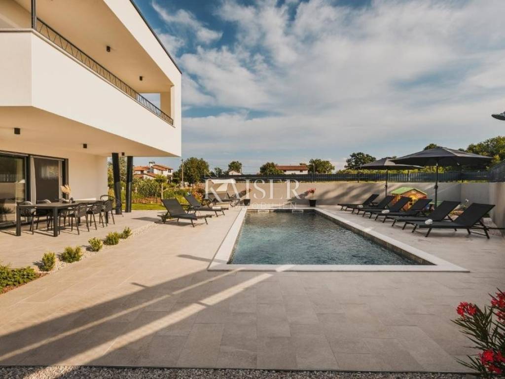 Kaiser Immobilen presents a new modern villa with three residential units and a beautiful swimming pool measuring 9.00 x 3.5 m. On the ground floor there are two smaller apartments of 46 m2 and 56 m2, while on the first floor there is a large apartment of 126 m2. The apartments are fully furnished and equipped with high-quality equipment. The villa is located only 5 kilometers from the city center and the most beautiful beaches. It is located in a quiet location, and only a few minutes from the sea and all necessary amenities. Umag in the northwest of the Istrian peninsula exudes the special charm of a Mediterranean city, in an area where the sea and land offer plenty of opportunities for adventure, sports experience and a wealth of tradition. Fertile Istrian soil and delicacies, crystal clear sea, mild Mediterranean climate and proximity to the hilly interior of Istria with cycling and trekking trails - make Umag an ideal destination throughout the year - for active holidays, excursionists and residents. Distance: Pula Airport - 80 km Ljubljana - 140 km Munich - 540 km Vienna - 520 km Prague - 850 km The agency commission for the buyer is 3% + VAT and is paid in the case of purchasing a property, upon conclusion of the first legal act. Do not miss the opportunity to become the owner of this beautiful home that offers the perfect blend of modern design, luxury and comfort. Contact us with confidence for more information and to arrange a viewing.