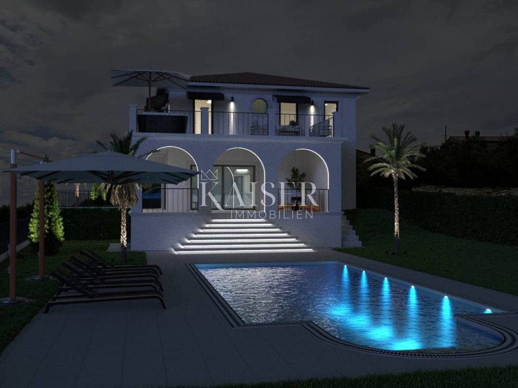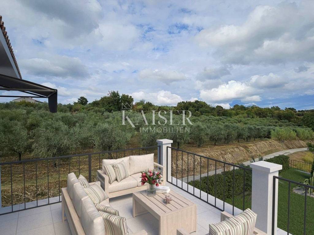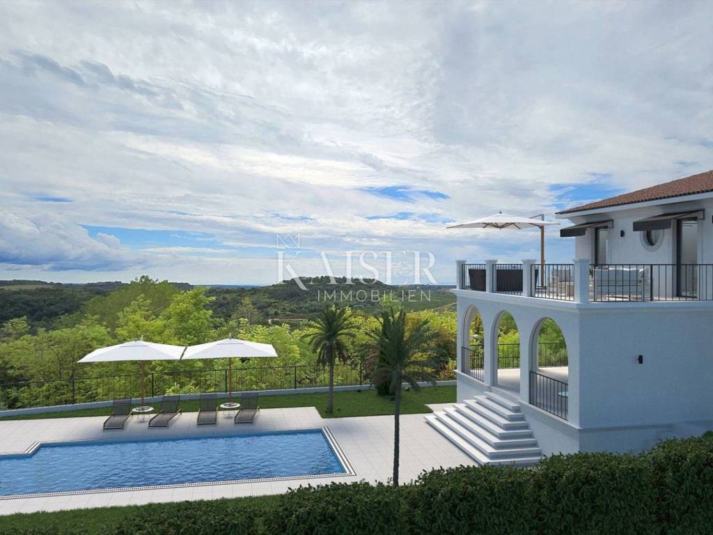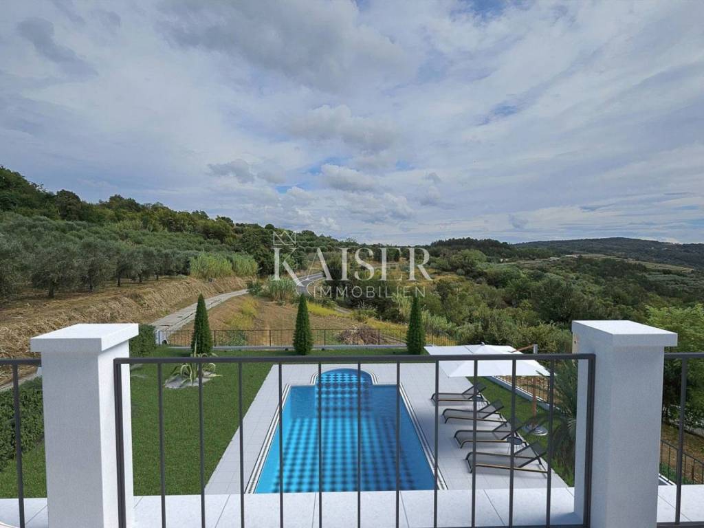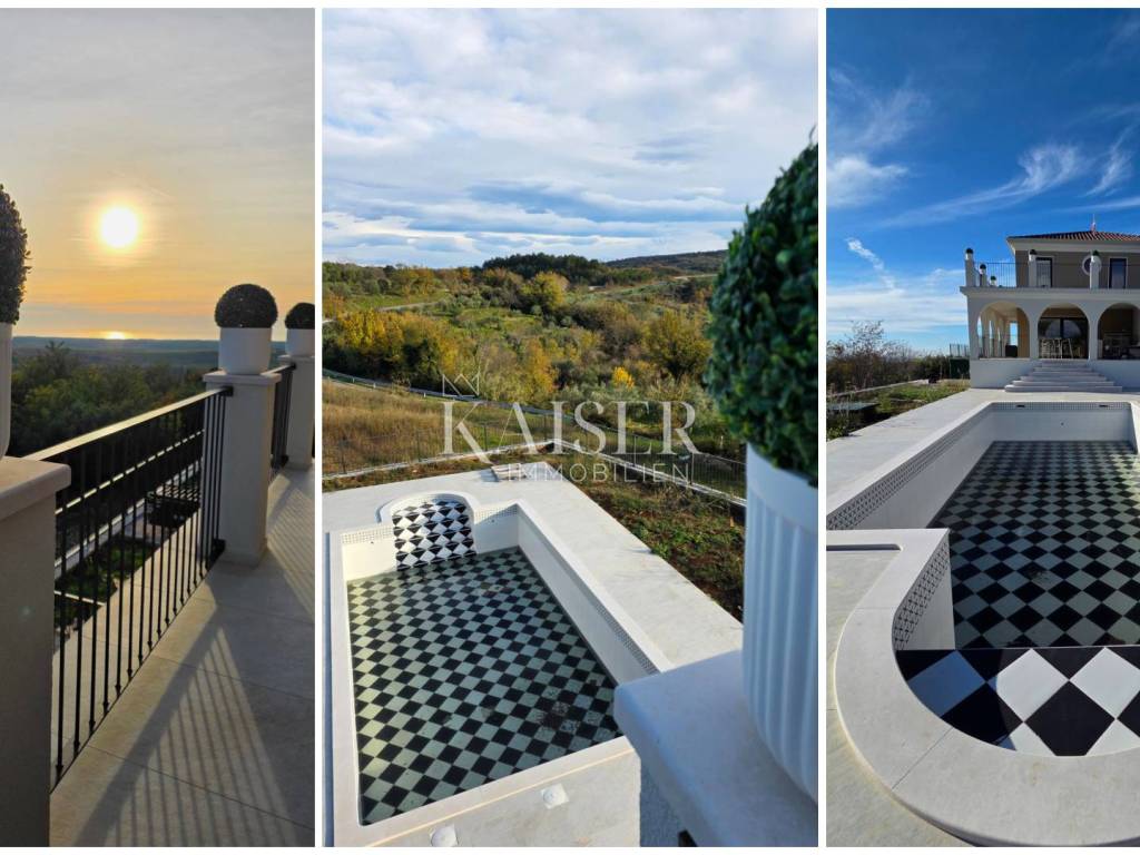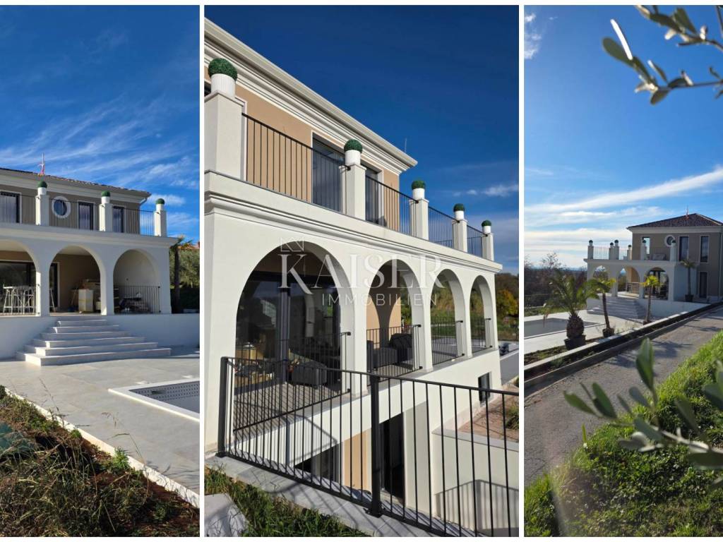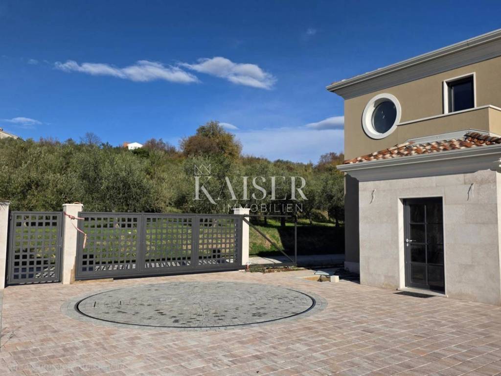 Kaiser Immobilien presents an attractive villa on the edge of the picturesque town of Buje, whose surroundings are known as a wine paradise with numerous vineyards and famous wineries. In Buje, in an extremely attractive location, a luxury villa with a swimming pool is for sale in the final phase of construction and decoration. It covers a total of 384 m2, of which 280 m2 is living space and 104 m2 of terrace. It consists of three floors, a basement, ground floor and first floor, and each room offers an irresistible view of the sea and olive groves. It includes 3 bedrooms with bathrooms, a kitchen and a living room, as well as unique content - an entertainment room, a cinema, a wine cellar, a spa, an additional kitchen (for support staff), a hidden panic room and a practical laundry storage system. The ground floor leads to a sunbathing area and an exceptionally designed swimming pool. At the back of the villa, there is a courtyard with several parking spaces and a rotating parking platform, which allows you to exit the courtyard by car without unnecessary maneuvering and reversing. The house is currently in the final stages of construction. The price is for a fully furnished property. If the buyer wants to furnish the house themselves, the price is reduced accordingly. Distance from the property to the town: Buje - Pula Airport, 76 km Buje - Trieste Airport, 87 km Buje - Ljubljana, 126 km Buje - Vienna, 507 km Buje - Prague, 833 km Buje - Munich, 528 km For more information and to arrange a viewing, please contact me at 00385 98339933 or at the email address: damir@kaiser-immobilien.hr The agency's commission for the buyer is 3% + VAT. The commission covers all services related to the purchase and is paid only in the case of purchasing a property, upon conclusion of the first legal act.