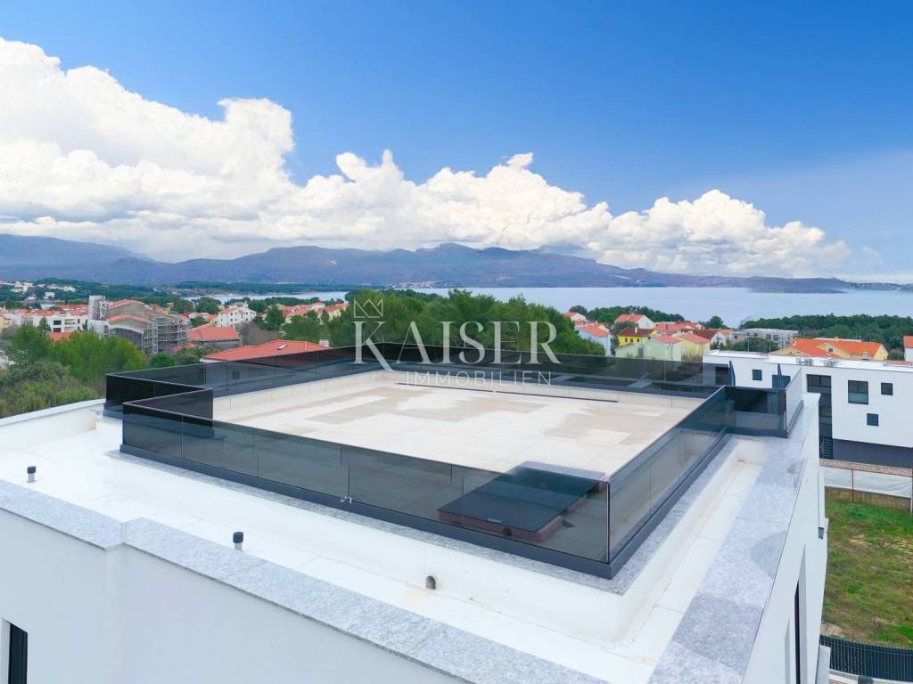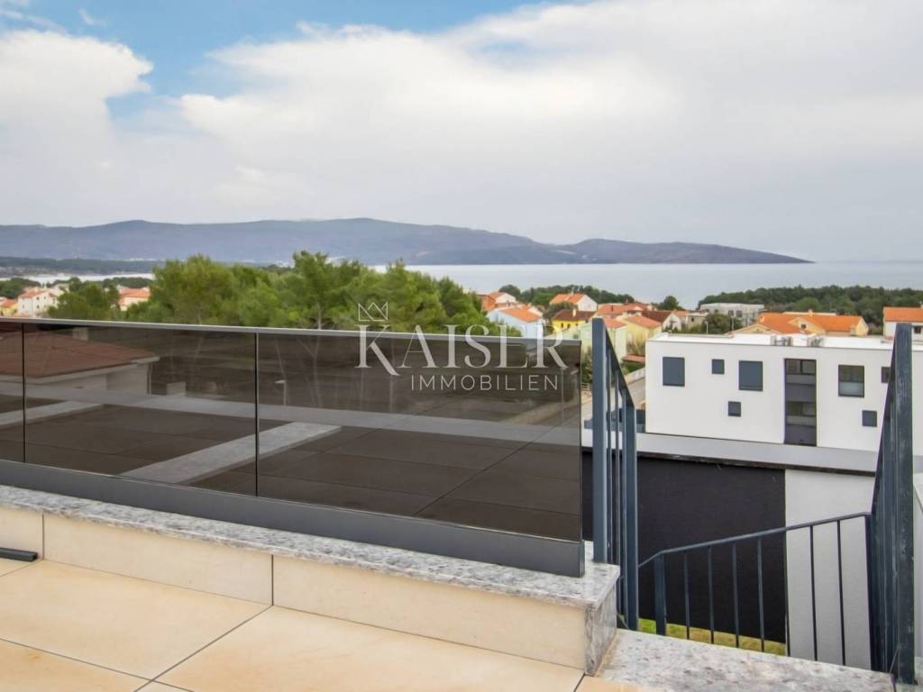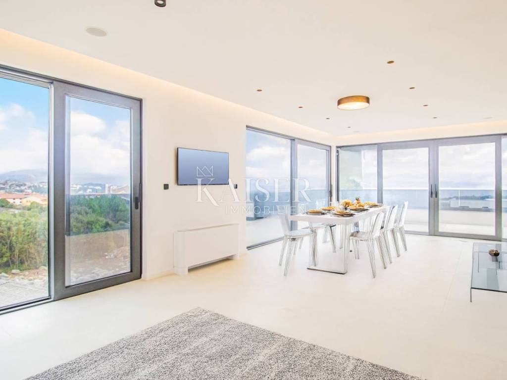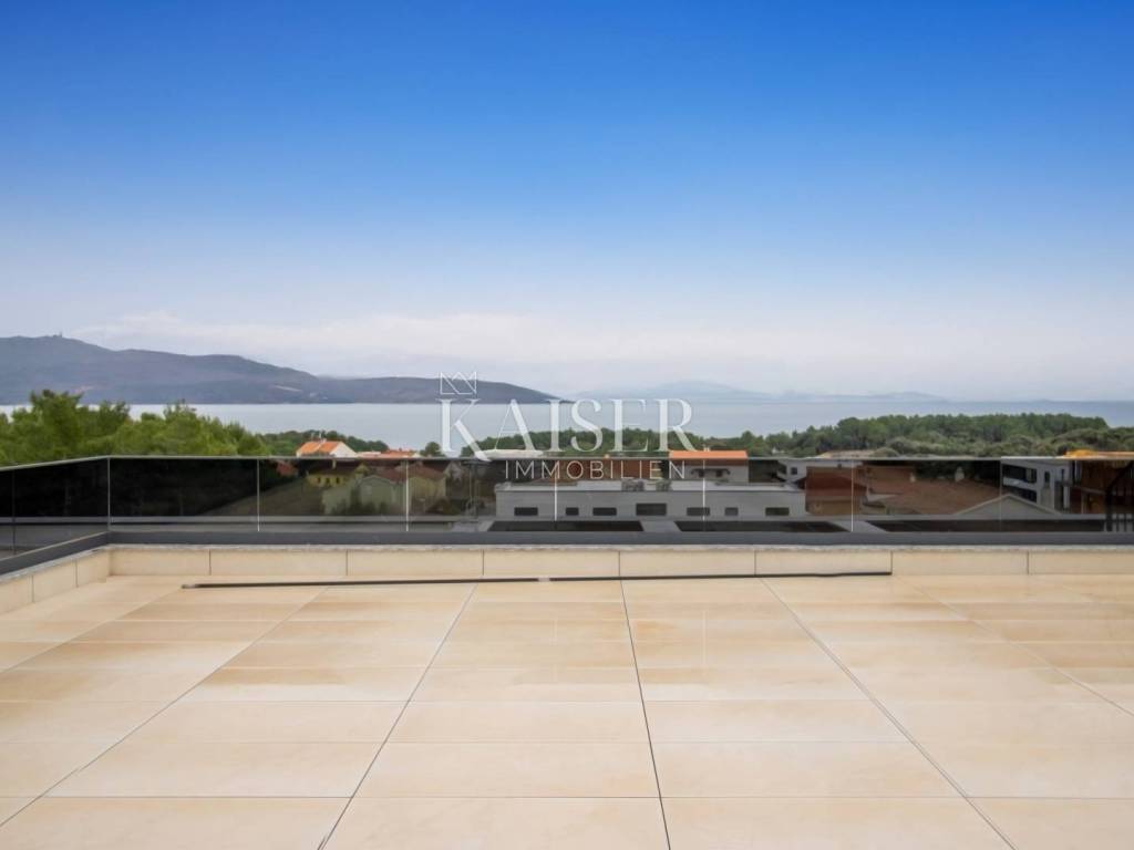 Kaiser immobilien is mediating the sale of an exclusive penthouse apartment in a very attractive location in the town of Krk. The penthouse is located on the second floor of a two-story house in a new building just 400m from the sea. The net area is 170m2 and includes an open space concept with a living room, kitchen and dining room of 53m2, three bedrooms, three bathrooms, a walk-in wardrobe, a storage room and a balcony of 38m2. The penthouse also has a roof terrace of 89m2 with preparations for a 21m2 swimming pool. The entire apartment offers a beautiful view of the sea, while the view from the balcony and especially the roof terrace is breathtaking. The apartment also has a storage room in the basement and two parking spaces. Top quality materials were used in the construction and furnishing, the exterior walls are well insulated with 15cm of thermal insulation, the highest quality ceramics have been installed, natural wood parquet floors in the rooms, stone stairs, a top quality lighting system and modern lighting fixtures, underfloor heating and cooling via fan coilers powered by heat pumps, massive aluminum joinery with mosquito nets and electric shutters. ID CODE 107-06 The agency commission for the buyer is 3% + VAT and is paid in the case of purchasing a property, upon conclusion of the first legal act.