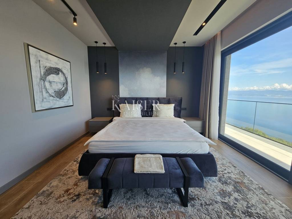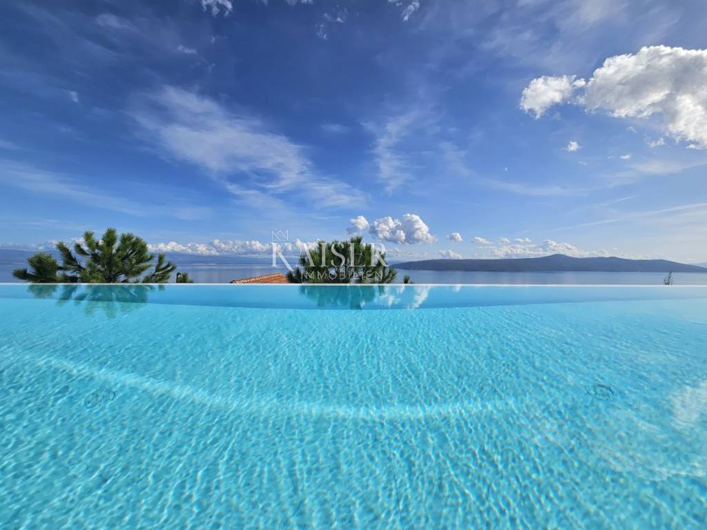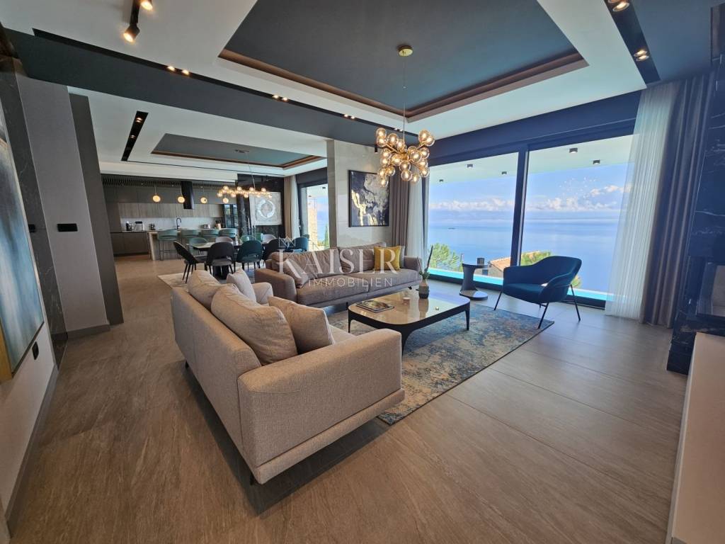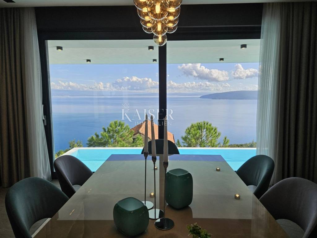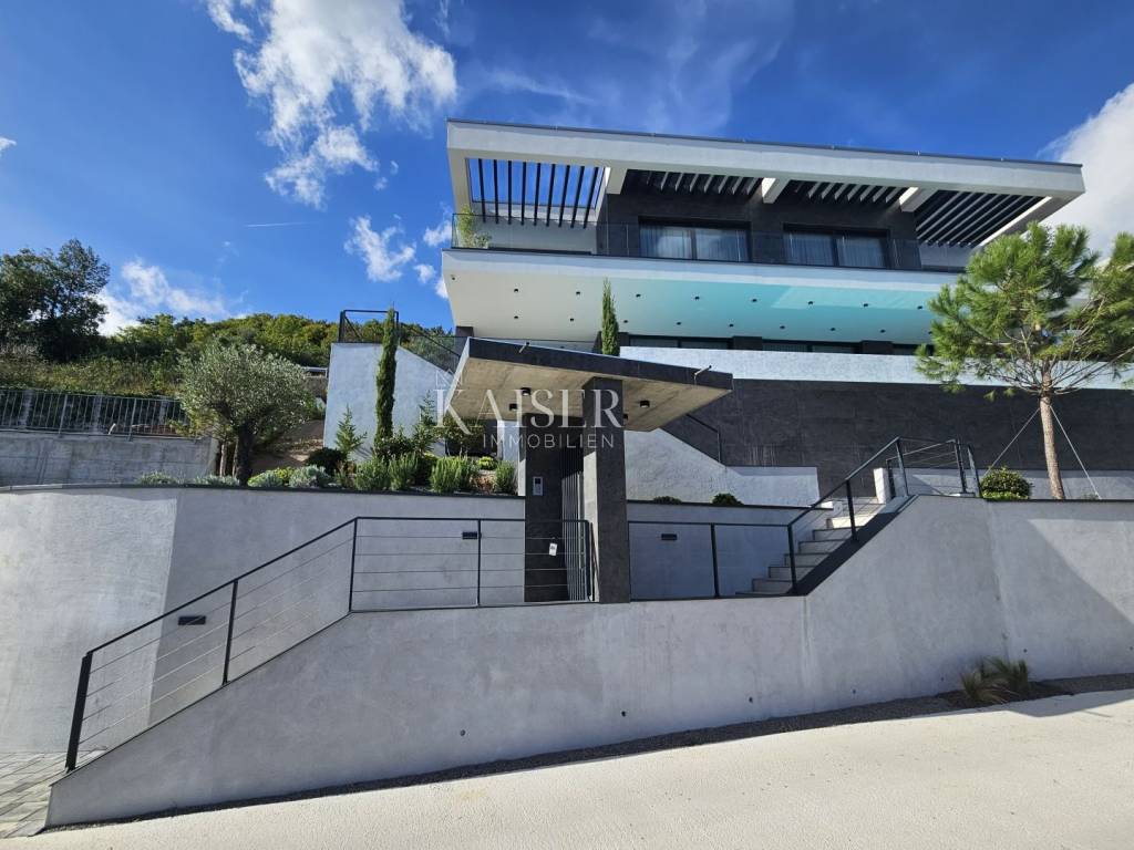 Kaiser immobilien is mediating the sale of this unique property, a luxury villa with panoramic sea views, located in the vicinity of Opatija, just 300m from the sea. If you are imagining your ideal villa by the sea, you don't need to think too much because this villa is designed exactly that - perfectly. The main guidelines for designing, building, furnishing and decorating were functionality, symmetry, airiness, luxury and timeless beauty, and they led to the ultimate goal - a villa that is at the very top of the real estate offer in this part of Europe. When designing this property, its location and placement on a slope facing the sea, as well as its southeast orientation, were taken into account first and foremost. Passing through all the rooms in the villa, you have the feeling that you are in a floating ship that, almost surreally, through large-format and exceptionally high-quality aluminum glass walls, outlines the harmonious blue of the sea and sky, and the green forest vegetation of the island on the southern horizon. The large overflow pool further enhances this impression of infinity, and the simple and soothing combination of water, sea and sky. The villa is located on a plot of 962m2 and is divided into two floors, with a total living area of 340m2. Upon entering the ground floor of the villa, you immediately notice the spacious glazed "open space" area that includes the kitchen, dining room and living room, and with its airiness and simplicity, it does not dominate the interior but allows you to enjoy the main content - the panoramic sea view. Only when you absorb the incredible energy of the environment and the endless sea view, does the eye notice the details that further enrich this property - designer furniture, impeccable lighting, top-quality equipment and harmoniously selected works of art. There is a wood-burning fireplace in the living room that further enriches the space and atmosphere, and on the ground floor there is also a guest toilet and a boiler room. The living room opens onto a spacious 40m2 terrace, which, together with a 70m2 sundeck, makes an exceptionally pleasant space to spend time in during the nicer weather, which is abundant in this area with 2230 hours of sunshine per year. A well-lit staircase leads to the first floor, which is designed as a sleeping area and contains 4 bedrooms with private bathrooms and a laundry room. When talking about the view from the ground floor, going upstairs opens up even more, and all bedrooms face the sea and the horizon, each with its own exit to a shared 45m2 terrace. Drinking your morning coffee or tea on the covered terrace surrounded by a glass fence and facing the sea is the perfect start to the day. Top-quality materials were used in the construction and furnishing, the entire house has underfloor heating with a heat pump, and a built-in air conditioning and ventilation system. Everything is controlled by thermostats located in the living area and in all rooms and bathrooms. The property has video surveillance, an anti-burglary system and a video intercom. In the landscaped garden, next to olive trees, pine trees and Mediterranean wild plants, there is a large heated overflow pool of 48m2. This place offers refreshment on summer evenings and a view of the starry sky. There are also four parking spaces in the garden. This property is the pinnacle of luxury real estate, and it is impossible to describe it in words, it must be experienced. It is being sold furnished and equipped with designer furniture. Note: the stated price of 1,870,000 euros is valid for the purchase of all business shares of the company that owns the property. In the case of purchasing a property, the asking price is 2,250,000 euros. The agency's commission for the buyer is 3% + VAT and is paid in the case of purchasing a property, upon concluding the first legal act. The buyer does not pay real estate transfer tax (3%).