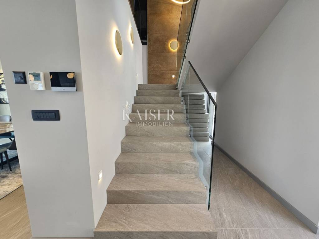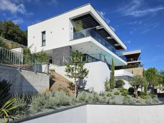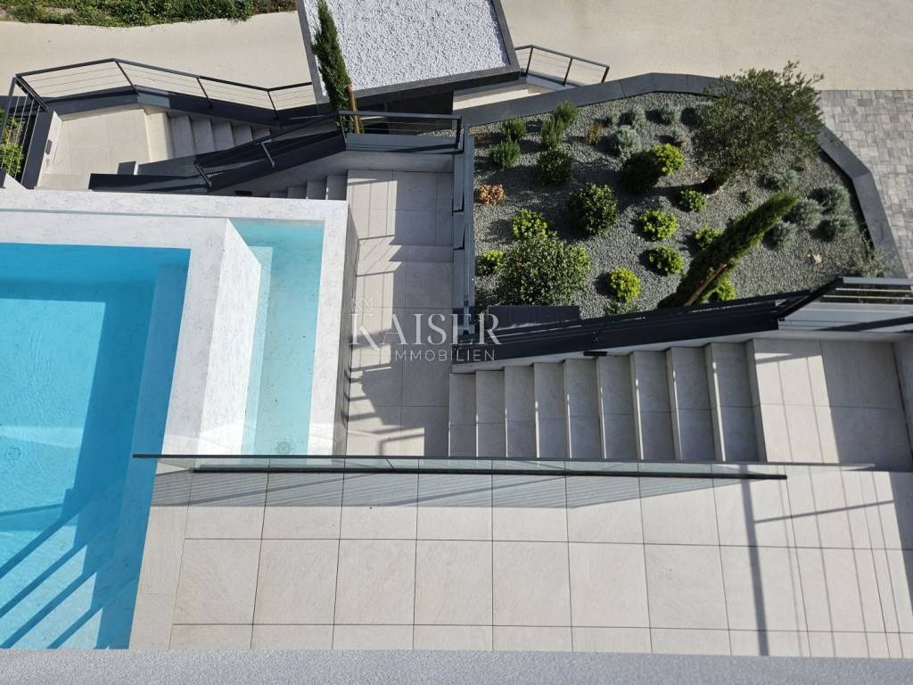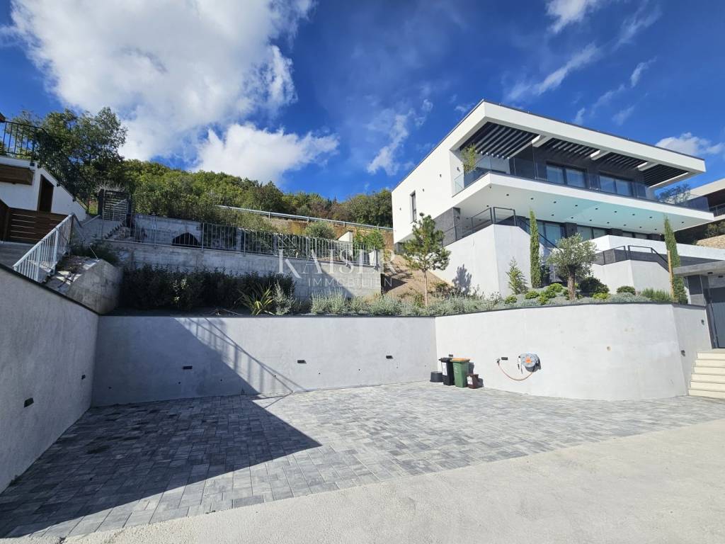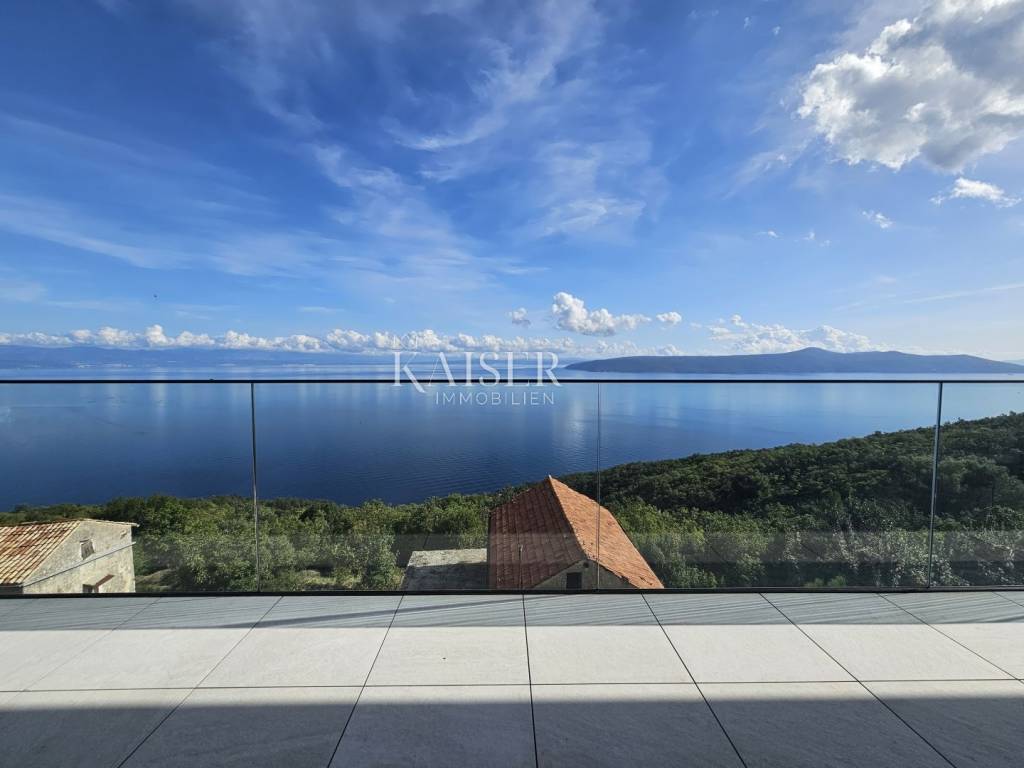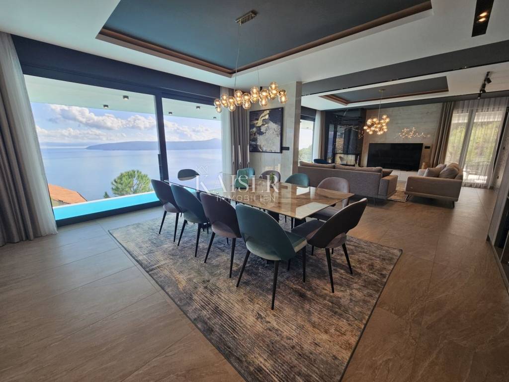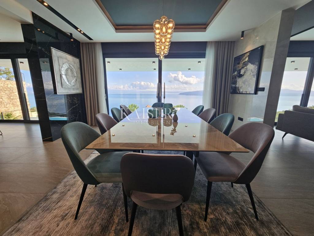 Kaiser immobilien is mediating the sale of this unique property, a luxury villa with panoramic sea views, located in the vicinity of Opatija, just 300m from the sea. If you are imagining your ideal villa by the sea, you don't need to think too much because this villa is designed exactly that - perfectly. The main guidelines for designing, building, furnishing and decorating were functionality, symmetry, airiness, luxury and timeless beauty, and they led to the ultimate goal - a villa that is at the very top of the real estate offer in this part of Europe. When designing this property, its location and placement on a slope facing the sea, as well as its southeast orientation, were taken into account first and foremost. Passing through all the rooms in the villa, you have the feeling that you are in a floating ship that, almost surreally, through large-format and exceptionally high-quality aluminum glass walls, outlines the harmonious blue of the sea and sky, and the green forest vegetation of the island on the southern horizon. The large overflow pool further enhances this impression of infinity, and the simple and soothing combination of water, sea and sky. The villa is located on a plot of 962m2 and is divided into two floors, with a total living area of 340m2. Upon entering the ground floor of the villa, you immediately notice the spacious glazed "open space" area that includes the kitchen, dining room and living room, and with its airiness and simplicity, it does not dominate the interior but allows you to enjoy the main content - the panoramic sea view. Only when you absorb the incredible energy of the environment and the endless sea view, does the eye notice the details that further enrich this property - designer furniture, impeccable lighting, top-quality equipment and harmoniously selected works of art. There is a wood-burning fireplace in the living room that further enriches the space and atmosphere, and on the ground floor there is also a guest toilet and a boiler room. The living room opens onto a spacious 40m2 terrace, which, together with a 70m2 sundeck, makes an exceptionally pleasant space to spend time in during the nicer weather, which is abundant in this area with 2230 hours of sunshine per year. A well-lit staircase leads to the first floor, which is designed as a sleeping area and contains 4 bedrooms with private bathrooms and a laundry room. When talking about the view from the ground floor, going upstairs opens up even more, and all bedrooms face the sea and the horizon, each with its own exit to a shared 45m2 terrace. Drinking your morning coffee or tea on the covered terrace surrounded by a glass fence and facing the sea is the perfect start to the day. Top-quality materials were used in the construction and furnishing, the entire house has underfloor heating with a heat pump, and a built-in air conditioning and ventilation system. Everything is controlled by thermostats located in the living area and in all rooms and bathrooms. The property has video surveillance, an anti-burglary system and a video intercom. In the landscaped garden, next to olive trees, pine trees and Mediterranean wild plants, there is a large heated overflow pool of 48m2. This place offers refreshment on summer evenings and a view of the starry sky. There are also four parking spaces in the garden. This property is the pinnacle of luxury real estate, and it is impossible to describe it in words, it must be experienced. It is being sold furnished and equipped with designer furniture. Note: the stated price of 1,870,000 euros is valid for the purchase of all business shares of the company that owns the property. In the case of purchasing a property, the asking price is 2,250,000 euros. The agency's commission for the buyer is 3% + VAT and is paid in the case of purchasing a property, upon concluding the first legal act. The buyer does not pay real estate transfer tax (3%).