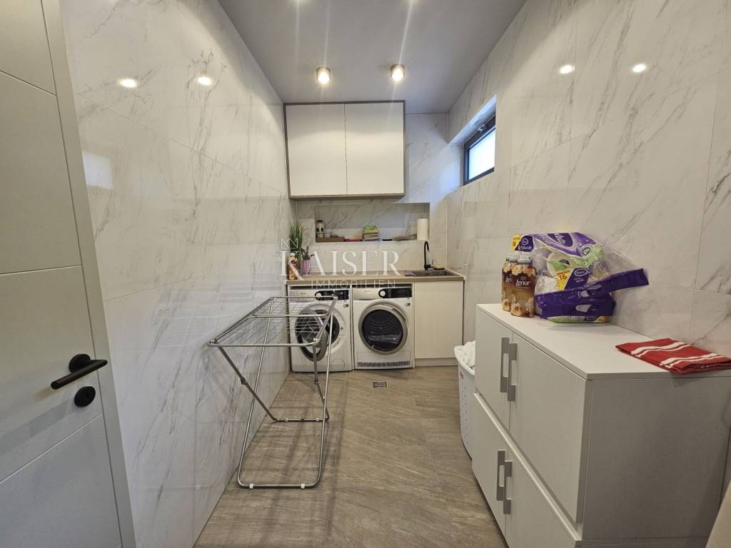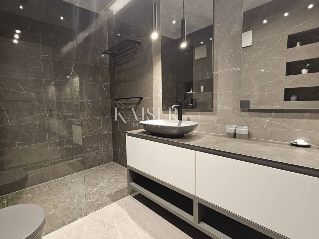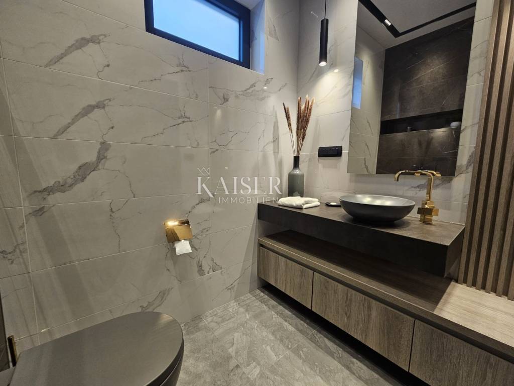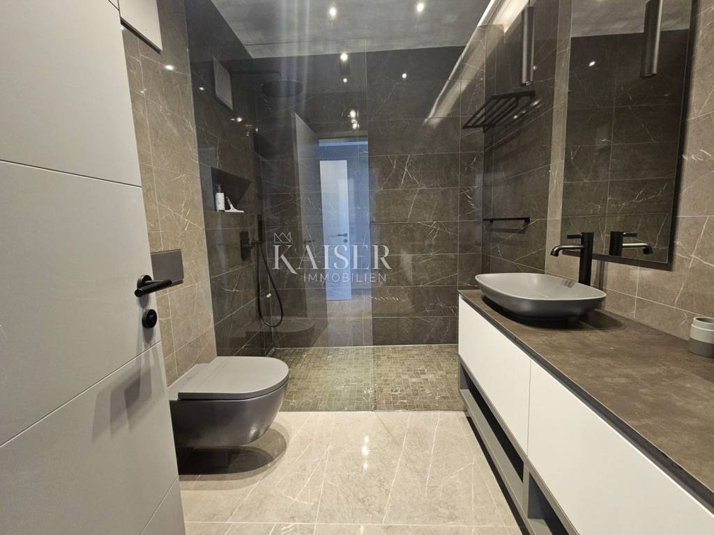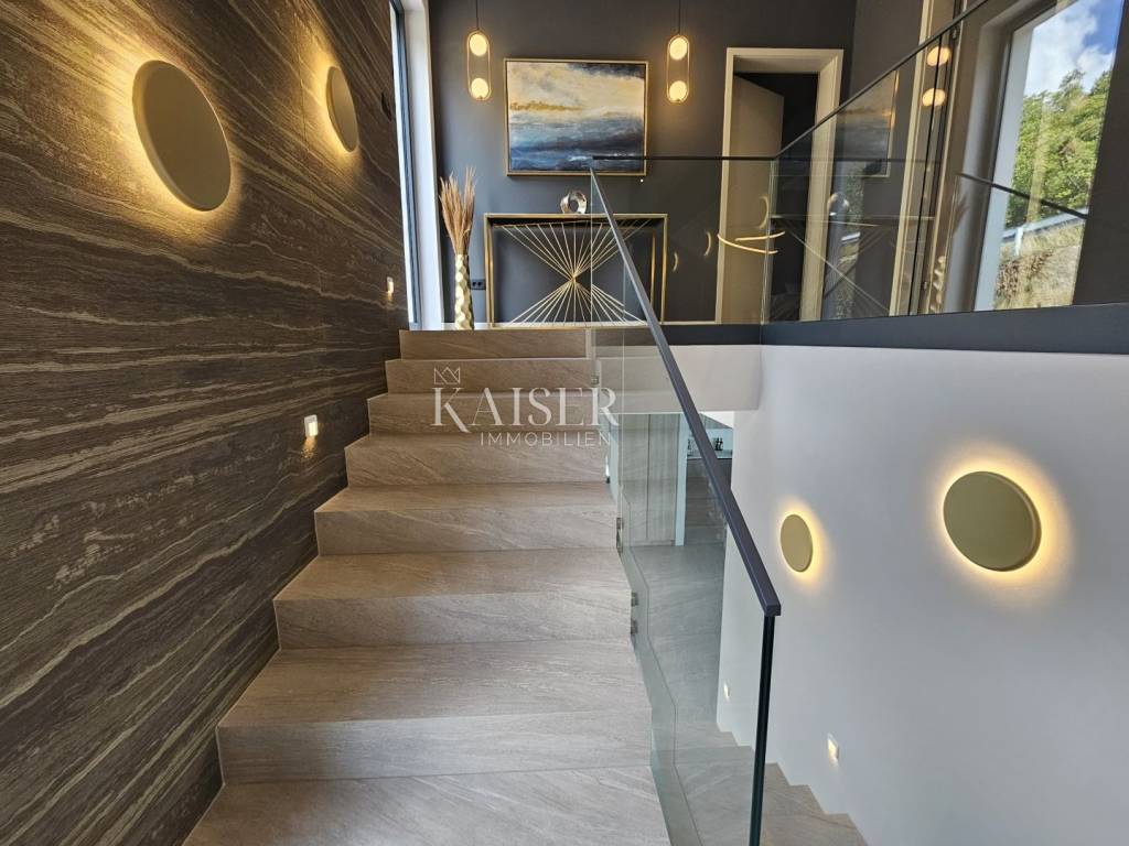 Kaiser immobilien is mediating the sale of this unique property, a luxury villa with panoramic sea views, located in the vicinity of Opatija, just 300m from the sea. If you are imagining your ideal villa by the sea, you don't need to think too much because this villa is designed exactly that - perfectly. The main guidelines for designing, building, furnishing and decorating were functionality, symmetry, airiness, luxury and timeless beauty, and they led to the ultimate goal - a villa that is at the very top of the real estate offer in this part of Europe. When designing this property, its location and placement on a slope facing the sea, as well as its southeast orientation, were taken into account first and foremost. Passing through all the rooms in the villa, you have the feeling that you are in a floating ship that, almost surreally, through large-format and exceptionally high-quality aluminum glass walls, outlines the harmonious blue of the sea and sky, and the green forest vegetation of the island on the southern horizon. The large overflow pool further enhances this impression of infinity, and the simple and soothing combination of water, sea and sky. The villa is located on a plot of 962m2 and is divided into two floors, with a total living area of 340m2. Upon entering the ground floor of the villa, you immediately notice the spacious glazed "open space" area that includes the kitchen, dining room and living room, and with its airiness and simplicity, it does not dominate the interior but allows you to enjoy the main content - the panoramic sea view. Only when you absorb the incredible energy of the environment and the endless sea view, does the eye notice the details that further enrich this property - designer furniture, impeccable lighting, top-quality equipment and harmoniously selected works of art. There is a wood-burning fireplace in the living room that further enriches the space and atmosphere, and on the ground floor there is also a guest toilet and a boiler room. The living room opens onto a spacious 40m2 terrace, which, together with a 70m2 sundeck, makes an exceptionally pleasant space to spend time in during the nicer weather, which is abundant in this area with 2230 hours of sunshine per year. A well-lit staircase leads to the first floor, which is designed as a sleeping area and contains 4 bedrooms with private bathrooms and a laundry room. When talking about the view from the ground floor, going upstairs opens up even more, and all bedrooms face the sea and the horizon, each with its own exit to a shared 45m2 terrace. Drinking your morning coffee or tea on the covered terrace surrounded by a glass fence and facing the sea is the perfect start to the day. Top-quality materials were used in the construction and furnishing, the entire house has underfloor heating with a heat pump, and a built-in air conditioning and ventilation system. Everything is controlled by thermostats located in the living area and in all rooms and bathrooms. The property has video surveillance, an anti-burglary system and a video intercom. In the landscaped garden, next to olive trees, pine trees and Mediterranean wild plants, there is a large heated overflow pool of 48m2. This place offers refreshment on summer evenings and a view of the starry sky. There are also four parking spaces in the garden. This property is the pinnacle of luxury real estate, and it is impossible to describe it in words, it must be experienced. It is being sold furnished and equipped with designer furniture. Note: the stated price of 1,870,000 euros is valid for the purchase of all business shares of the company that owns the property. In the case of purchasing a property, the asking price is 2,250,000 euros. The agency's commission for the buyer is 3% + VAT and is paid in the case of purchasing a property, upon concluding the first legal act. The buyer does not pay real estate transfer tax (3%).