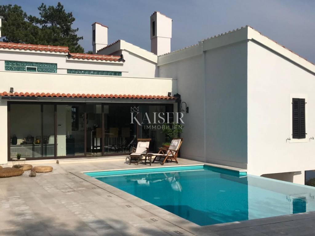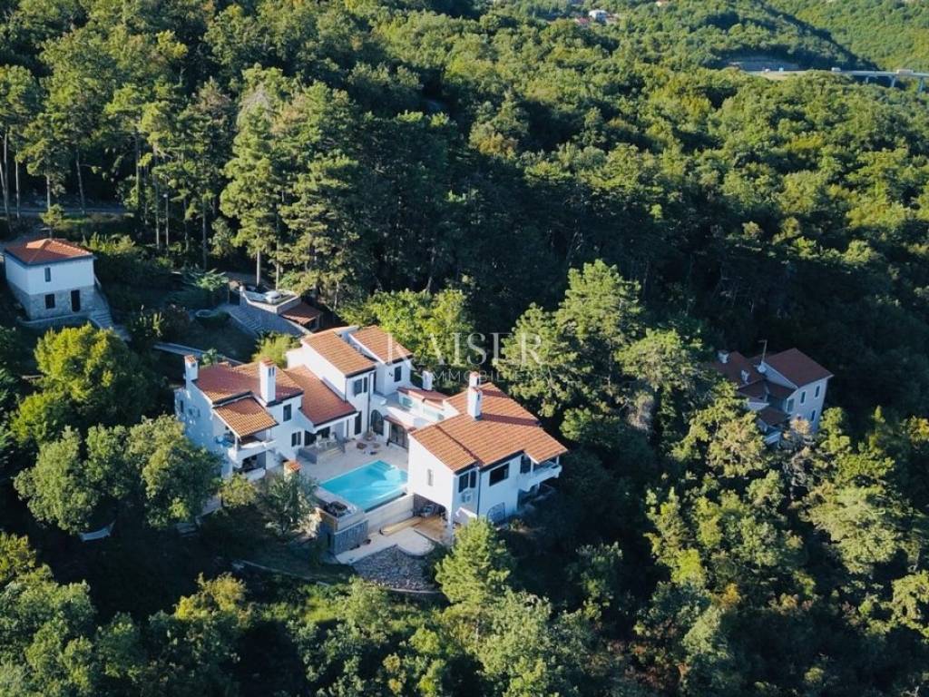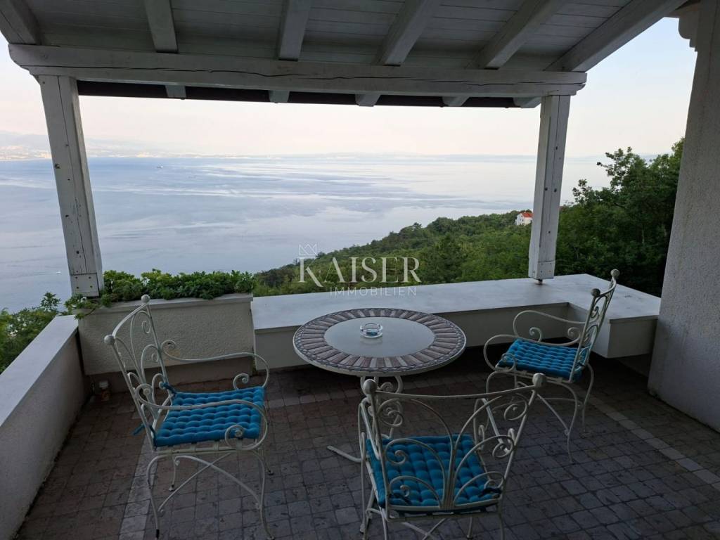 In a quiet location, in a village surrounded by greenery, an elegant villa with a swimming pool and a beautiful, uninterrupted panoramic view of the sea and the Kvarner Bay is for sale.