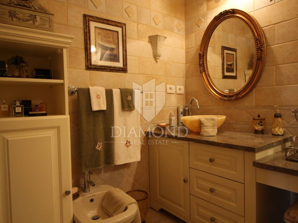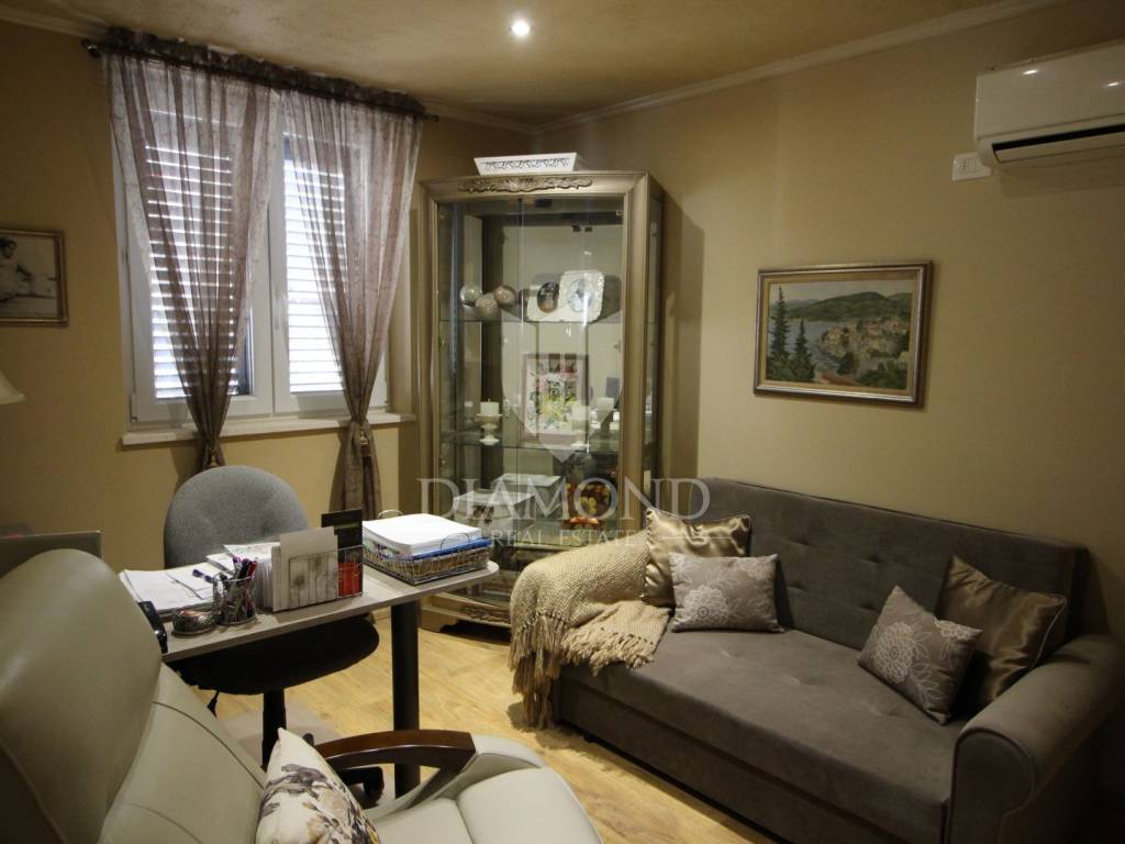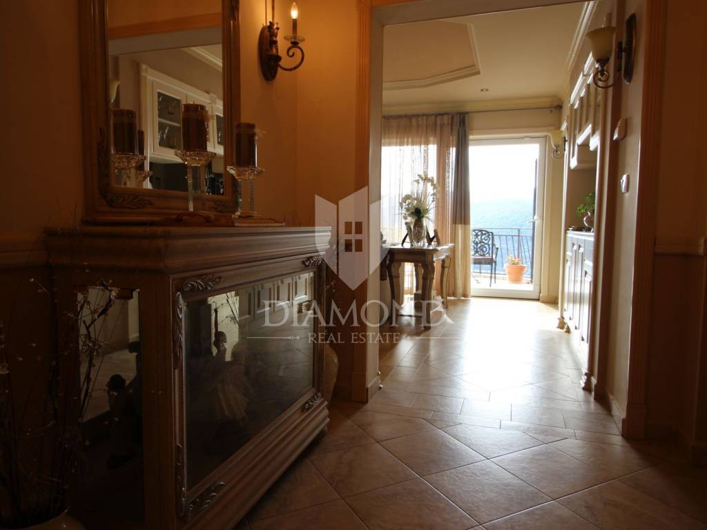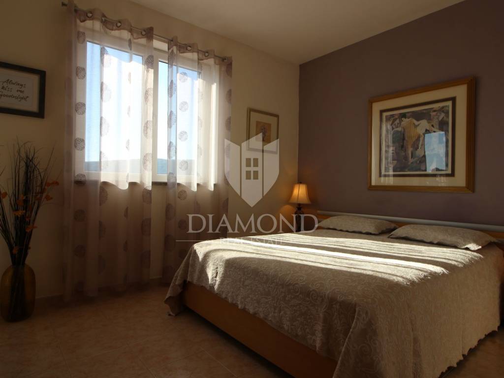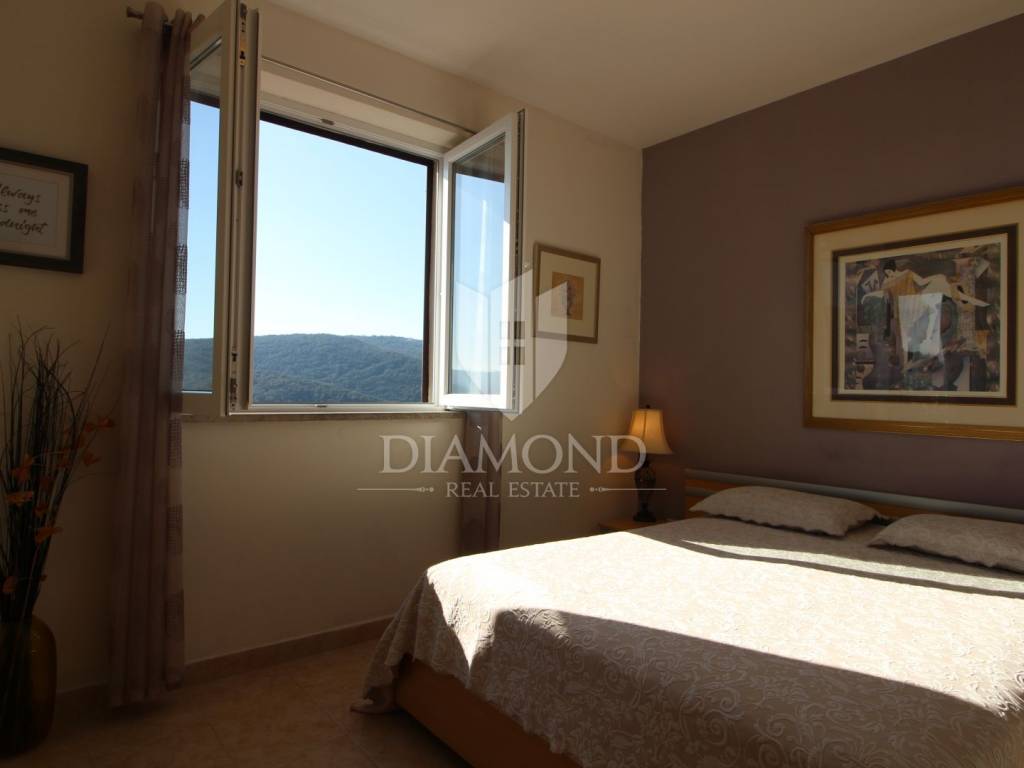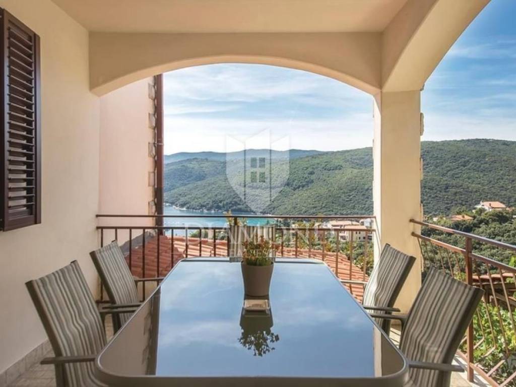 On a small hill not far from the town of Labin is this detached house with a priceless sea view. The house has a total area of 493 square meters, built on a plot of 662 square meters. It consists of a basement, ground floor and first floor. In the basement there is a kitchen, two bedrooms, a bathroom, a laundry room and a terrace with an open view of the sea. There are two separate apartments on the ground floor, which can be connected through a common entrance if there is a larger family in them. Apartments bring good income when renting out tourists. In one apartment, which was completely renovated in 2022, there is a kitchen, two bedrooms, two bathrooms, and a terrace with a priceless view of the sea. In the second apartment there is a kitchen, two bedrooms, a bathroom and two terraces, one of which offers a priceless view of the sea. From the second terrace, there is a partially open view of the sea and the view of the Old Town of Labin. It is ideal for evening get-togethers with your favorite summer drink. On the first floor there is a kitchen, living room, dining room, two bedrooms, bathroom and two terraces. One terrace offers a beautiful view of the sea, and the other offers a view of the sea and the Old Town of Labin. The second terrace is ideal for family get-togethers with family and friends. Behind the house in the garden, where there is a large terrace, there is the possibility of building a summer kitchen and setting up a barbecue. In front of the house on a spacious garden, there is the possibility of building a swimming pool that would offer a beautiful view of the sea. The issue of heating and cooling was solved by installing air conditioners and gas central heating. Parking for four cars is provided. The house is worth noting because of its location near the sea and the extraordinary view of Kvarner and the nearby islands. The property is ideal for an established tourist investment or family life.