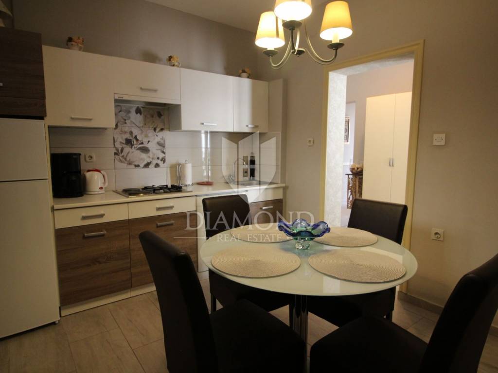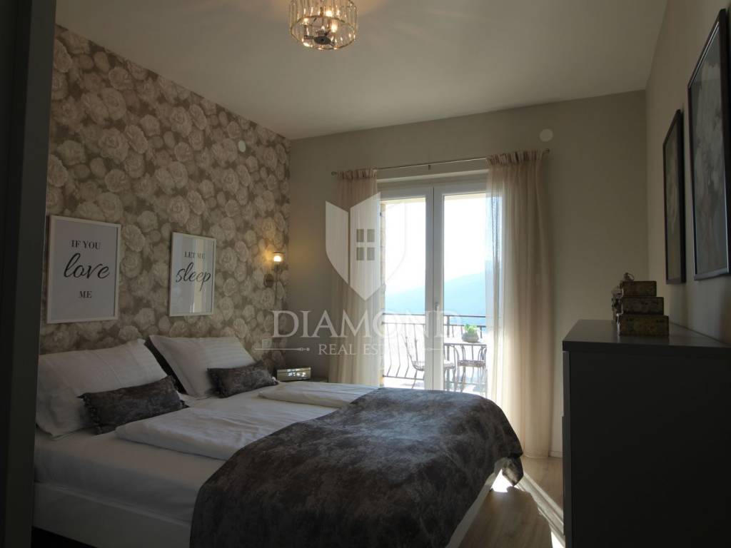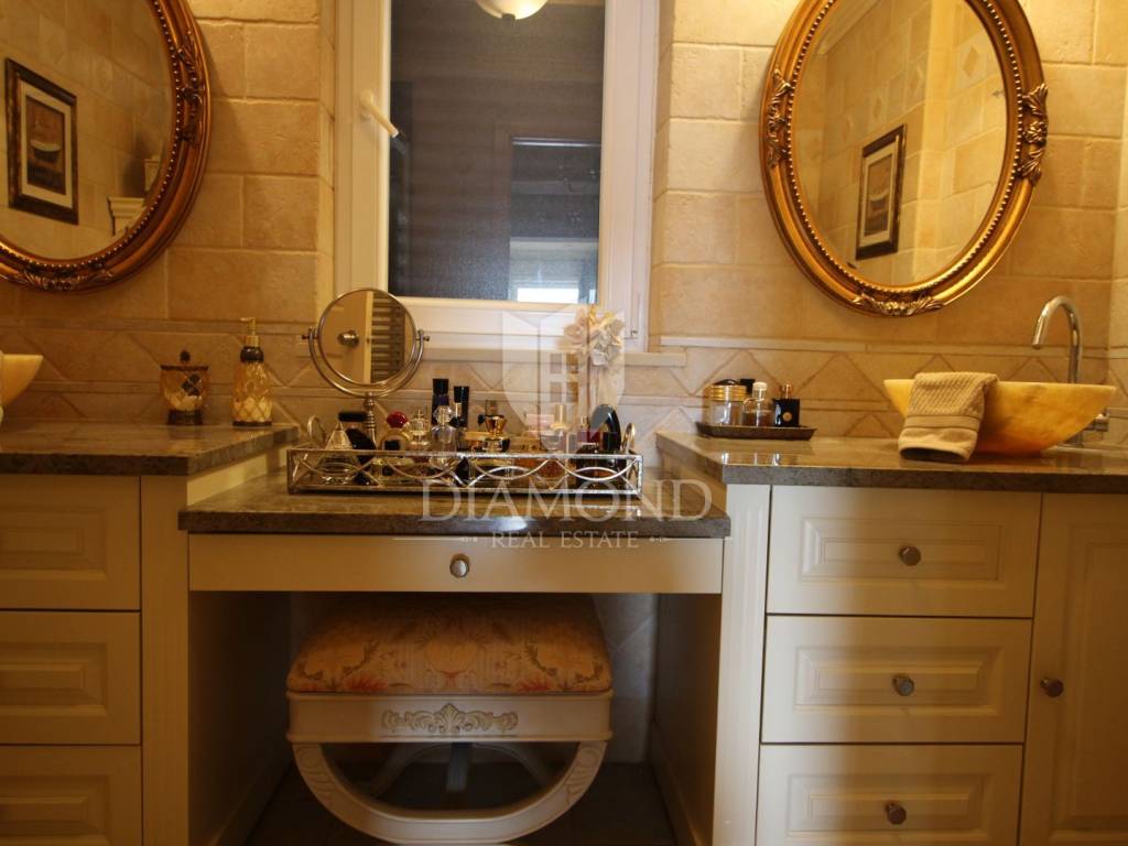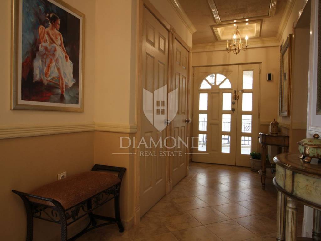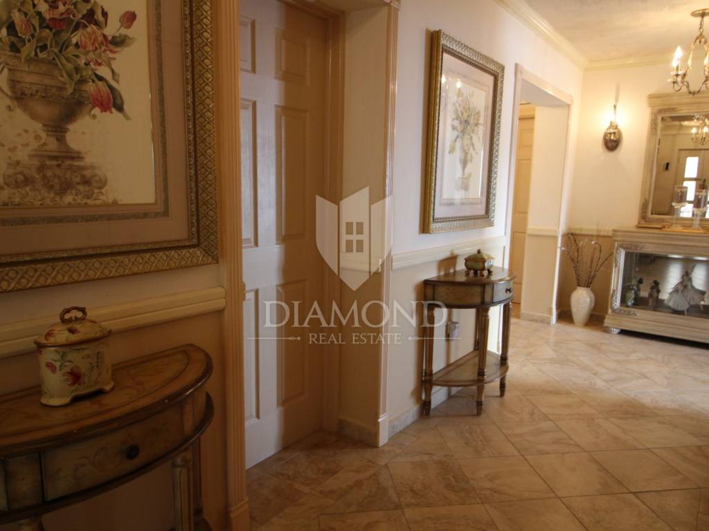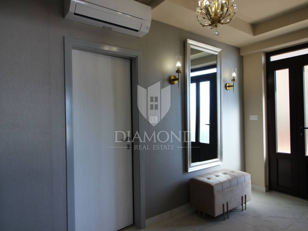 On a small hill not far from the town of Labin is this detached house with a priceless sea view. The house has a total area of 493 square meters, built on a plot of 662 square meters. It consists of a basement, ground floor and first floor. In the basement there is a kitchen, two bedrooms, a bathroom, a laundry room and a terrace with an open view of the sea. There are two separate apartments on the ground floor, which can be connected through a common entrance if there is a larger family in them. Apartments bring good income when renting out tourists. In one apartment, which was completely renovated in 2022, there is a kitchen, two bedrooms, two bathrooms, and a terrace with a priceless view of the sea. In the second apartment there is a kitchen, two bedrooms, a bathroom and two terraces, one of which offers a priceless view of the sea. From the second terrace, there is a partially open view of the sea and the view of the Old Town of Labin. It is ideal for evening get-togethers with your favorite summer drink. On the first floor there is a kitchen, living room, dining room, two bedrooms, bathroom and two terraces. One terrace offers a beautiful view of the sea, and the other offers a view of the sea and the Old Town of Labin. The second terrace is ideal for family get-togethers with family and friends. Behind the house in the garden, where there is a large terrace, there is the possibility of building a summer kitchen and setting up a barbecue. In front of the house on a spacious garden, there is the possibility of building a swimming pool that would offer a beautiful view of the sea. The issue of heating and cooling was solved by installing air conditioners and gas central heating. Parking for four cars is provided. The house is worth noting because of its location near the sea and the extraordinary view of Kvarner and the nearby islands. The property is ideal for an established tourist investment or family life.
