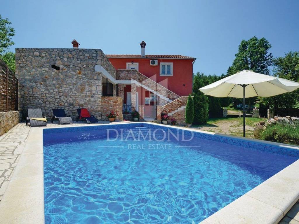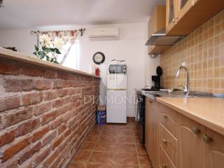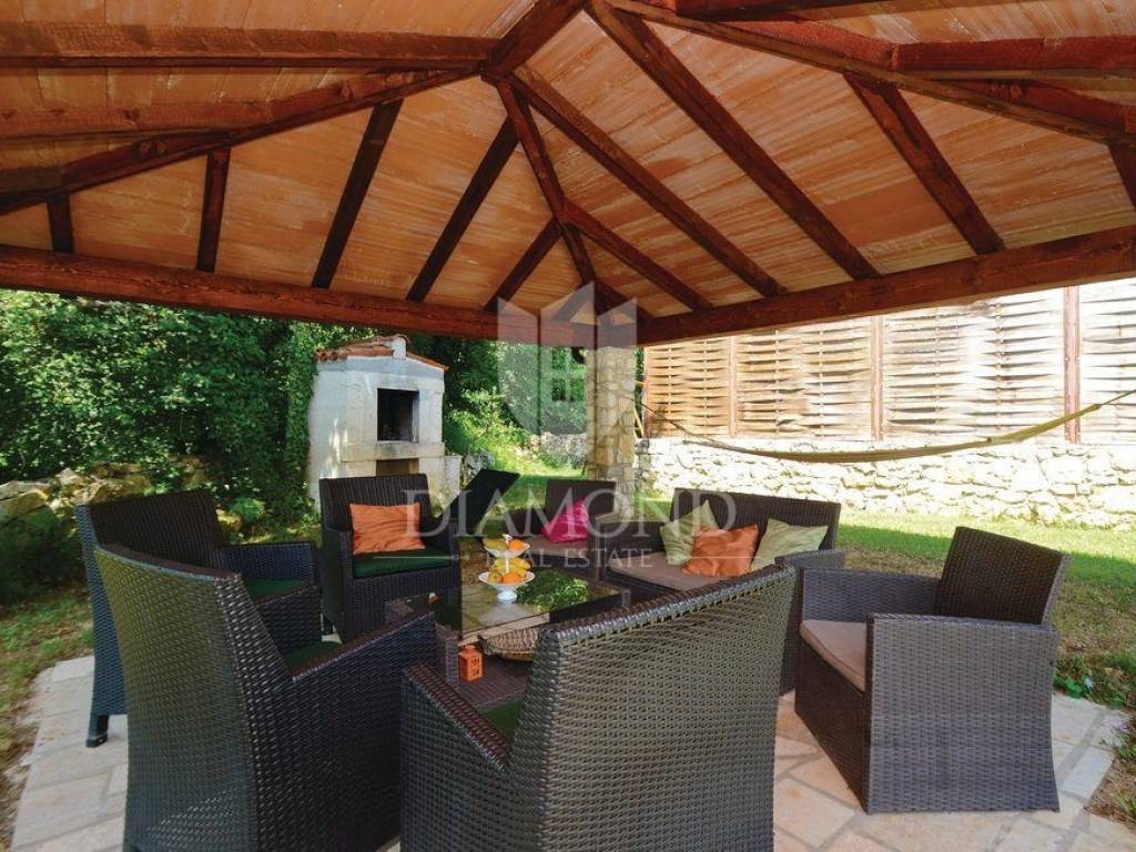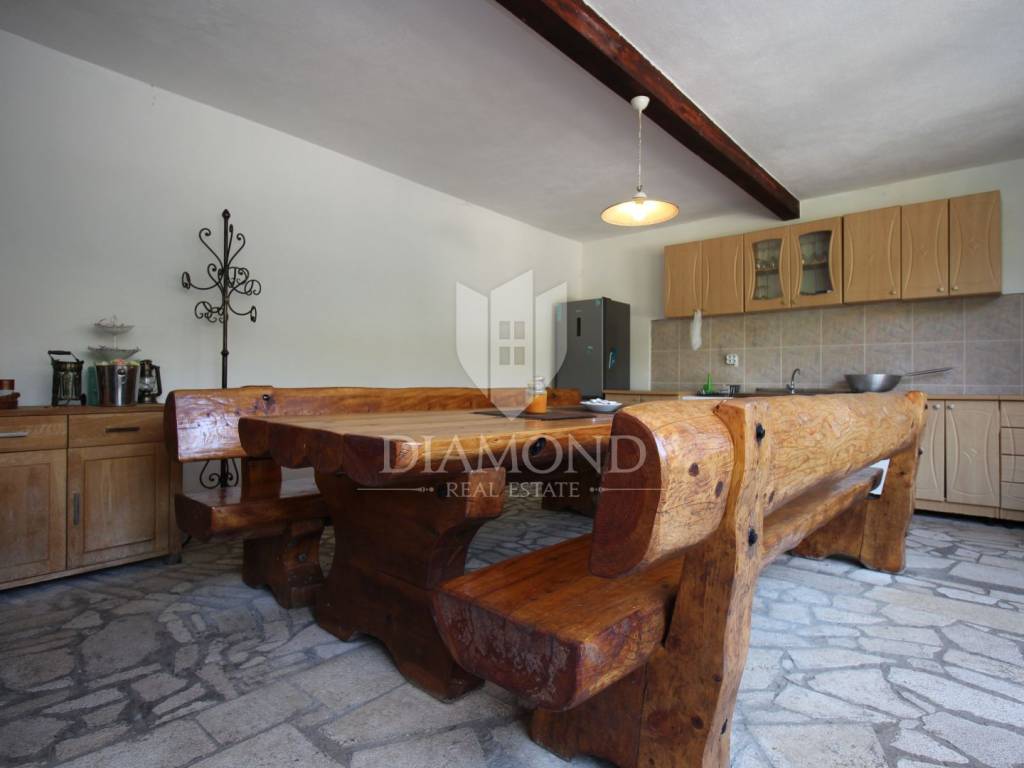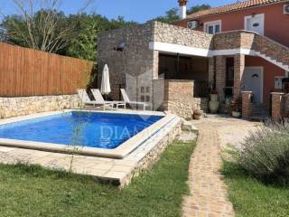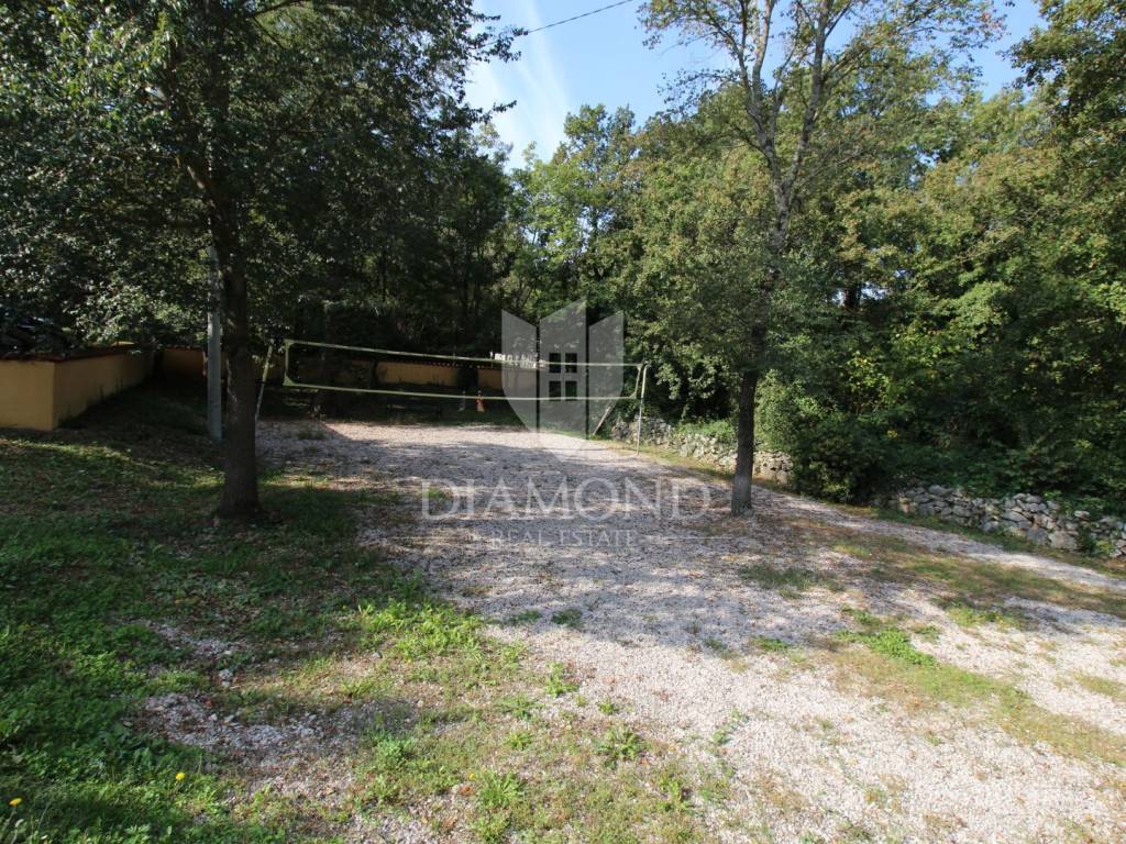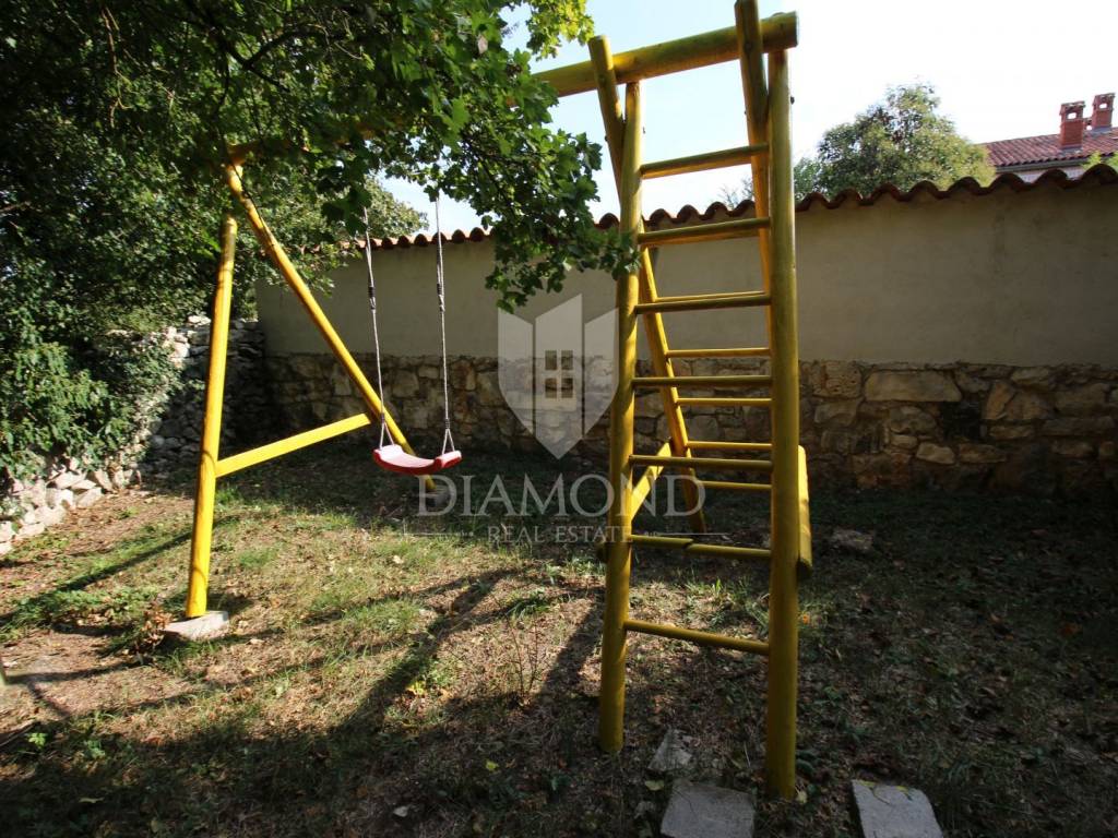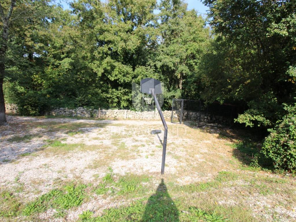 Labin, surroundings, house with swimming pool in a quiet location. Not far from the very center of Labin, there is a property that offers you complete peace and freedom. The house is semi-detached and consists of two floors. The first floor consists of a large open-space area that is intended for an apartment, but is used as a storage room. On the outside, there is a spacious summer kitchen. On the second floor there is a kitchen that is connected to the dining room and living room with access to the terrace, a bathroom, two bedrooms, of which the master bedroom has its own bathroom. The garden has a small children's playground, a volleyball and basketball area, the property is also pet friendly and allows your pets to rest and have fun. There is also a swimming pool with a sunbathing area and a shower, a fireplace and an outdoor space for socializing with the fireplace. The house is located on the edge of the village and is suitable for tourism or year-round family life.