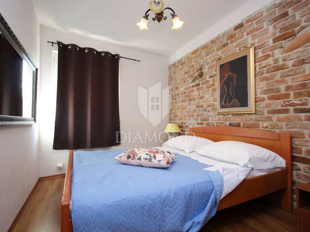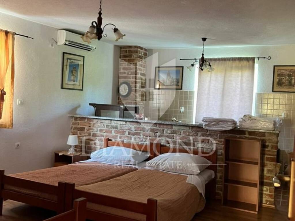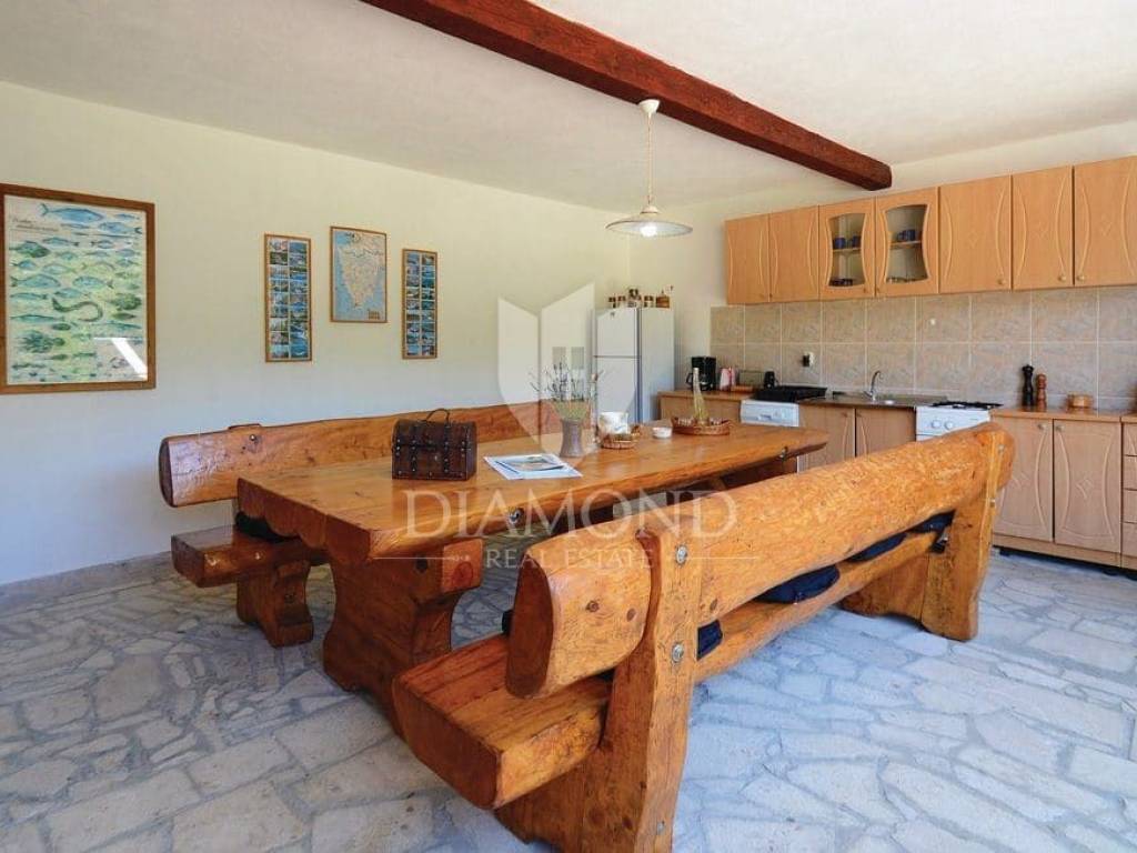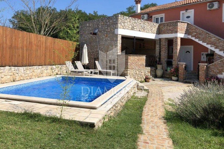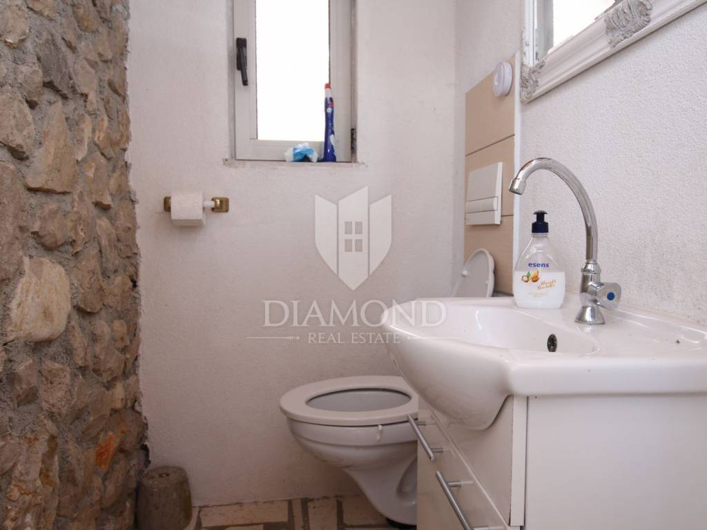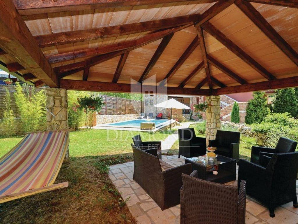 Labin, surroundings, house with swimming pool in a quiet location. Not far from the very center of Labin, there is a property that offers you complete peace and freedom. The house is semi-detached and consists of two floors. The first floor consists of a large open-space area that is intended for an apartment, but is used as a storage room. On the outside, there is a spacious summer kitchen. On the second floor there is a kitchen that is connected to the dining room and living room with access to the terrace, a bathroom, two bedrooms, of which the master bedroom has its own bathroom. The garden has a small children's playground, a volleyball and basketball area, the property is also pet friendly and allows your pets to rest and have fun. There is also a swimming pool with a sunbathing area and a shower, a fireplace and an outdoor space for socializing with the fireplace. The house is located on the edge of the village and is suitable for tourism or year-round family life.
