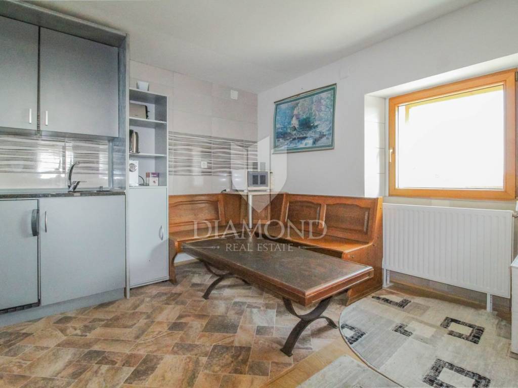 The apartment is located in a stone Istrian house, and extends to the 2nd floor and attic, and the area of the apartment is 70 m2. On the 2nd floor there is a living room with a kitchen and dining room, a bathroom, a bedroom, and the internal stairs lead to the mansard, where there is a small space that leads to the terrace with a wonderful open view of the sea and greenery, and on sunny days you can see and the Alps. The apartment is heated with an air conditioner.