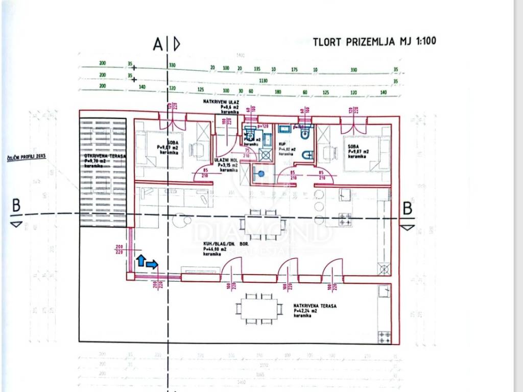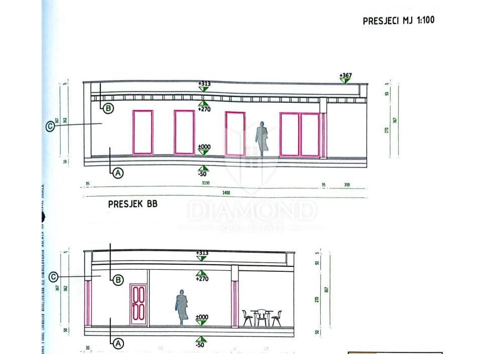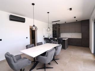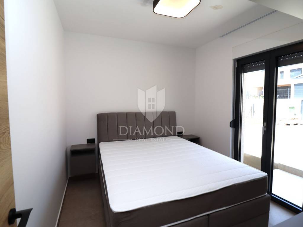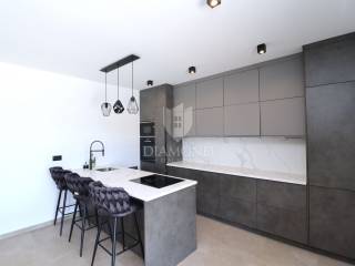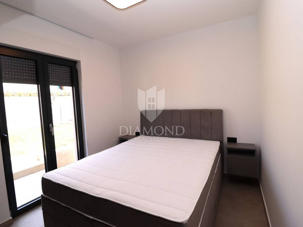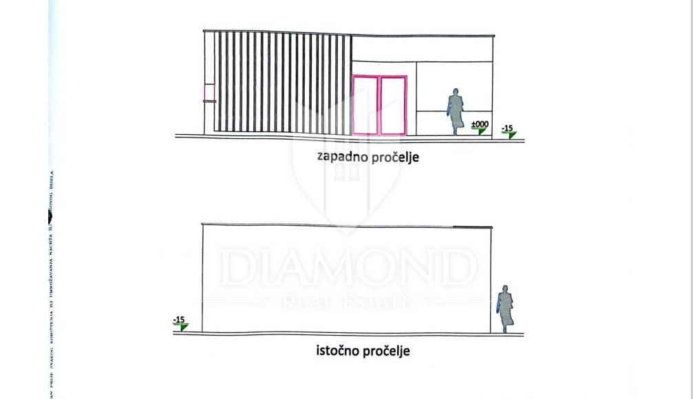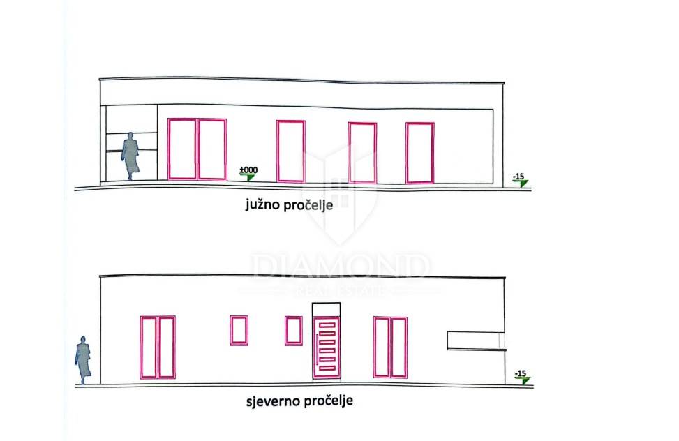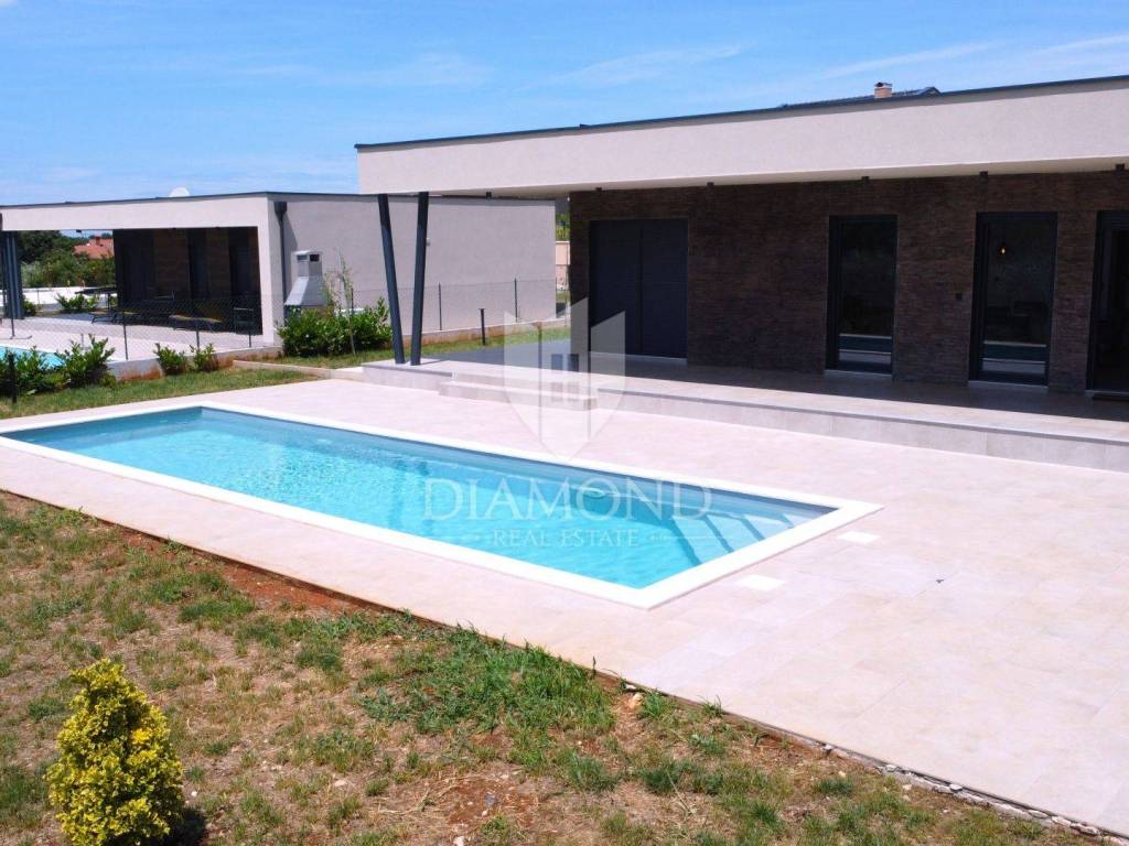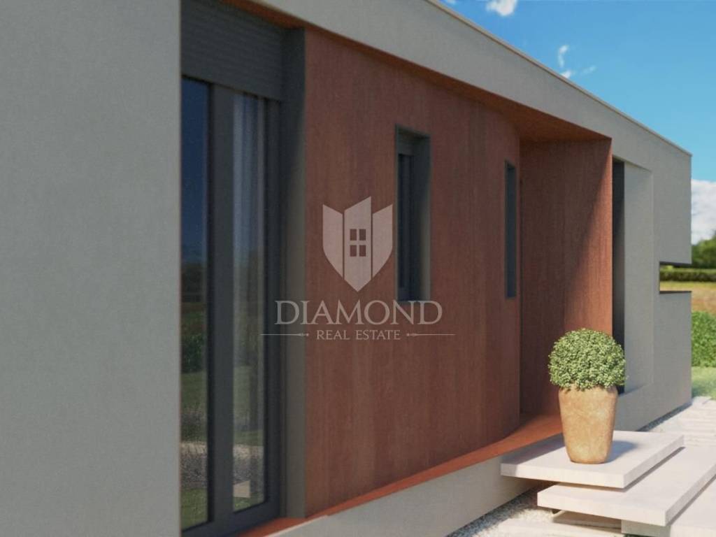 In a quiet place on the outskirts of the city of Poreč, just 18 km from the first beaches, there is a one-story house with a swimming pool. Its total size is 98.11 m2 and consists of a spacious living room, kitchen and dining room according to the open space concept, toilet, two bedrooms, one of which has its own bathroom. The living room and dining room lead directly to the covered terrace where there is a sundeck with a swimming pool. Glass walls have been installed throughout the entire living room and dining room, which allow a large influx of sunlight, which gives the space itself a large source of light. The size of the pool is 30 m2. The ground floor is located on the edge of the urban area and has a beautiful view of the nature that surrounds it. The heating of the house will be made possible through air conditioners, which are also used for cooling on hot summer days. The garden in front of the house will be planted and decorated with Mediterranean plants, and the central place in the garden is occupied by a large swimming pool with a sunbathing area that allows full enjoyment on hot summer days. Not far from the village there are restaurants, a school and a kindergarten, a post office, a shop, a church and paths for a pleasant walk in nature. Due to its location and complete equipment, this property is an ideal investment for family life.