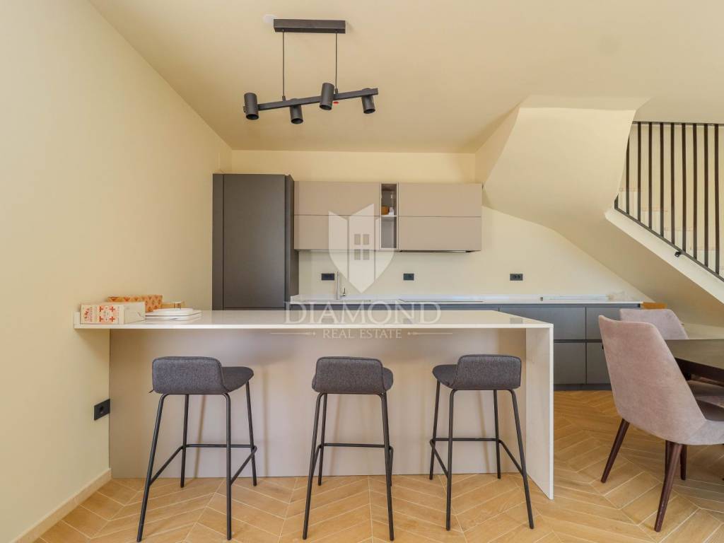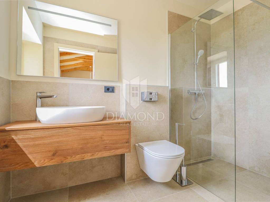 The villa is located on a plot of land of 700 m2, and the total area of the villa is 137 m2. This beautiful villa extends over two floors. On the ground floor there is a large living room with an open kitchen and dining room, a bathroom and a storage room. From the living room you can access the terrace from which you can access the garden with a particularly beautiful panoramic view of the sea and greenery. There is a summer kitchen and a beautiful swimming pool with a sunbathing area on the landscaped garden. The first floor is accessed by internal stairs, where there are 3 bedrooms, each with its own bathroom and a terrace. The villa was built in the Istrian style from top quality materials with high ceilings, PVC carpentry and aluminum shutters, as well as stone and wood details. The underfloor heating is via a heat pump, and the cooling is via an air conditioner.