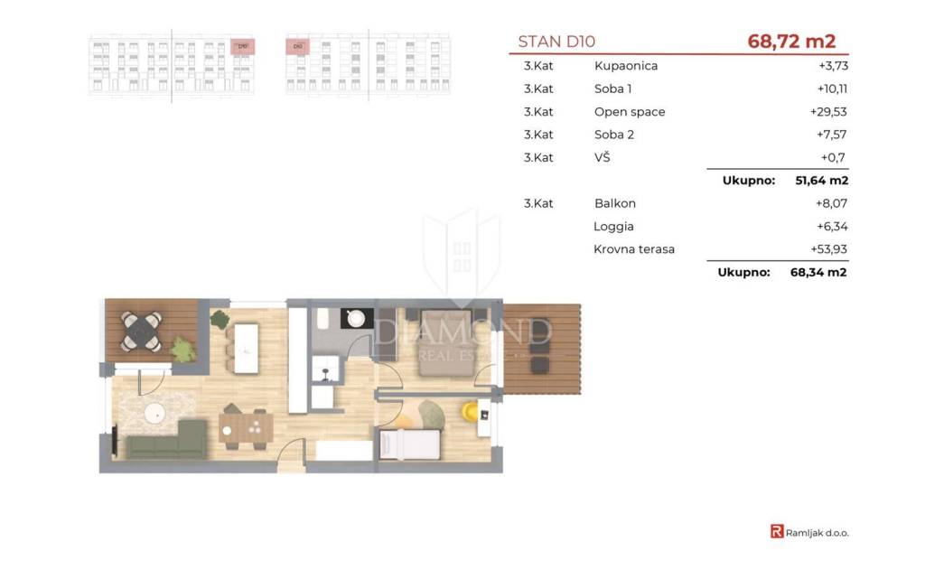 The apartment on the second floor, with a surface area of 73.15 m², consists of a spacious living room connected to the kitchen and dining area, two bedrooms, and a bathroom. It features a balcony with a sea view, while the loggia overlooks the surrounding nature.