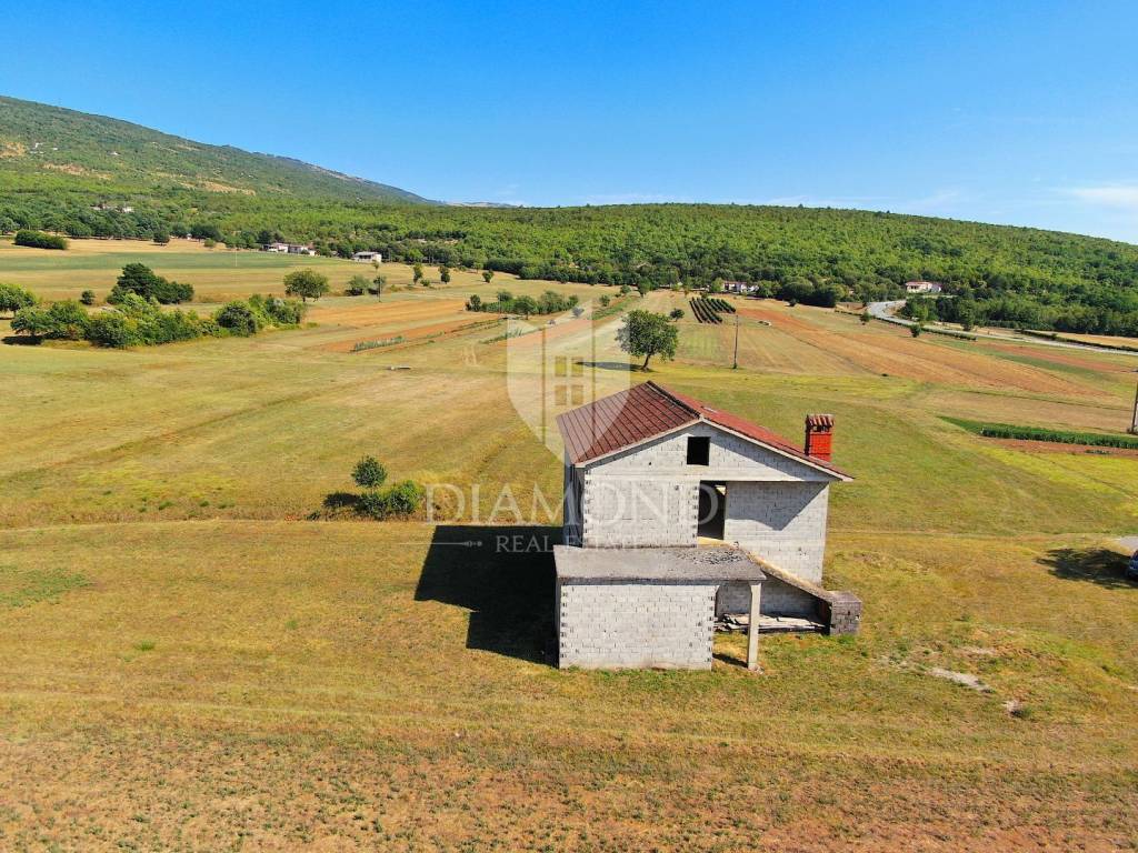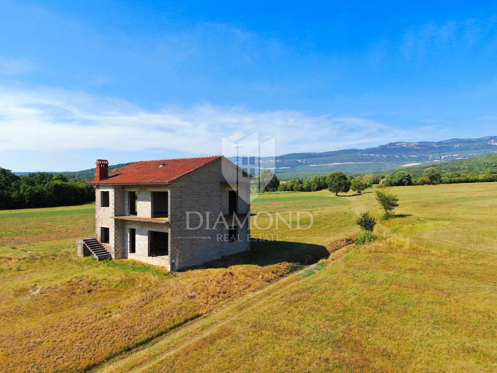 In a small town near Boljun, we are selling a house under construction in a quiet location with a beautiful view of the surrounding landscape. The house has a total square footage of 134 m2 and was originally designed as a commercial building with an inn and bedrooms, although it can easily be converted into a family home or a vacation home. It is sold in an unfinished phase with water and electricity infrastructure supplied to the plot. It is located on a flat plot of 1457 m2, which offers enough space to build a swimming pool, summer kitchen and additional necessary facilities. The plot offers a beautiful unobstructed view of the surrounding nature and hilly landscape, and it is ideally located, near a road with a well-maintained access road. It is only a 30-minute drive to the city of Rijeka and the same time to the city of Labin. The town offers numerous Istrian taverns and restaurants with local specialties, family farms with local ingredients, and a handful of trails for hiking and sports. After completion, the property represents a good opportunity for tourism as a holiday home with a swimming pool in a peaceful oasis of green Istria. In addition, we can also imagine it as a beautiful family house in a quiet location close to the facilities necessary for a permanent life.
