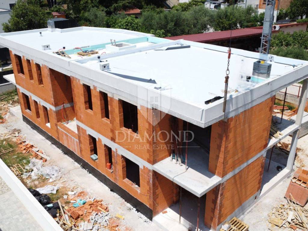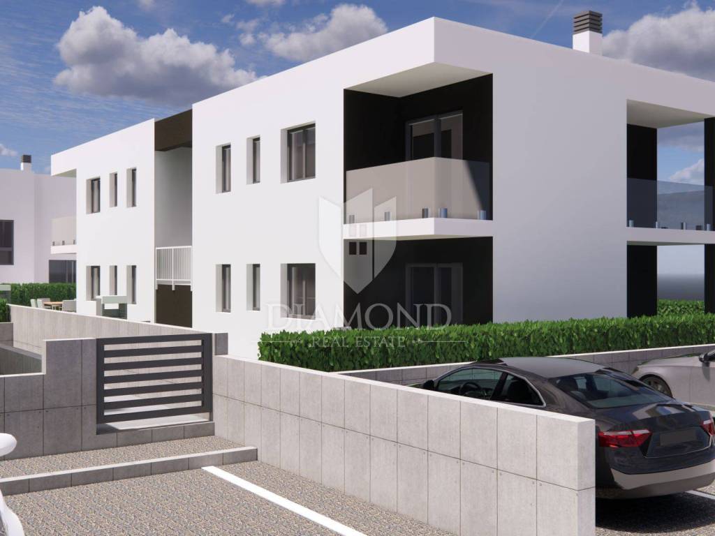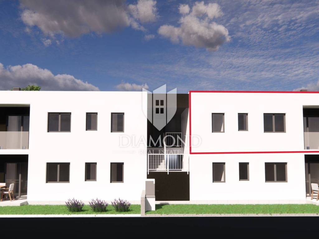 Poreč, excellent apartment on the first floor, 1.5 km from the sea! In the immediate vicinity of the city center of Poreč is this modern building under construction with 4 residential units. The building is located in an attractive location a few minutes' drive from the first beautiful beaches and the city center. The apartment is for sale on the first floor and its area is 67.15 m2. The apartment consists of an entrance hall, a kitchen with a dining area and a living room in one unit, two bedrooms, one of which has access to its own terrace and a bathroom. The living area also has access to a covered terrace. The apartment has one parking space, and there is the option of purchasing another parking space for an additional fee. The apartment will be heated and cooled by fan coil units on a heat pump, and electric underfloor heating will be installed in the bathroom. The floor coverings will be made of high-quality Italian ceramics, and at this stage of construction the future buyer can participate in choosing them. Aluminum electric shutters in anthracite color will be installed on all openings, and the insulation will be 10 cm thick. The planned completion of construction is by the end of 2025. The property is subject to VAT and the price is displayed with VAT. The property can be an ideal investment for family life as well as for tourist rent.