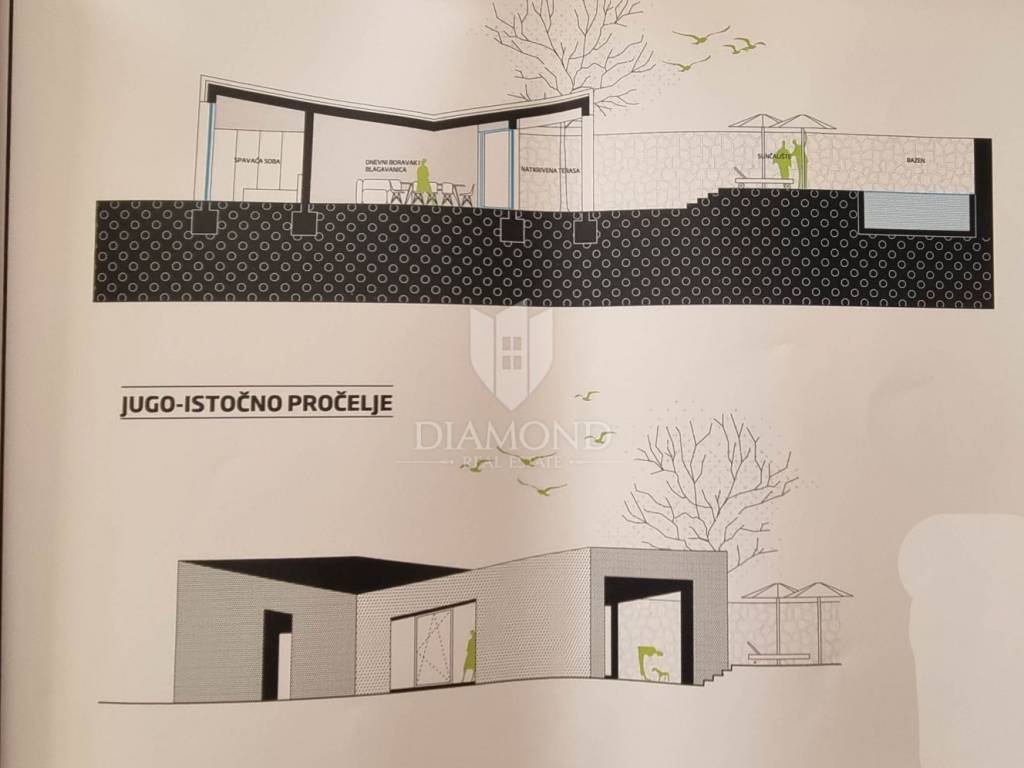 Za zemljište je već ishodovana građevinska dozvola za prizemnicu modernog koncepta s dvije spavaće sobe i prozračnim dnevnim dijelom otvorenog tipa u kojem se prirodno stapaju kuhinja i blagovaonica. Projekt uključuje i bazen, čime se dodatno naglašava ideja odmora, komfora i života u mediteranskom ambijentu.