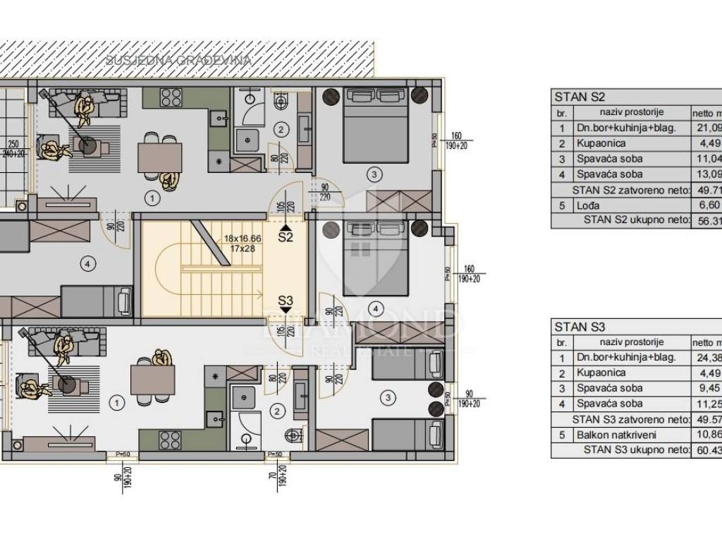 An apartment on the first floor with a total area of 55 m2 is for sale. The apartment consists of: two bedrooms, a bathroom, a kitchen with a dining room and a living room with access to a balcony. The apartment is equipped with: three-layer PVC windows with mosquito nets and electric shutters, underfloor heating in the bathroom, air conditioning for cooling and heating. The apartment has one parking space, which is charged additionally, and there is also the option of purchasing a garage space. The price of the apartment includes a storage room.
