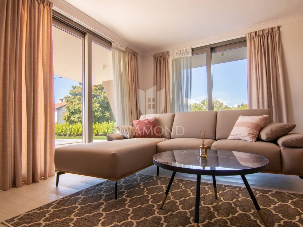 The garden includes a swimming pool with a sunbathing area, while the terrace provides a seamless connection between indoor and outdoor living.