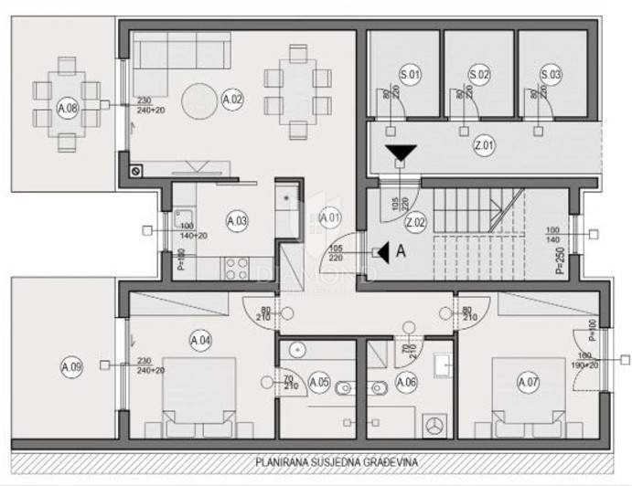 This apartment is located on the ground floor of the building. It consists of a spacious living room with a dining room and access to the terrace, a separate kitchen and bathroom, and below, two bedrooms, one of which has its own bathroom and access to the terrace and garden. The apartment comes with two parking spaces as well as a storage room on the ground floor of the building. The total square footage is 93.66m2.