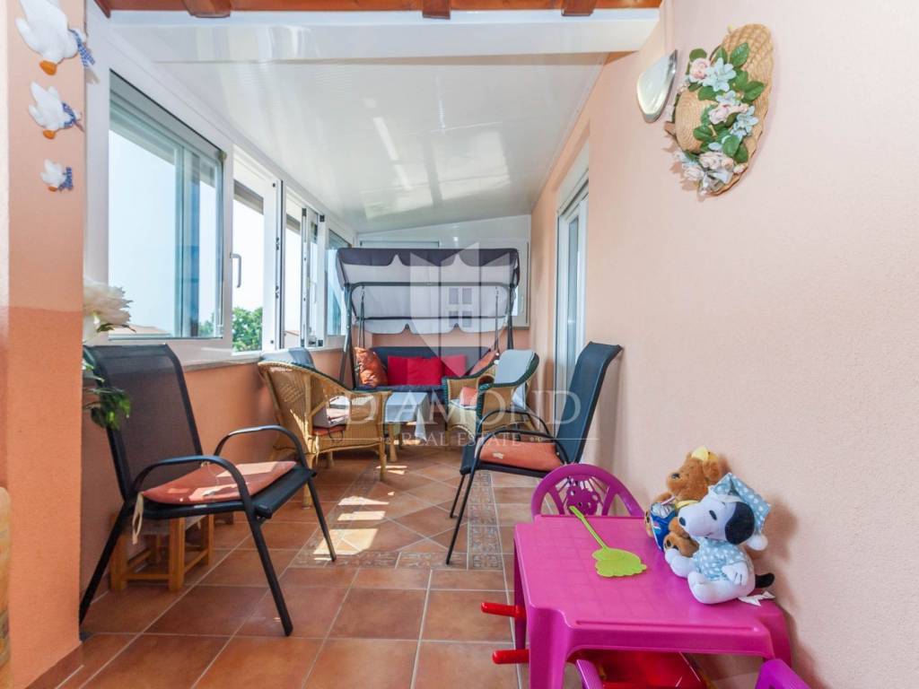 The apartment has a large living room and an open space kitchen, 3 bedrooms, bathroom and toilet, hallway and large terraces offering panoramic sea views. The apartment has a fireplace with pellets for heating and air conditioning.
