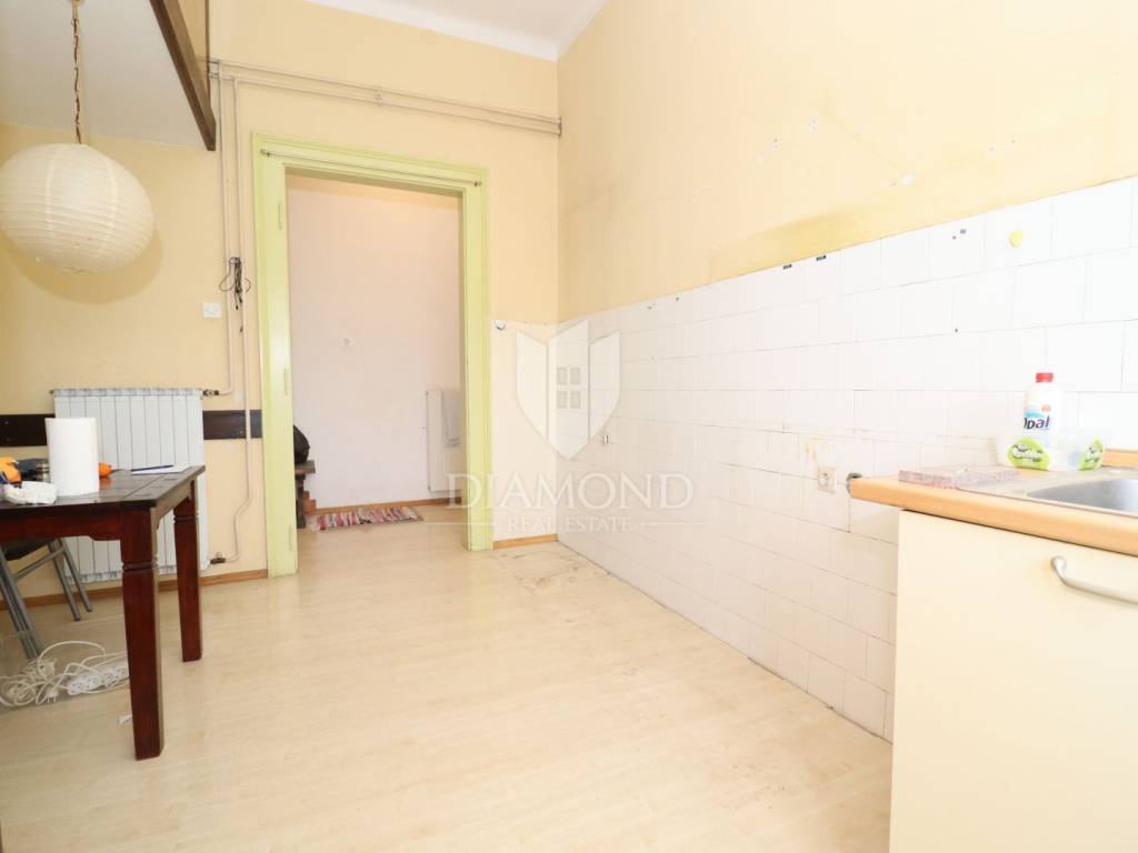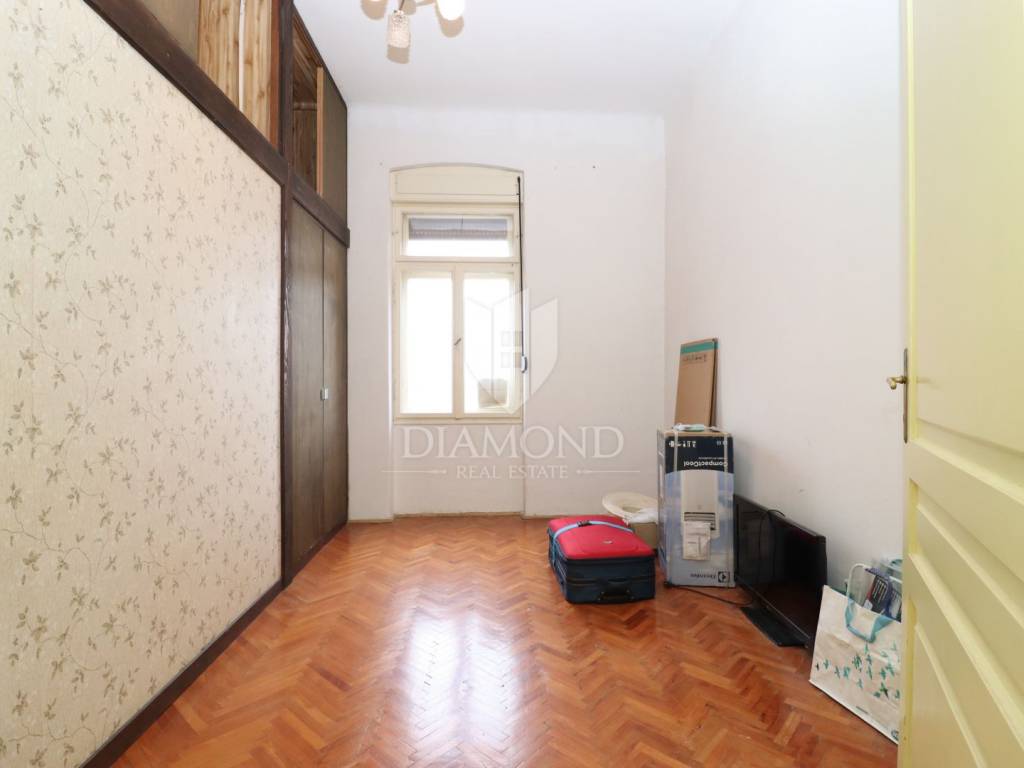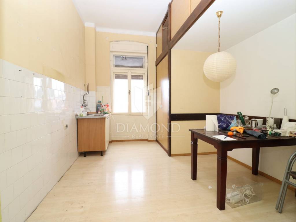 The apartment requires complete renovation, which represents a significant advantage, as it allows full customization according to personal preferences. The space offers exceptional potential thanks to large and spacious rooms, a favorable layout of load-bearing walls enabling various design options, abundant natural light throughout the apartment, impressive ceiling heights of 3.32 meters, and six large windows offering beautiful views of the city and the Zlatni Rt forest park.
