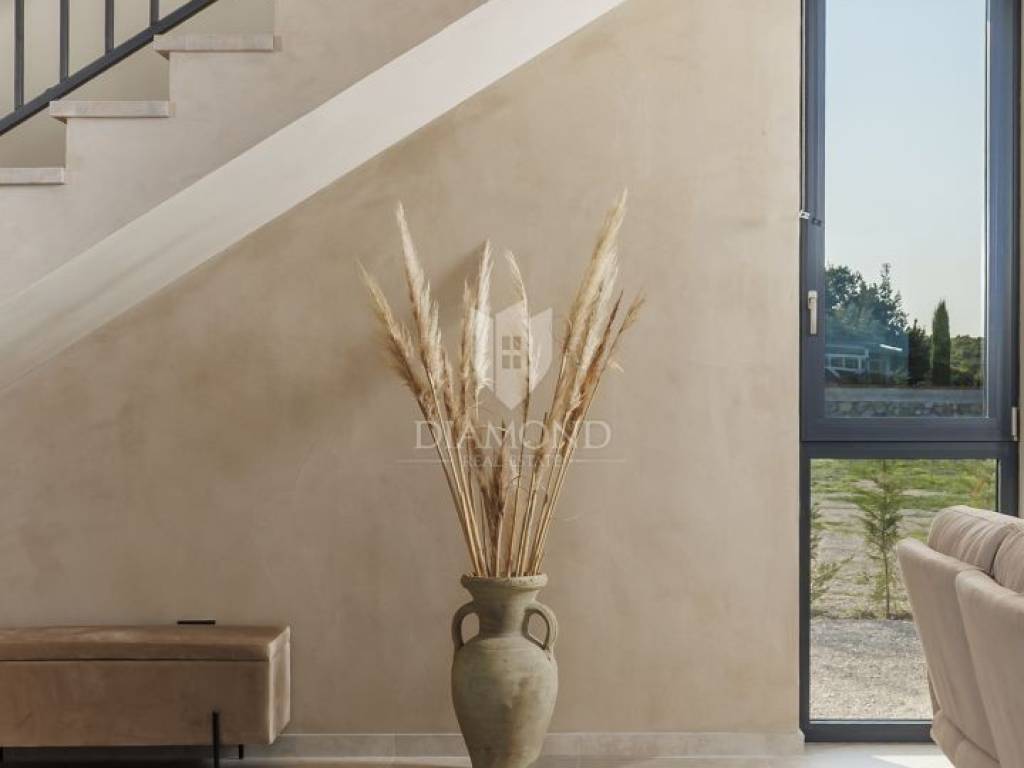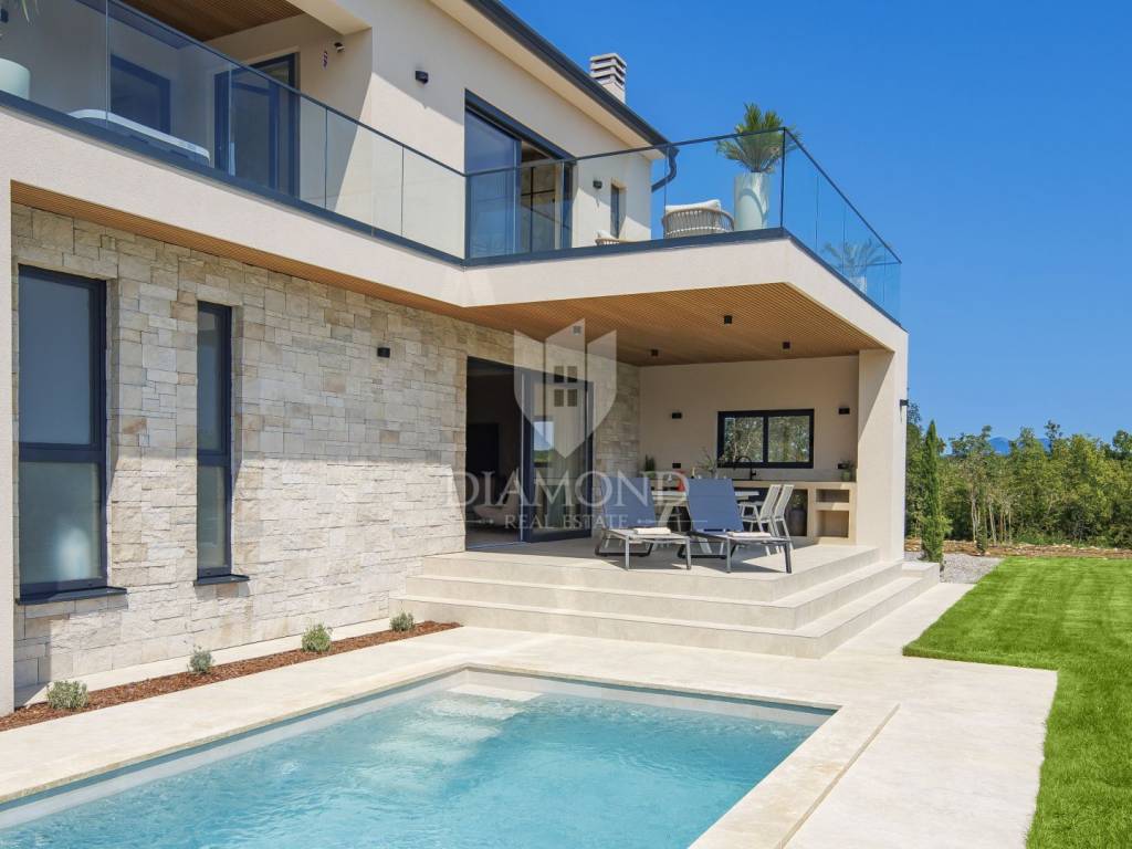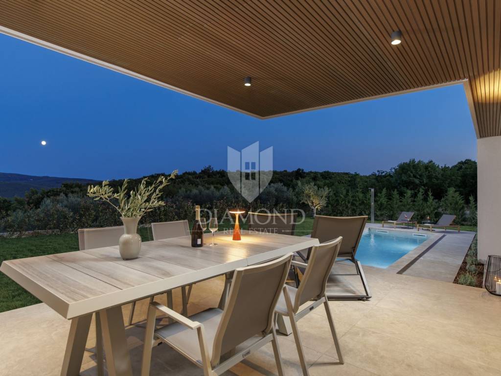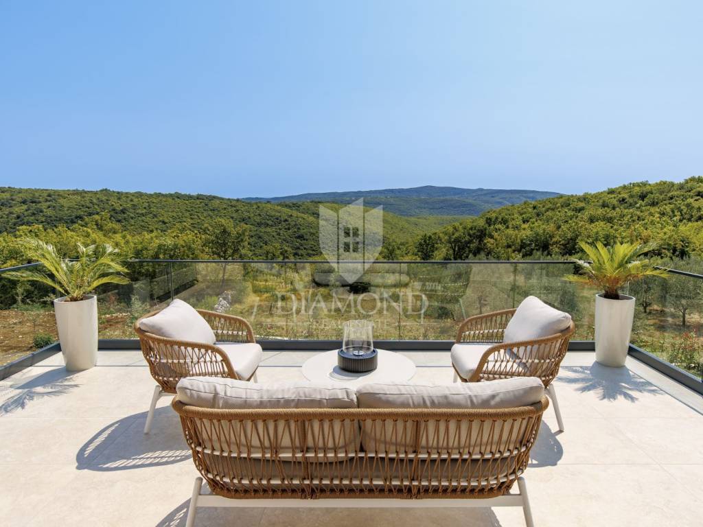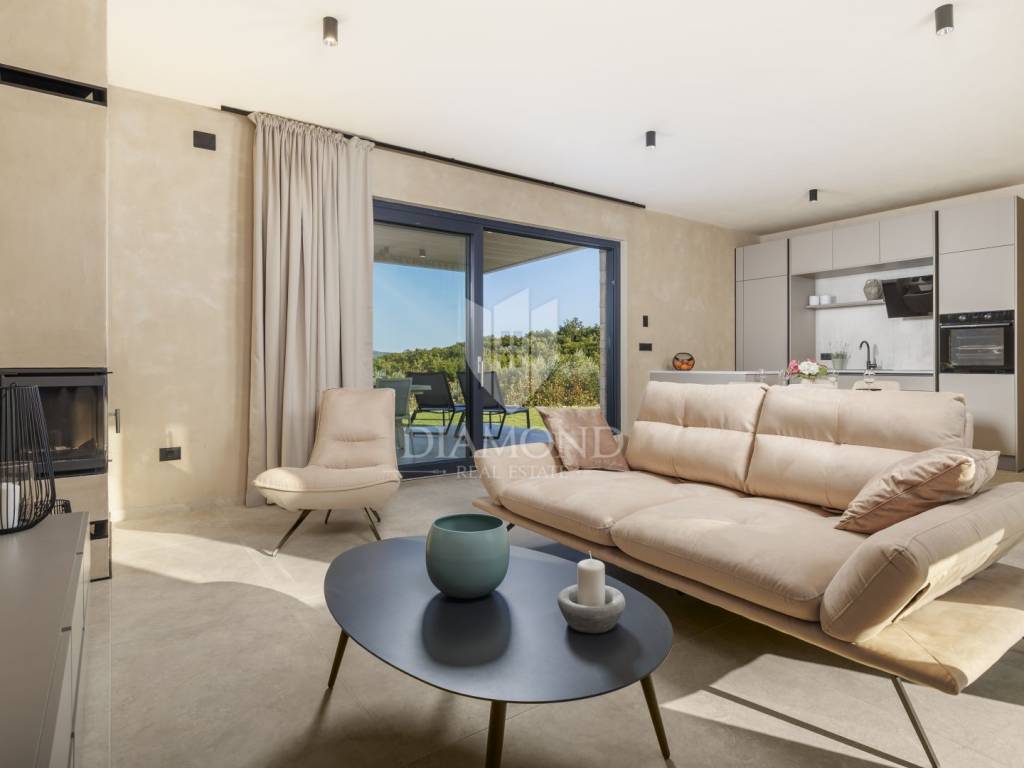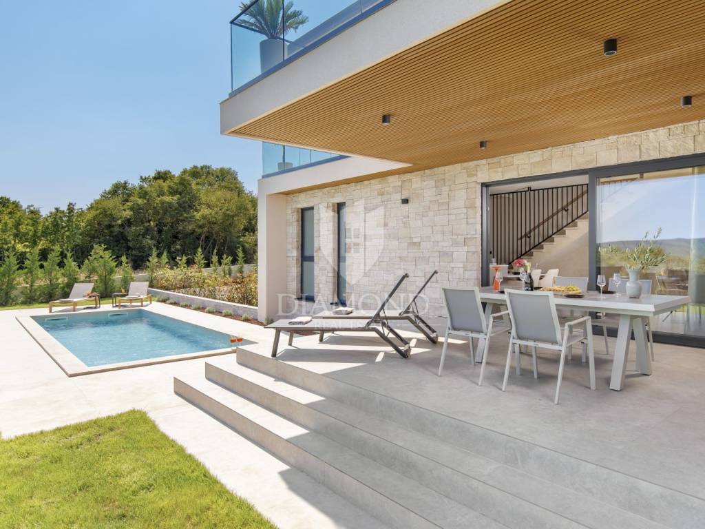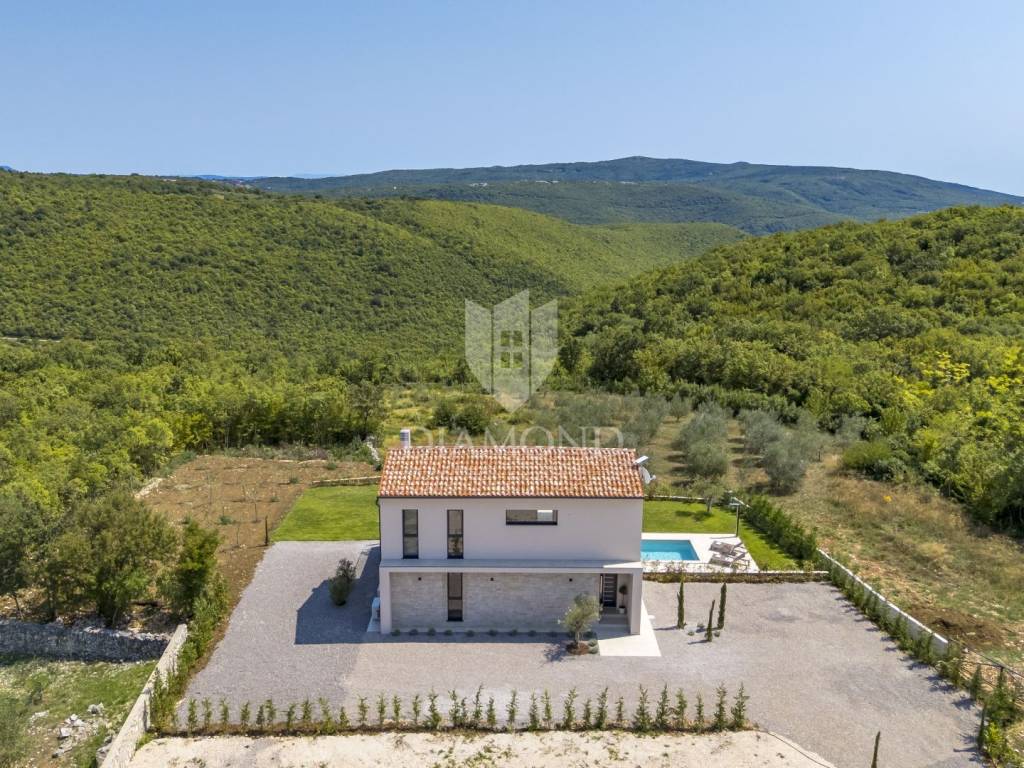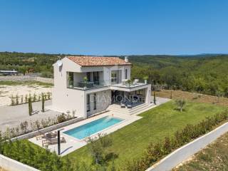 In a quiet area near Labin, a modern house with a swimming pool is for sale, located on the very edge of the village. The location of the property allows you to enjoy the authentic atmosphere of an Istrian town, ensures privacy and peace, while at the same time offering quick access to the sea and all the city amenities of Labin.