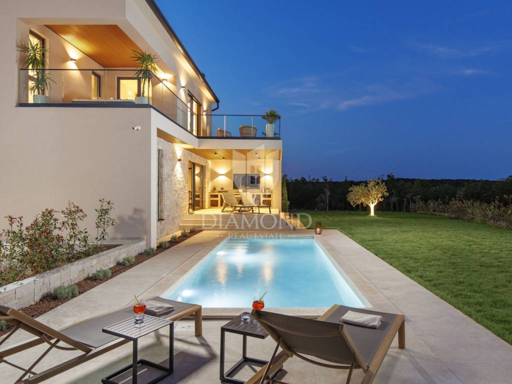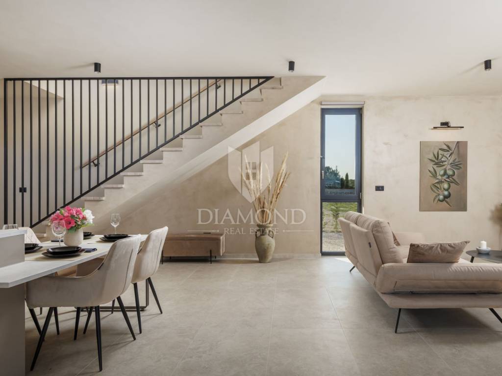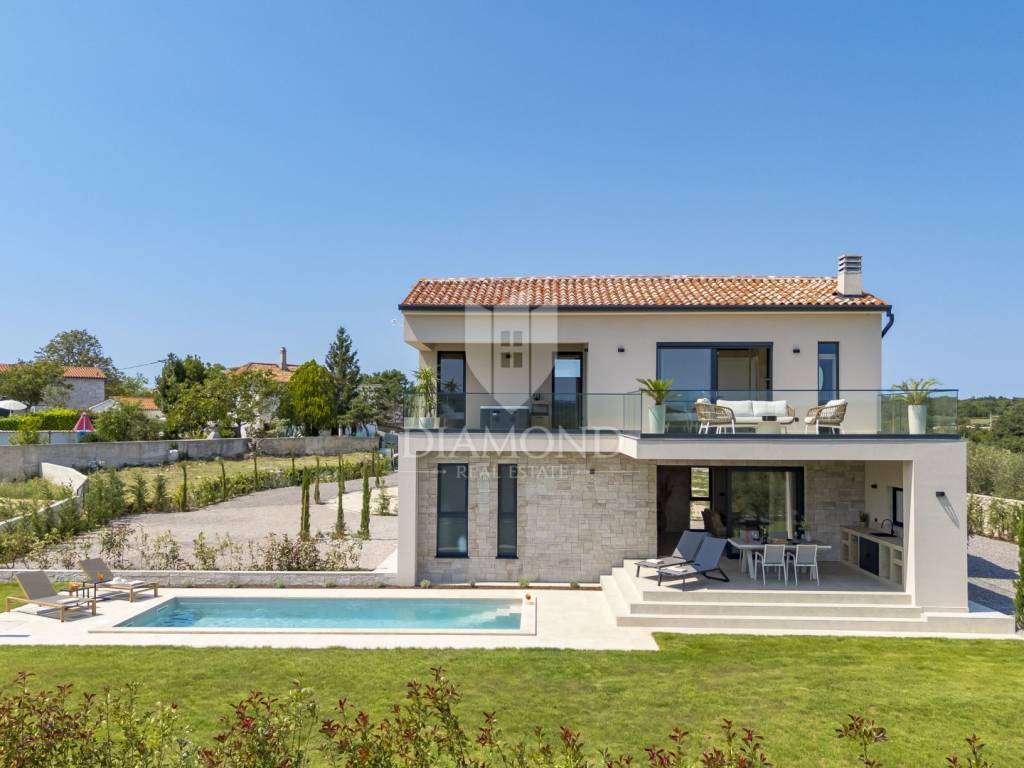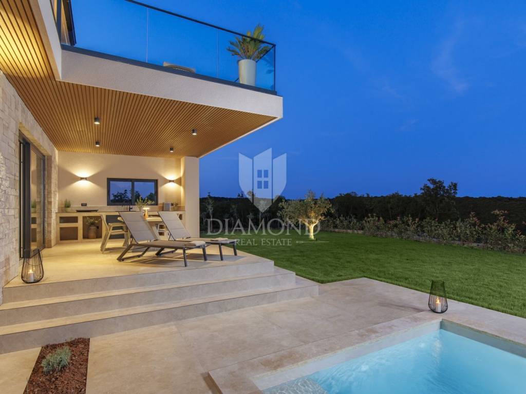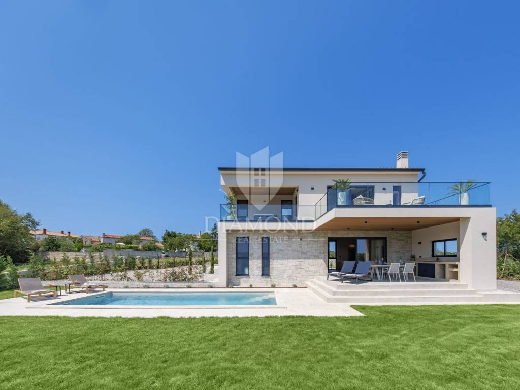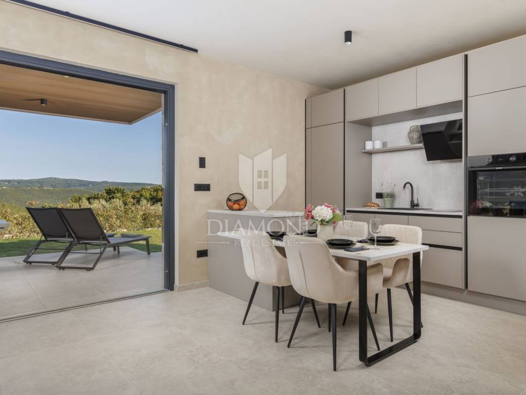 In a quiet area near Labin, a modern house with a swimming pool is for sale, located on the very edge of the village. The location of the property allows you to enjoy the authentic atmosphere of an Istrian town, ensures privacy and peace, while at the same time offering quick access to the sea and all the city amenities of Labin.