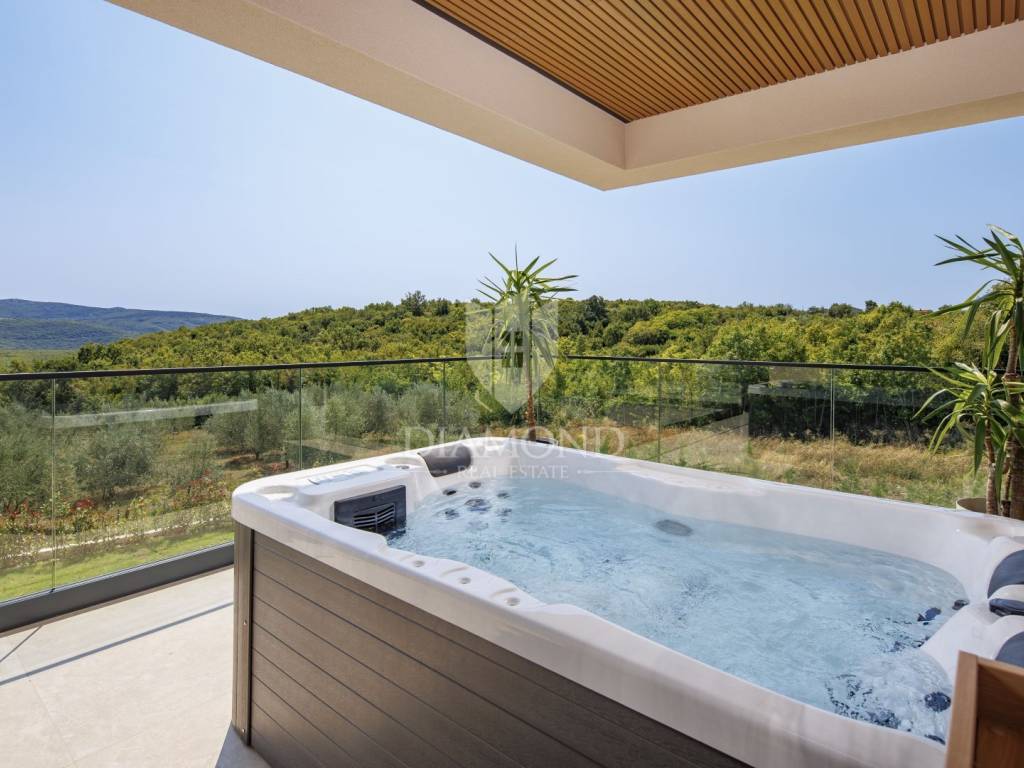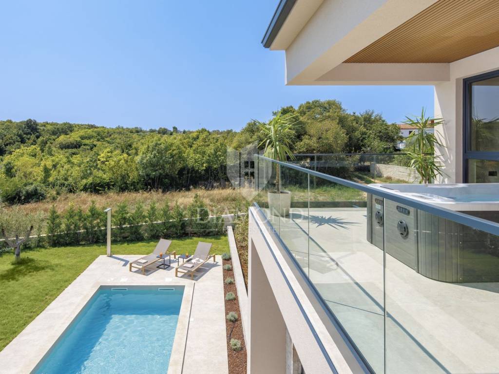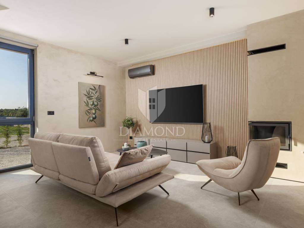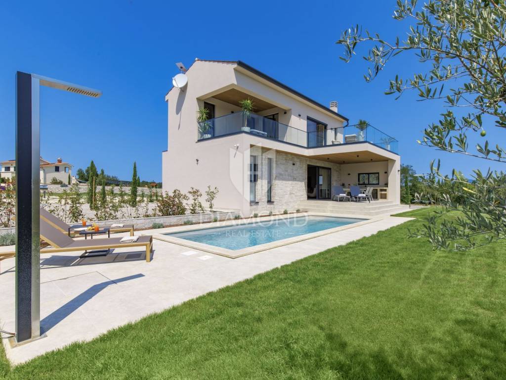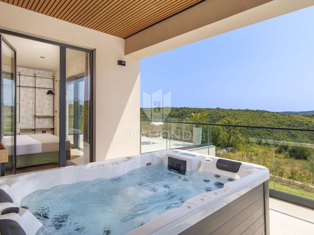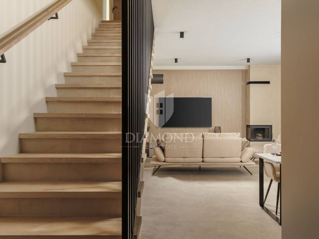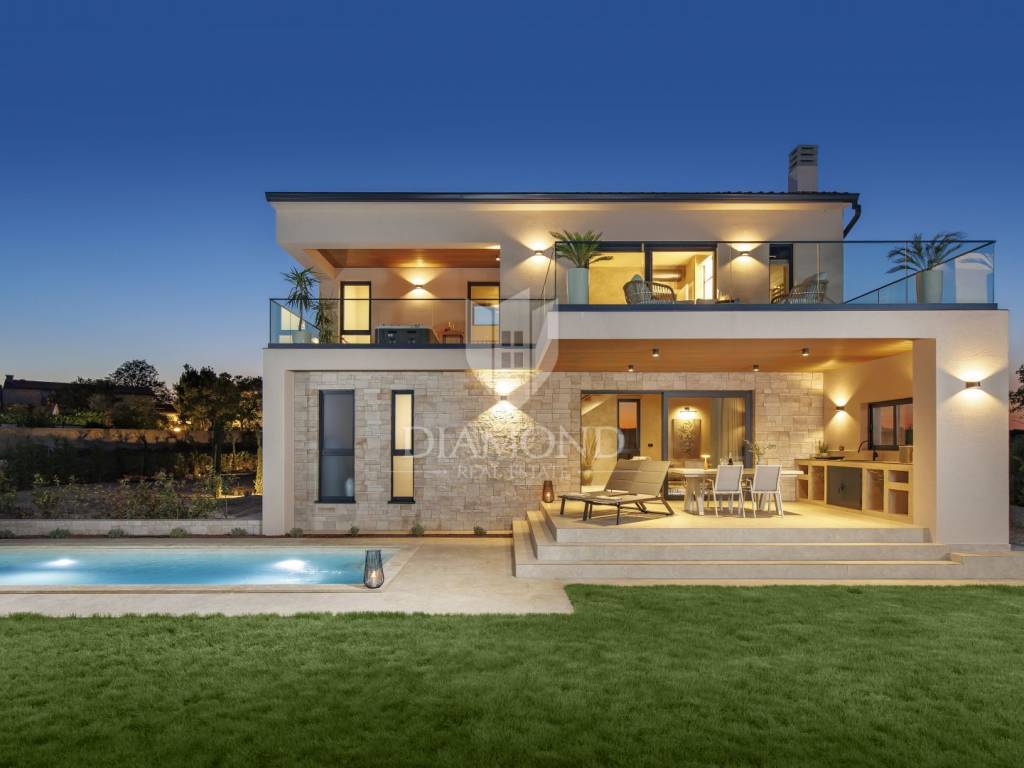 In a quiet area near Labin, a modern house with a swimming pool is for sale, located on the very edge of the village. The location of the property allows you to enjoy the authentic atmosphere of an Istrian town, ensures privacy and peace, while at the same time offering quick access to the sea and all the city amenities of Labin.