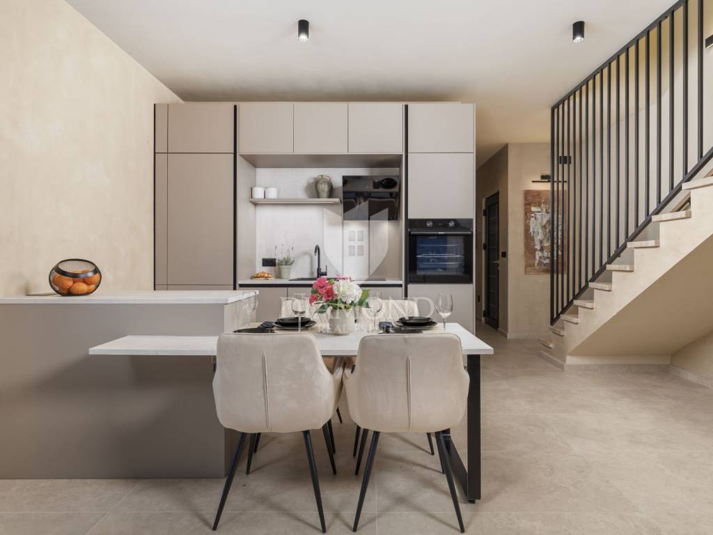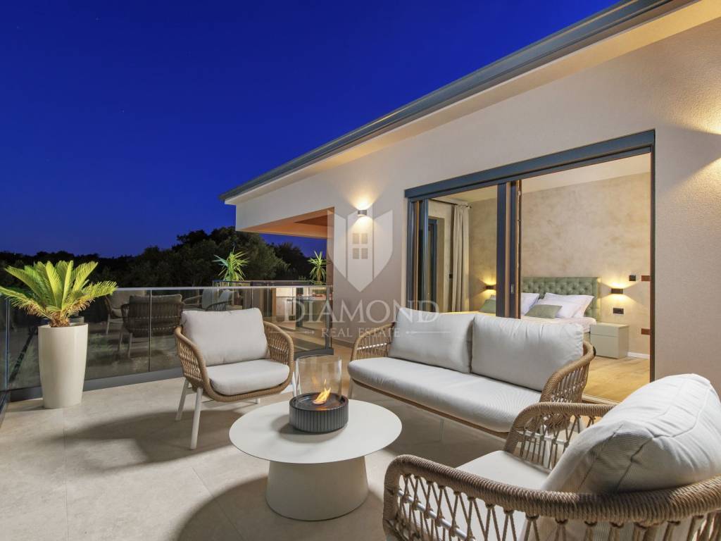 On the ground floor there is an open living area that connects the living room, dining room and kitchen, and from which there is access to a covered terrace equipped with a summer kitchen. On the same floor there is also a bathroom and a technical room. The upper floor includes two bedrooms, with the master bedroom having its own bathroom with a sauna and access to two terraces, one open and one covered with a hot tub.