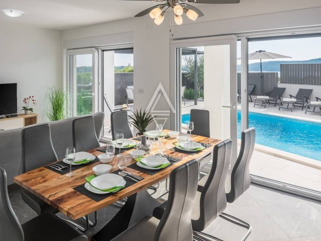 This beautiful holiday house with 260 m2 of living area and garden space of 570 m2, an attractive and modern design is located. It is furnished with quality style furniture and meets the highest standards of contemporary tourism.