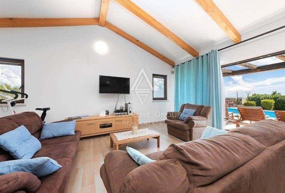 The villa's climate control is efficiently managed through air conditioning units and a cozy solid fuel fireplace in the living space, complemented by solar panel water heating. The garden hosts a 36 sq.m swimming pool with a sun deck, promising unobstructed panoramic views of Višnjan's greenery and the serene olive groves and farmlands that adorn the northwest.