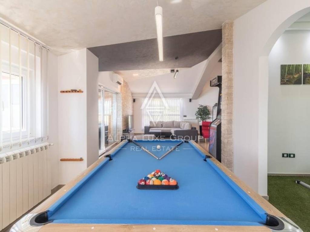 The expansive garden offers ample parking for six to seven vehicles, a spacious swimming pool, a summer kitchen, a children's playground, and a multi-functional sports court, making this house an ideal setting for family life and active relaxation.